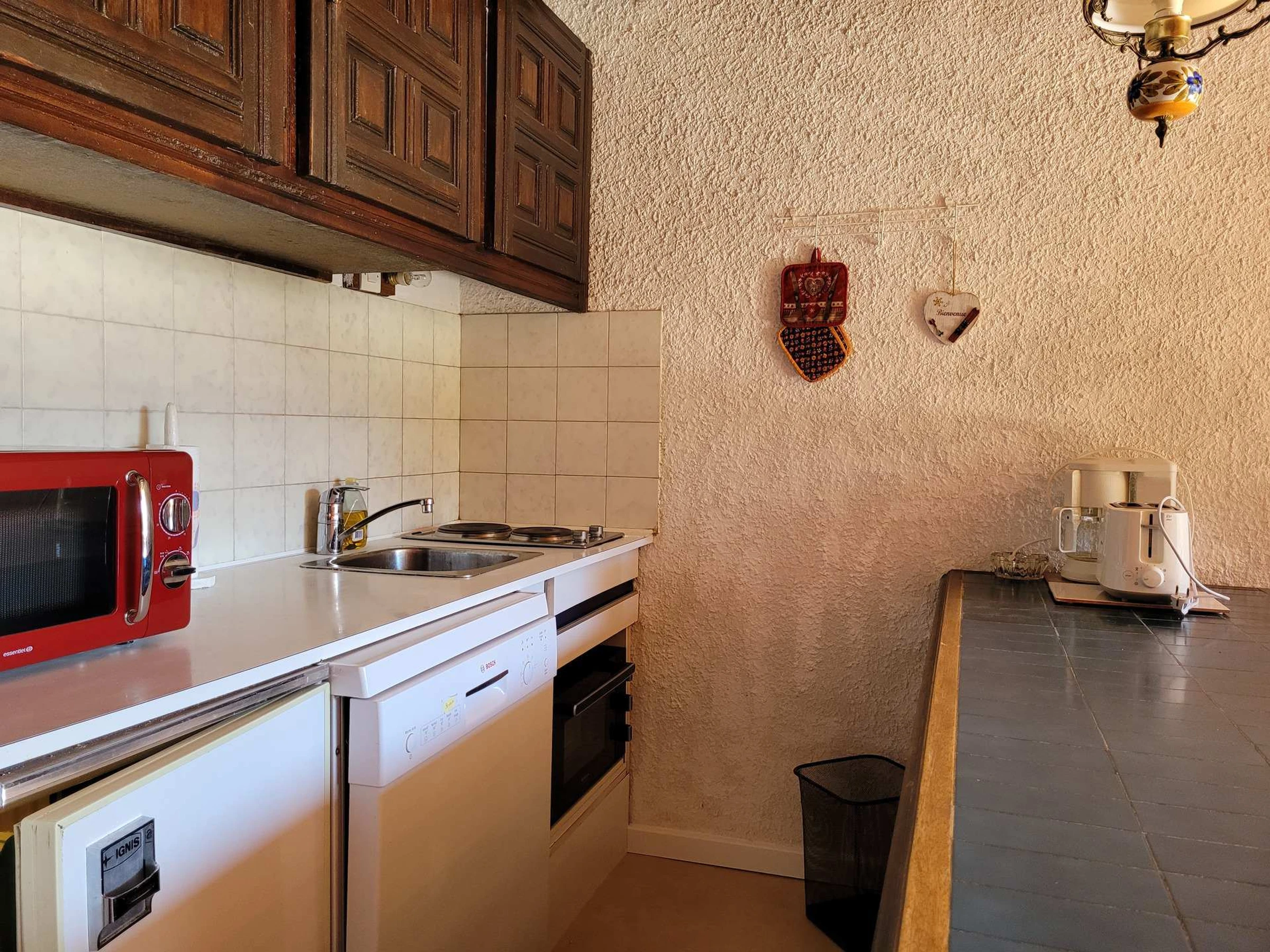 * Küchenbereich: Backofen, Kühlschrank, 2 Kochplatten, Geschirrspüler, Schränke;