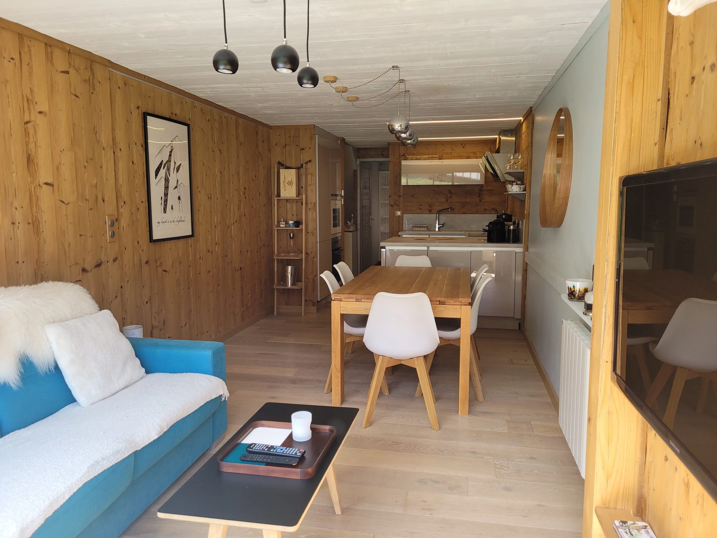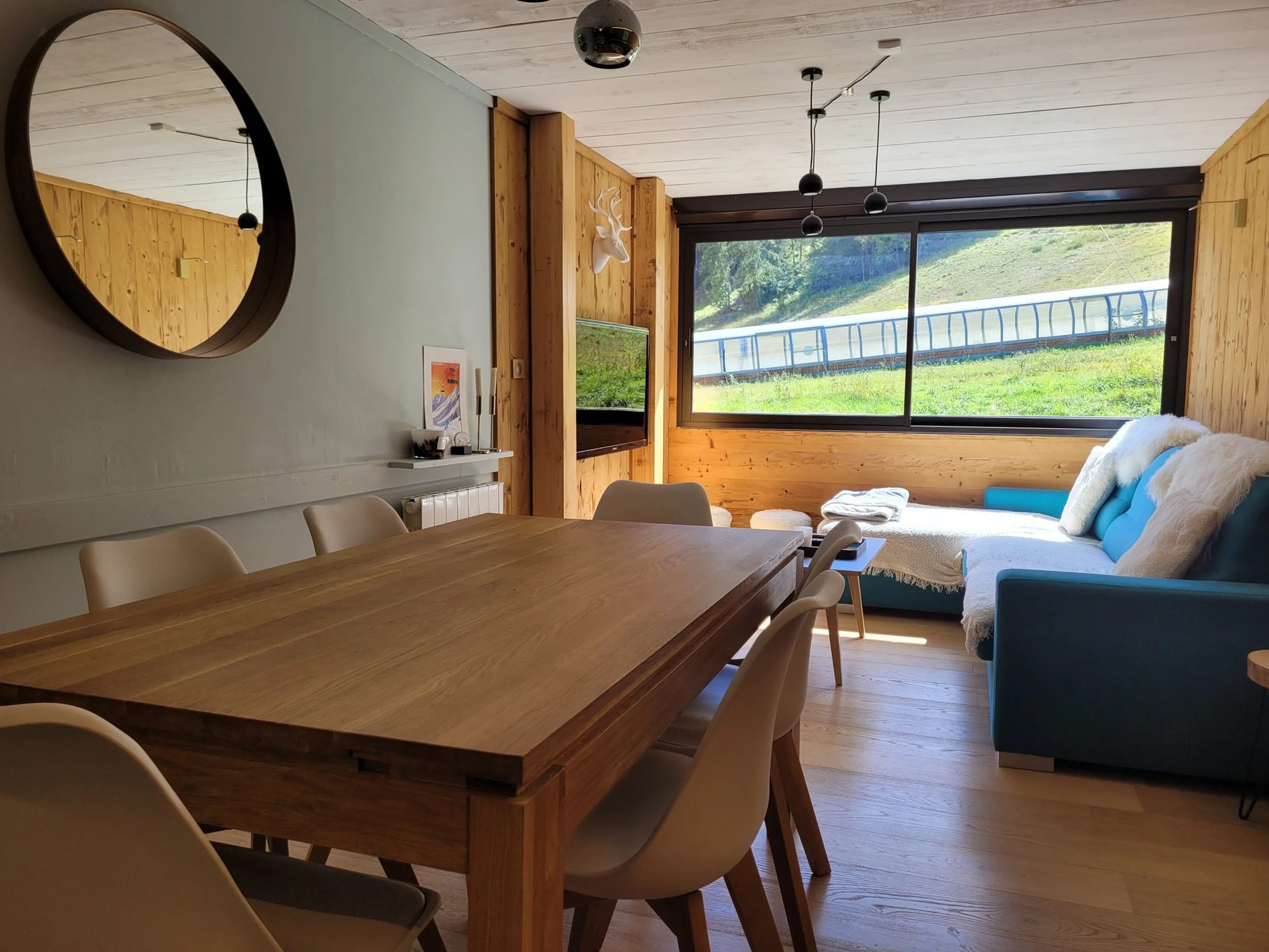 * Wohnzimmer: Attraktive Eckcouch, Wandfernseher, Esstisch, schöner Blick auf die Piste;