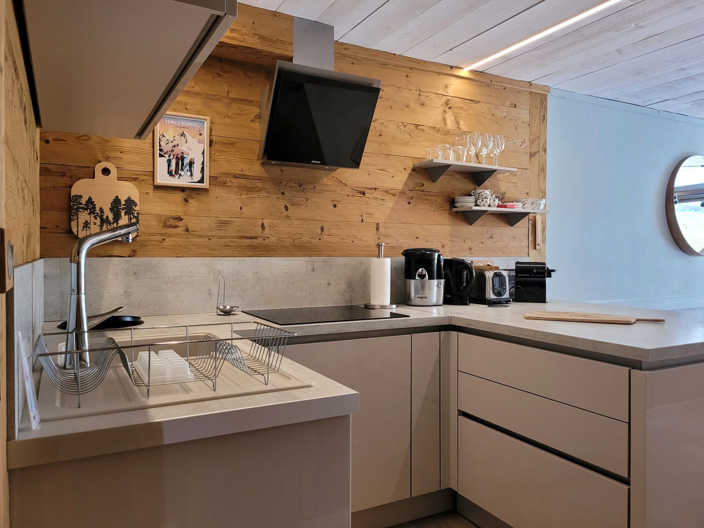 * Moderne, voll ausgestattete offene Küche: Cerankochfeld, Dunstabzugshaube, Kühlschrank, Geschirrspüler, Mikrowelle, Nespresso-Kaffeemaschine, Toaster, Wasserkocher, Entsafter;
