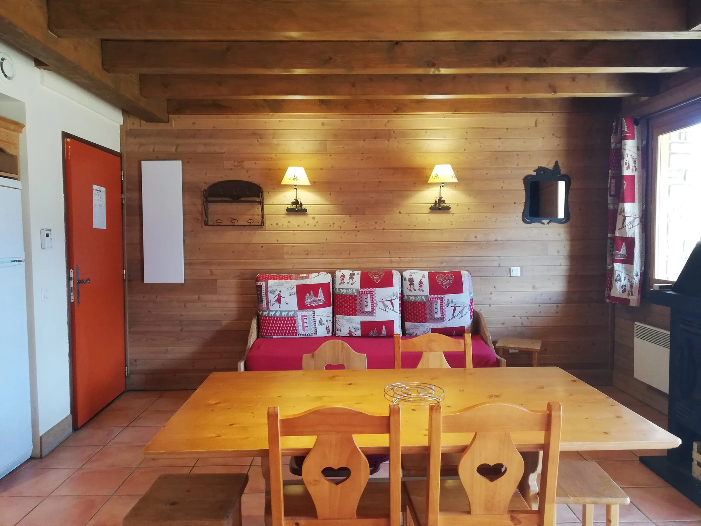 *Wohnzimmer mit Doppelschlafsofa, Decke, HD-TV, Kamin, schönen Holzmöbeln und Zugang zur Terrasse;
