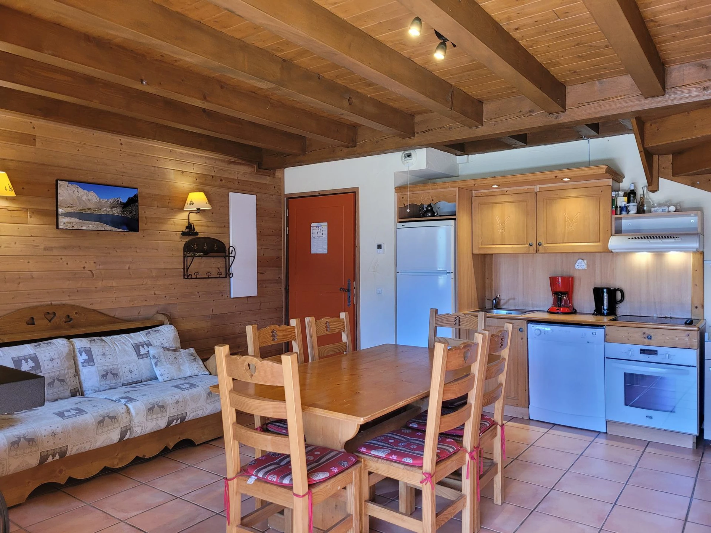 *Wohnzimmer mit Doppelschlafsofa, Bettwäsche, HD-TV, Kamin, schönen Holzmöbeln und Zugang zur Terrasse;