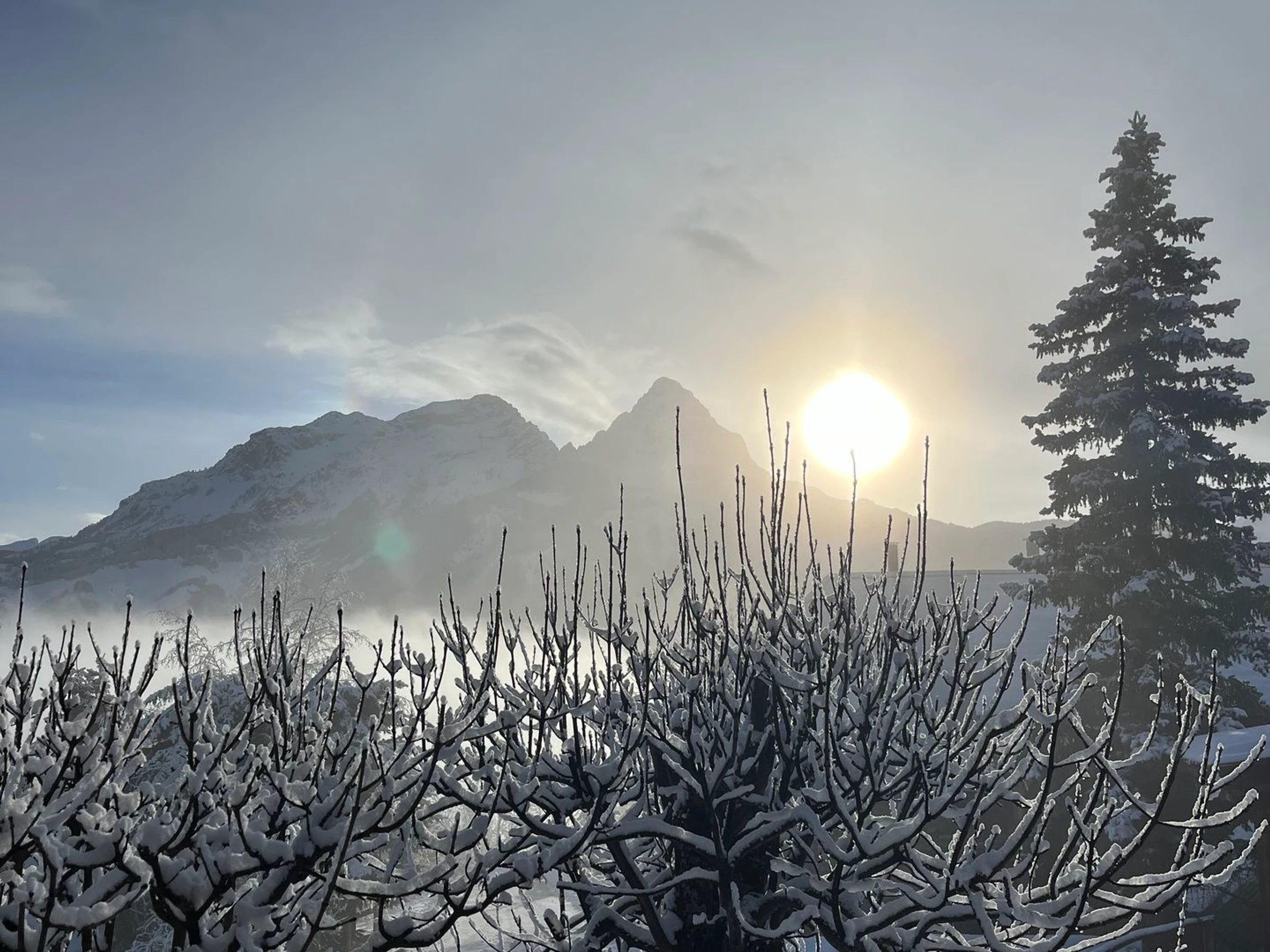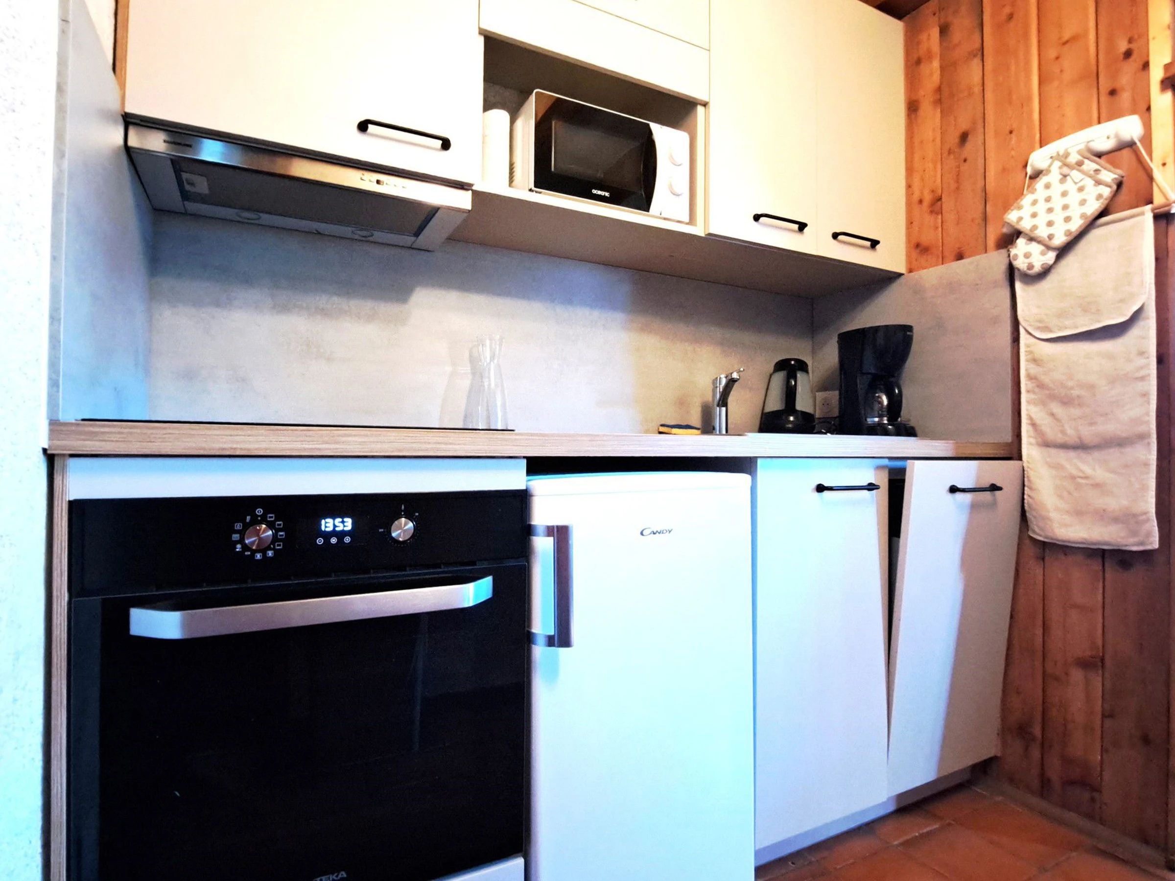 Rechts befindet sich die 2024 renovierte Küche mit Induktionskochfeld, Kühlschrank, Geschirrspüler, Mikrowelle, Backofen, Raclette-Grill und einem Stabmixer für winterliche Suppen und Eintöpfe.
