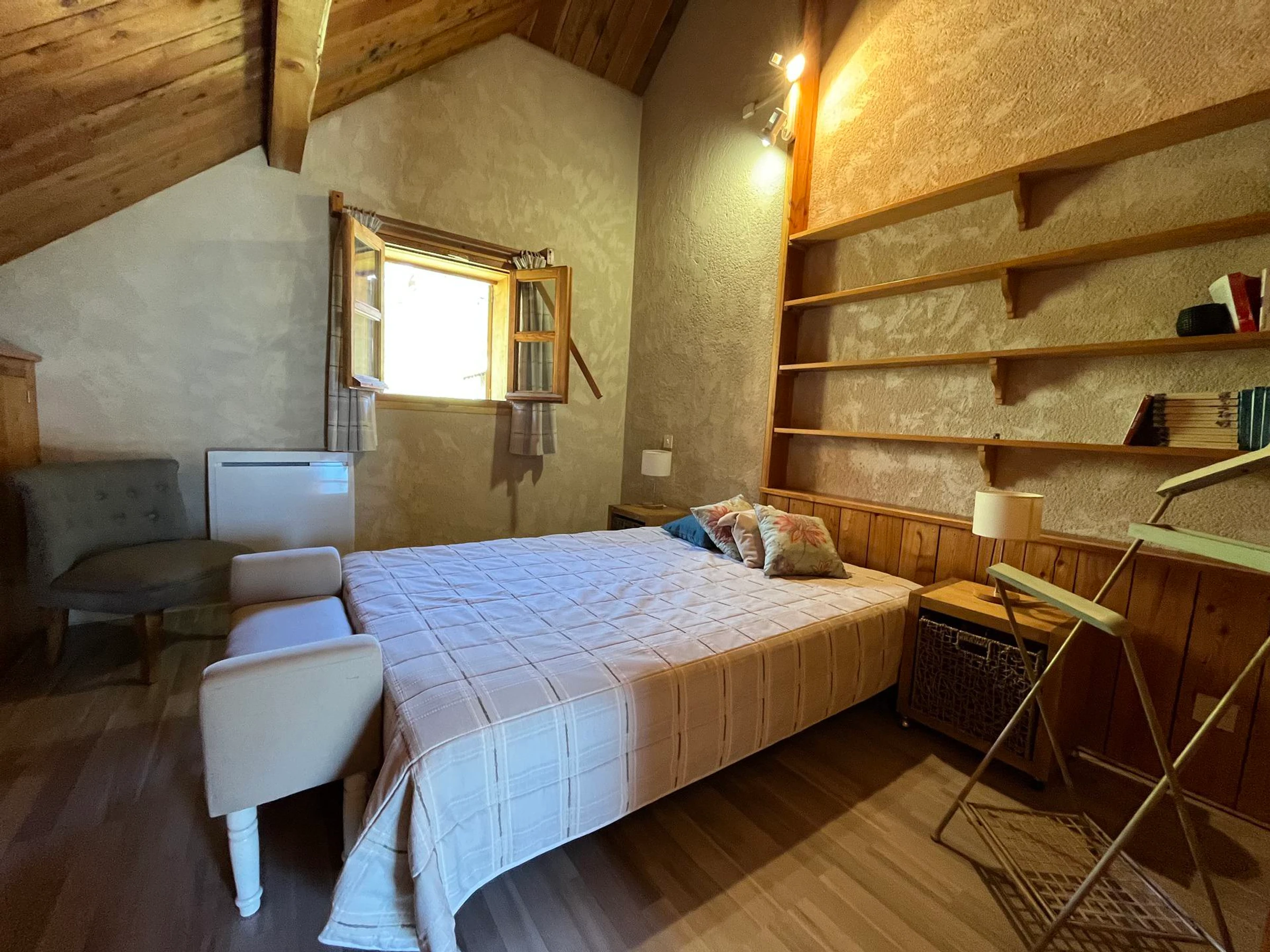 Im Obergeschoss, rechts, befindet sich ein Schlafzimmer mit einem Doppelbett (140 cm), Regalen und einem kleinen Abstellraum für Ihre persönlichen Gegenstände.