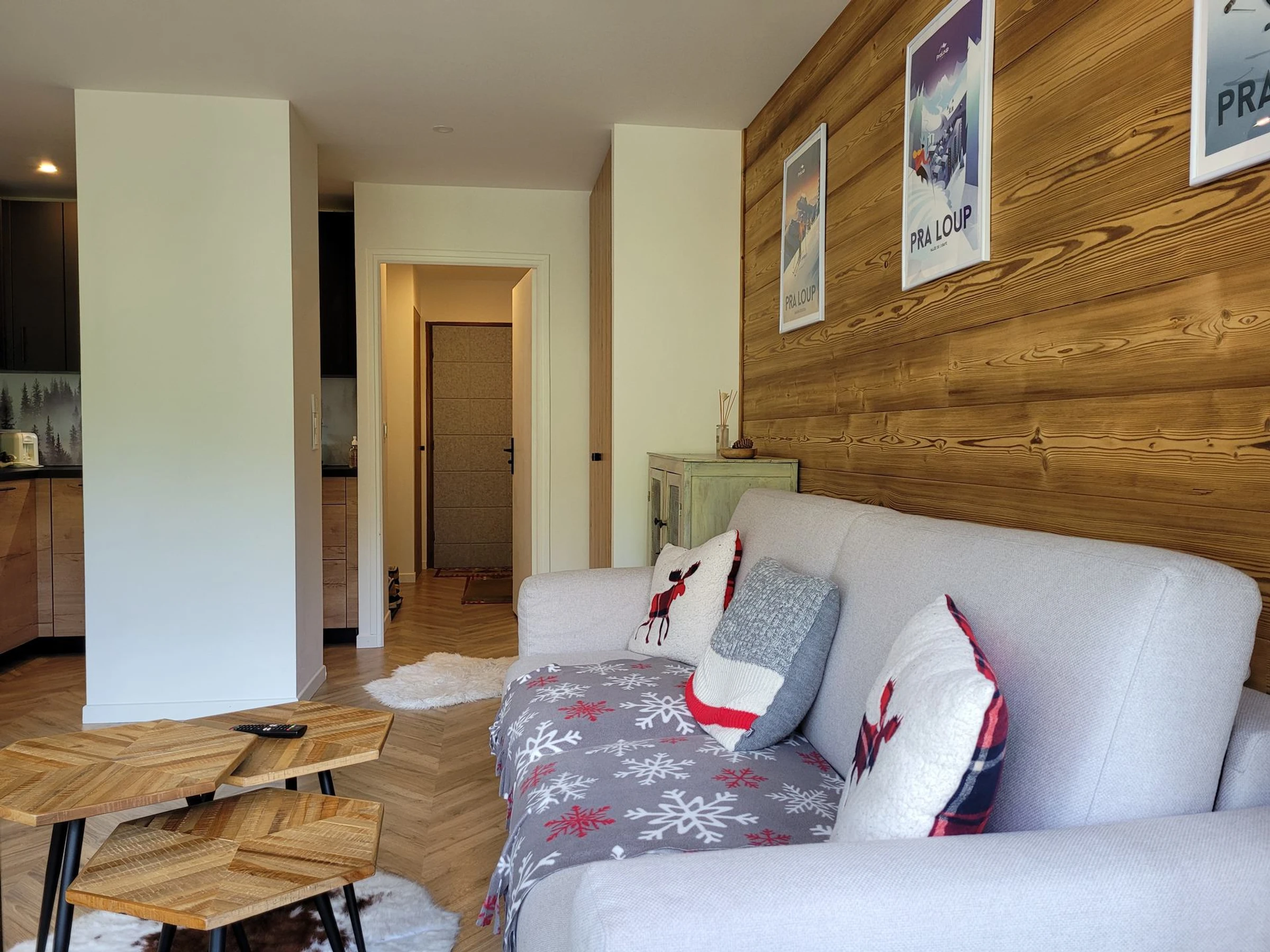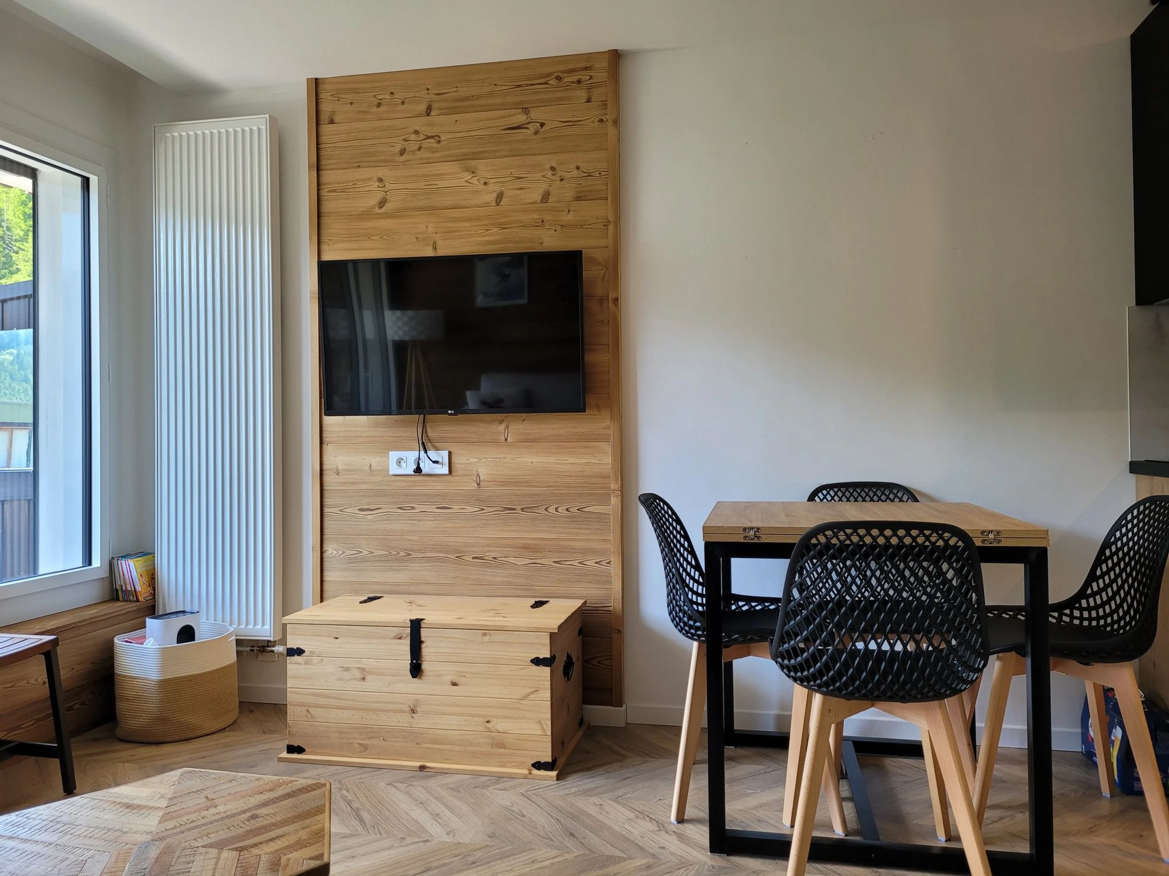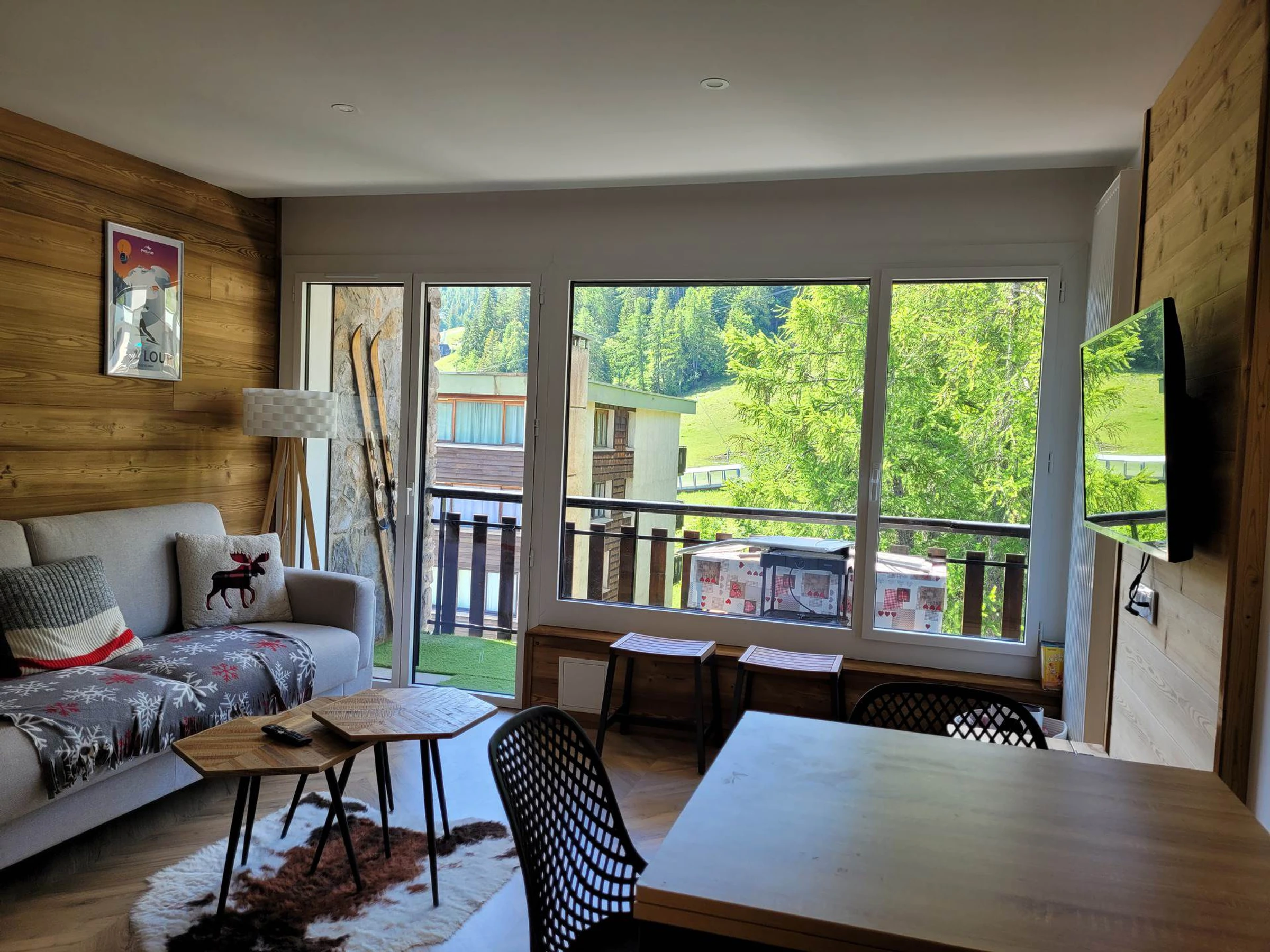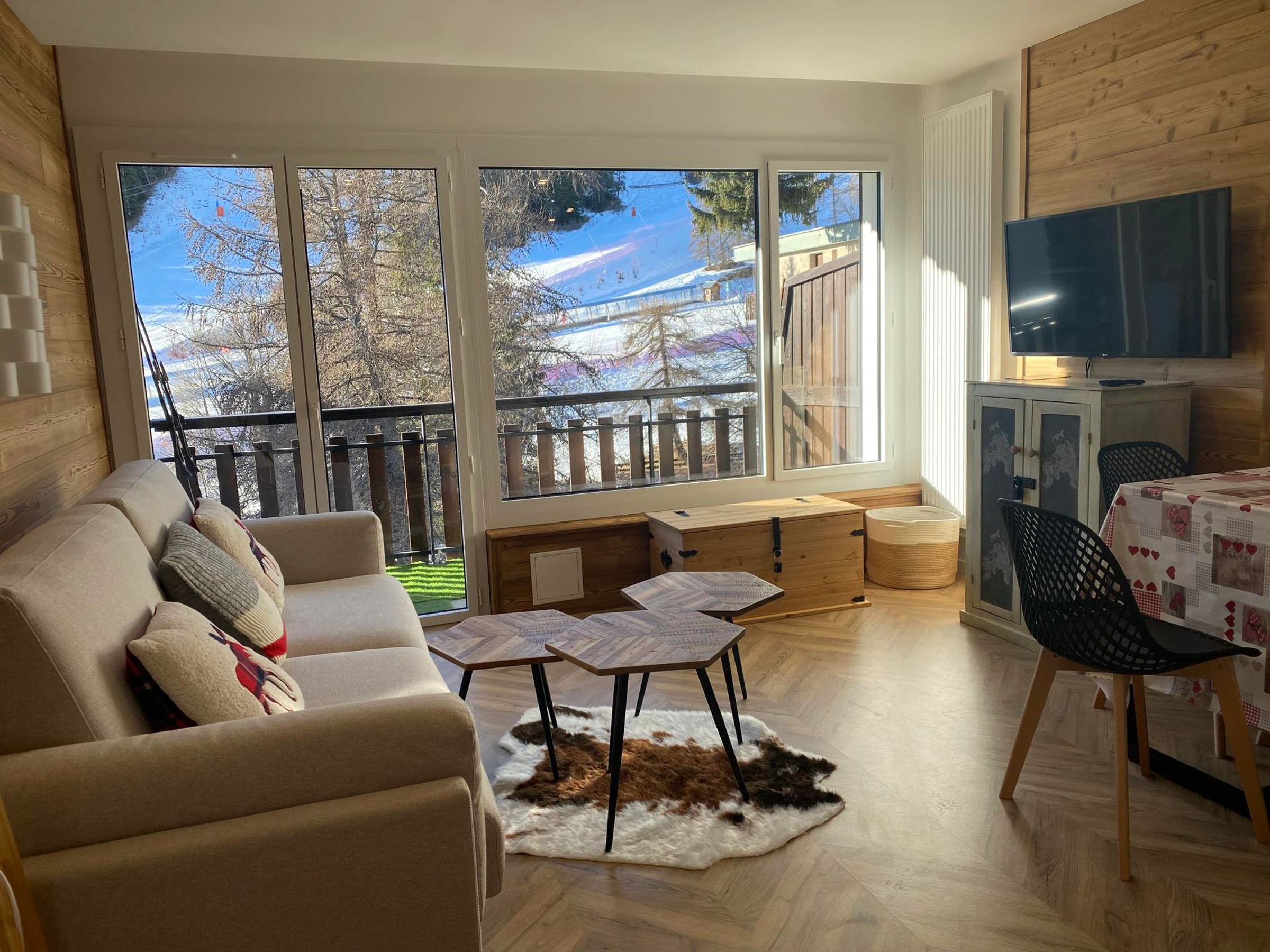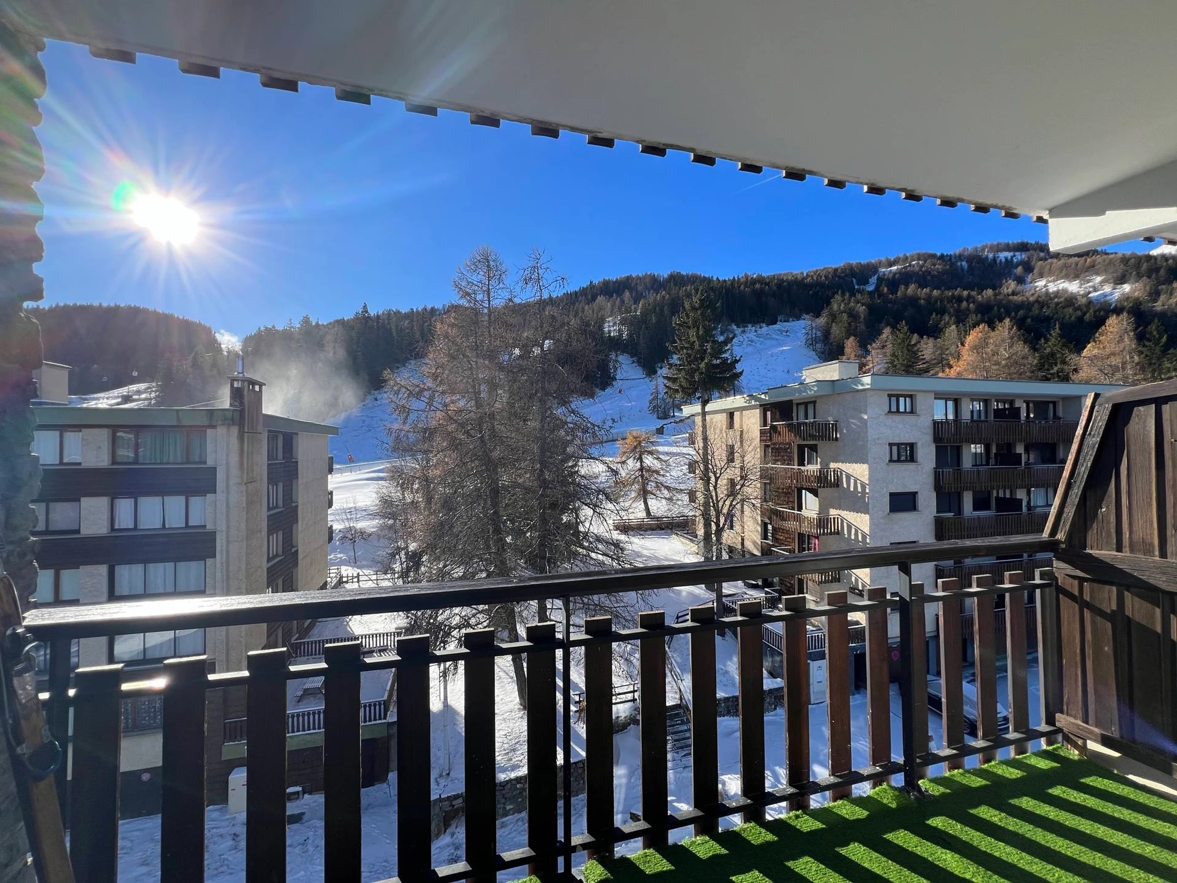 Studio für 4 Personen, ca. 30 m². Im 3. Stock mit Aufzug. Südlage mit Balkon und Blick auf die Pisten und den Gipfel des „Chapeau de Gendarme“. WLAN-Anschluss.