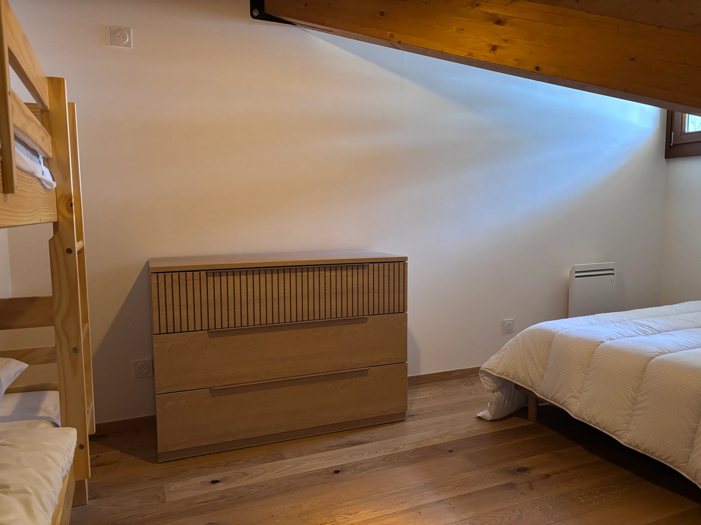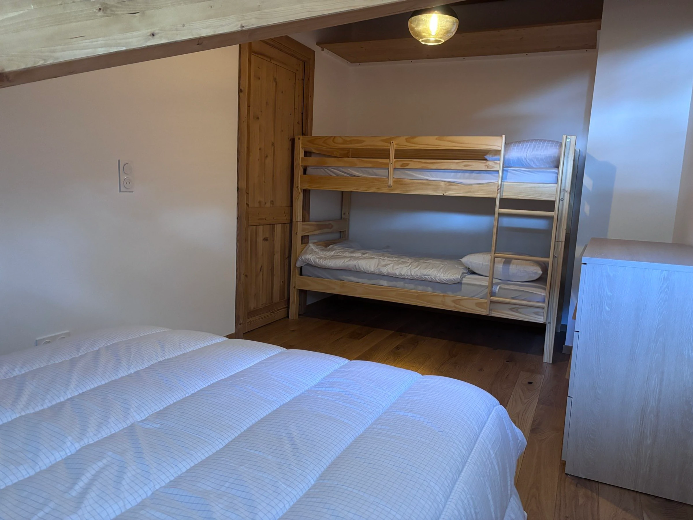 Schlafzimmer mit 1 Doppelbett (140 cm) und 90 cm Etagenbett.