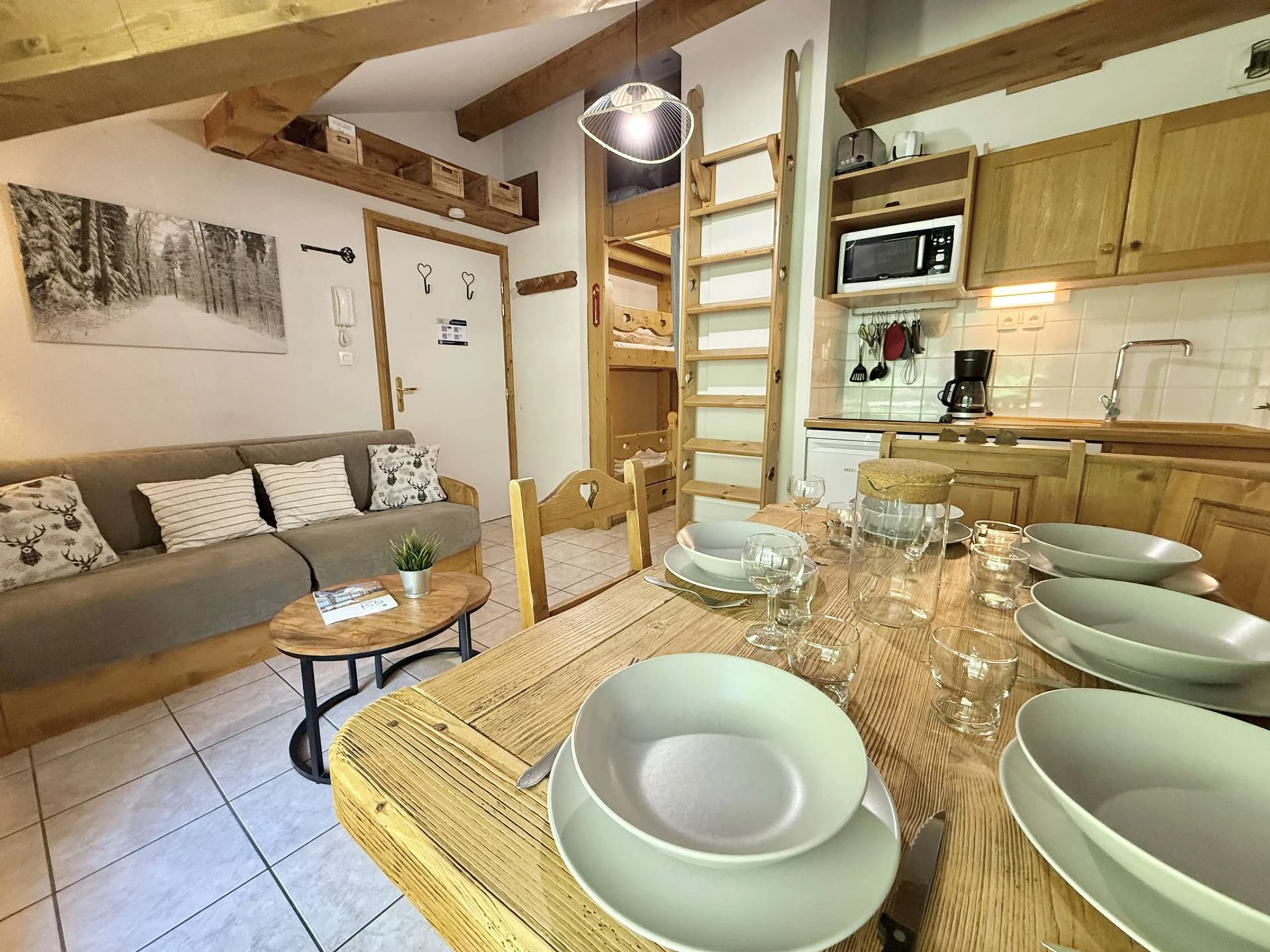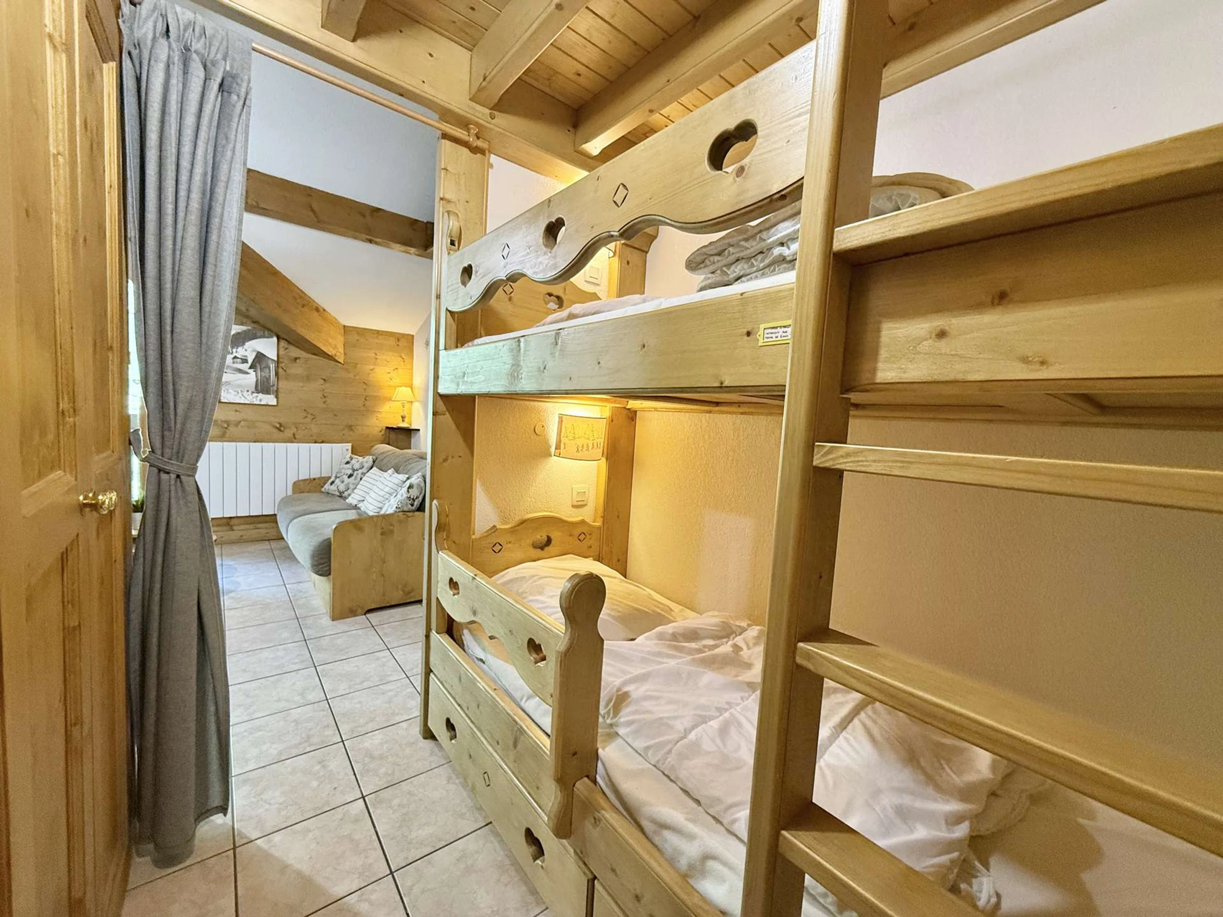 Dieses 25 m² große Apartment im dritten Stock der Residenz verfügt über eine voll ausgestattete Küche mit offenem Wohnraum und Doppelschlafsofa, ein Zwischengeschoss mit Dachschräge und Doppelbett (die Dachschräge ist mit einem Sicherheitsnetz ausgestattet), eine Schlafnische mit zwei Etagenbetten, ein Badezimmer mit Dusche und ein WC.