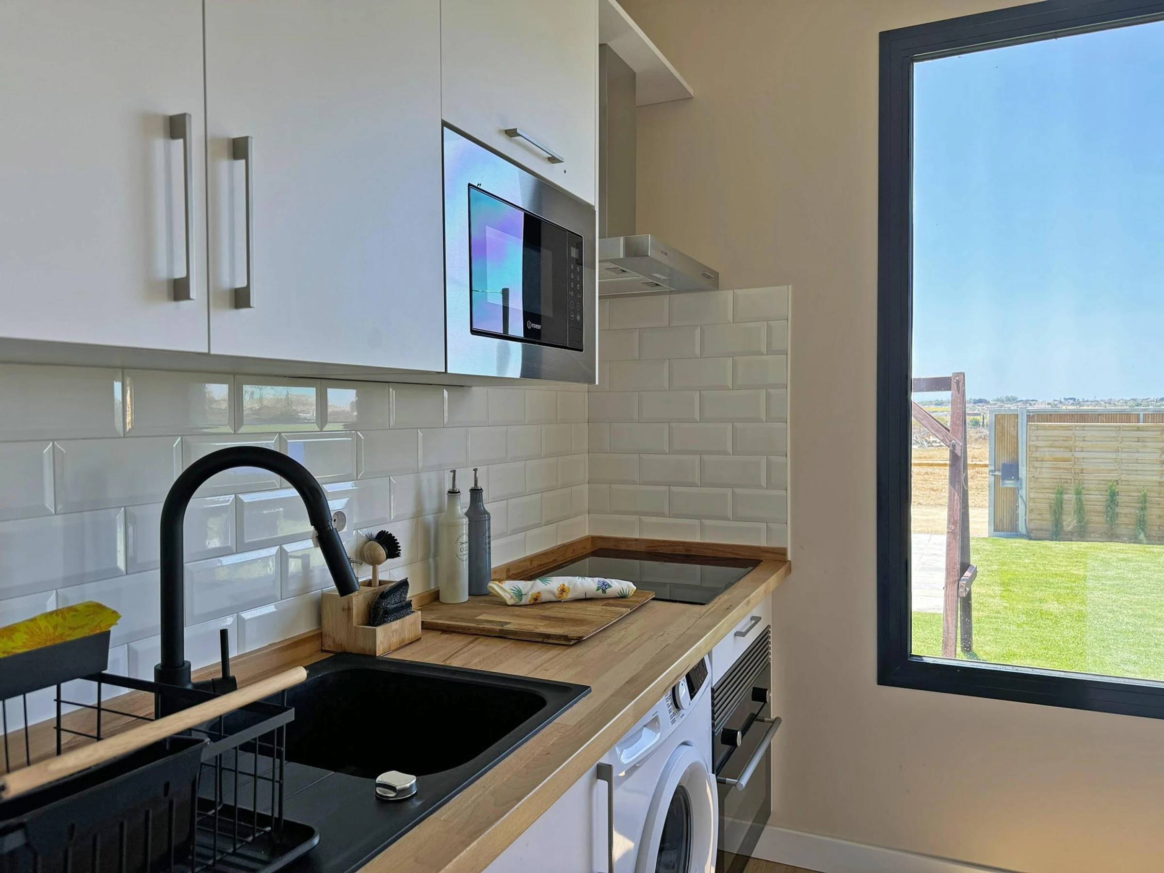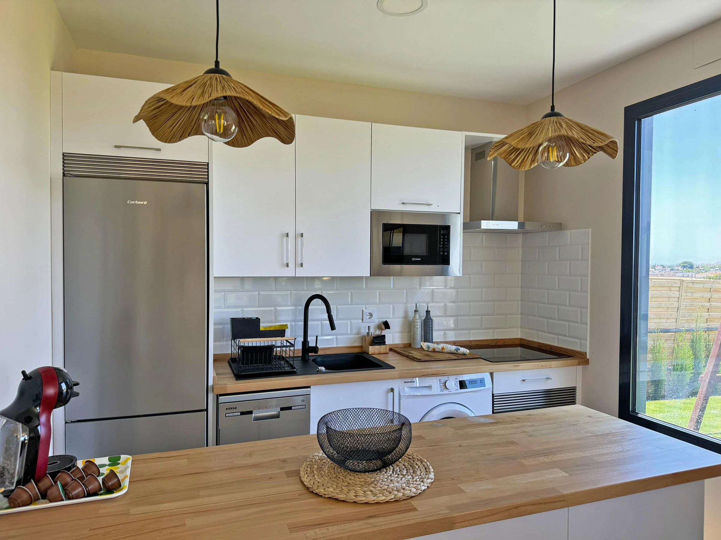 Dieses offene küche, mit ceranfeld, ist ausgestattet in kühlschrank, mikrowelle, backofen, gefrierschrank, spülmaschine, geschirr/besteck, kochutensilien, kaffeemaschine, toaster, wasserkocher und herdplatte.