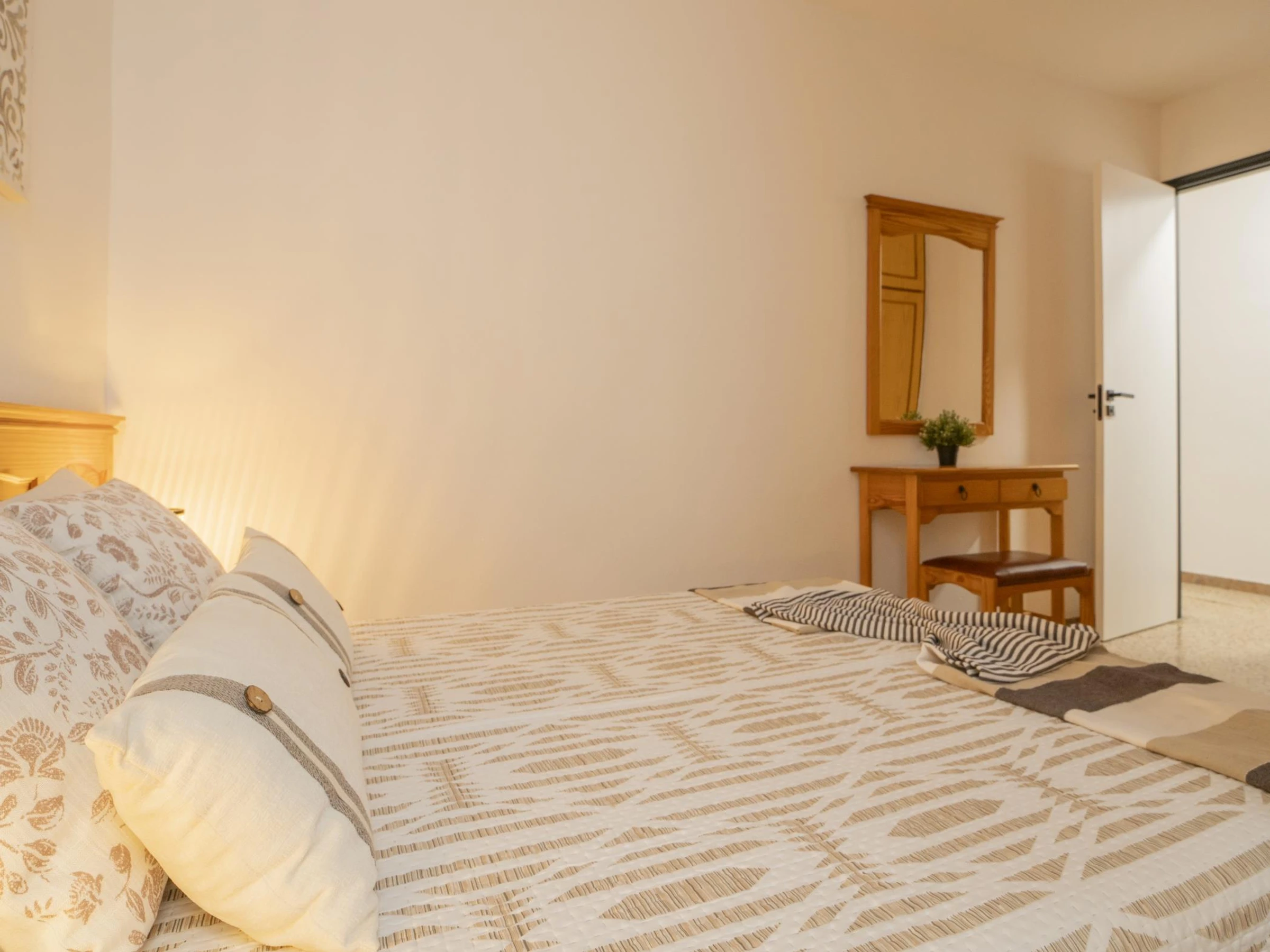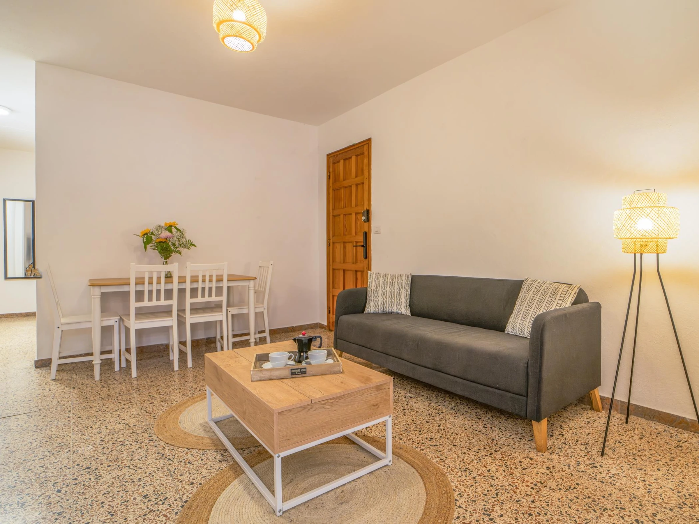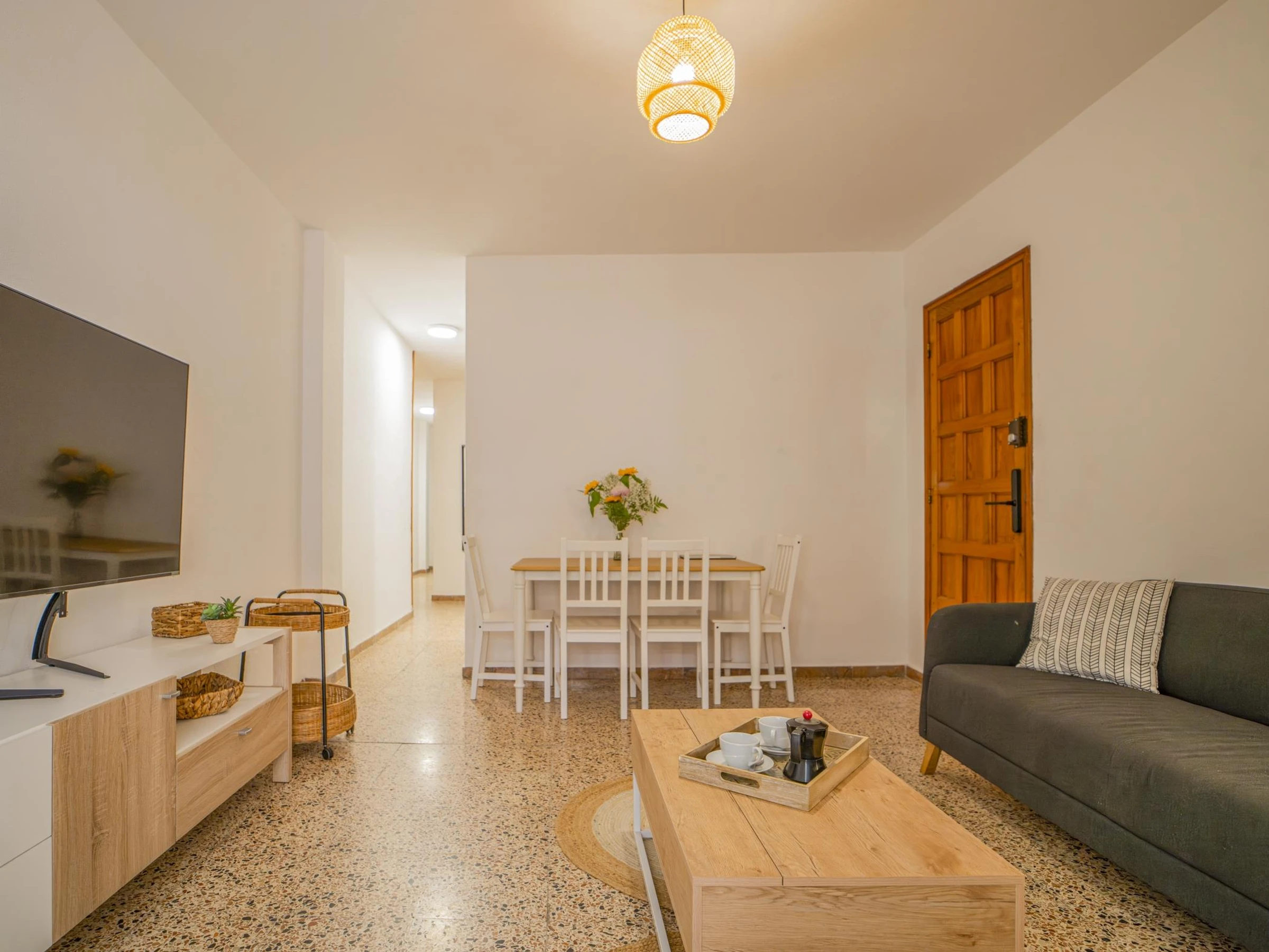 Die Wohnung verfügt über drei Schlafzimmer, eines mit einem Doppelbett und zwei mit Einzelbetten, und bietet Platz für vier Personen und ein Baby. Das große und helle Wohnzimmer öffnet sich zu einer Terrasse mit seitlichem Meerblick, perfekt, um im Freien zu frühstücken oder den Sonnenuntergang zu genießen.