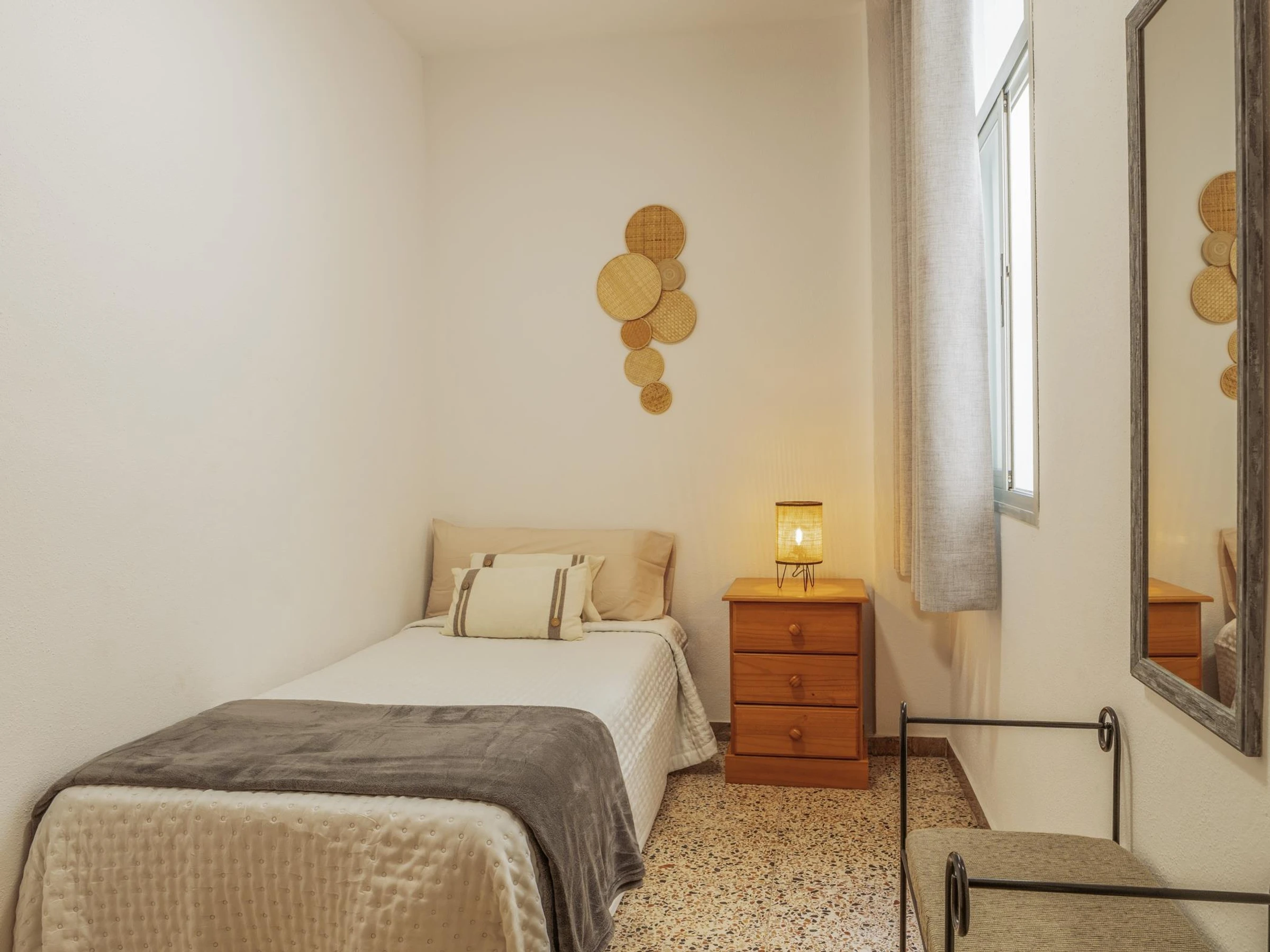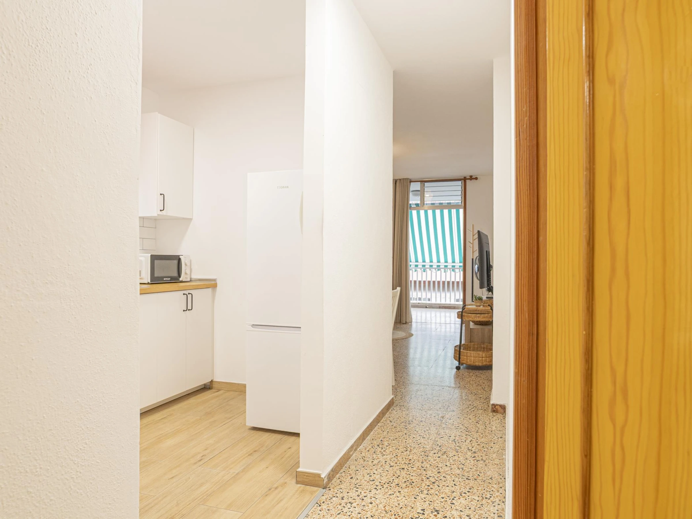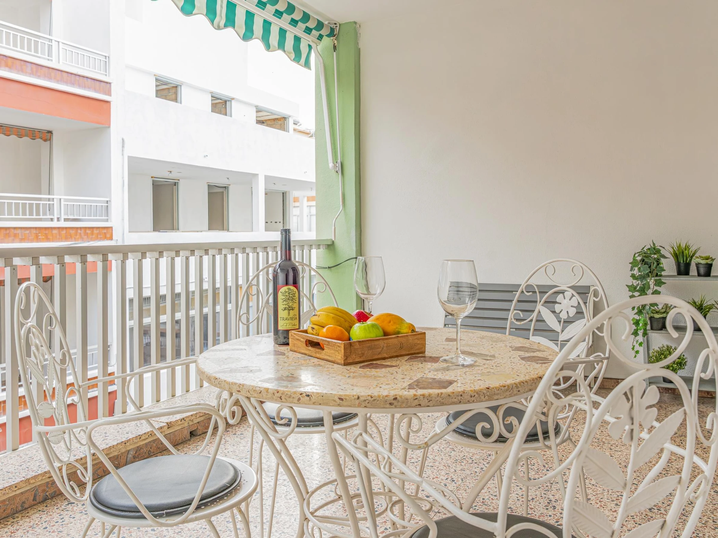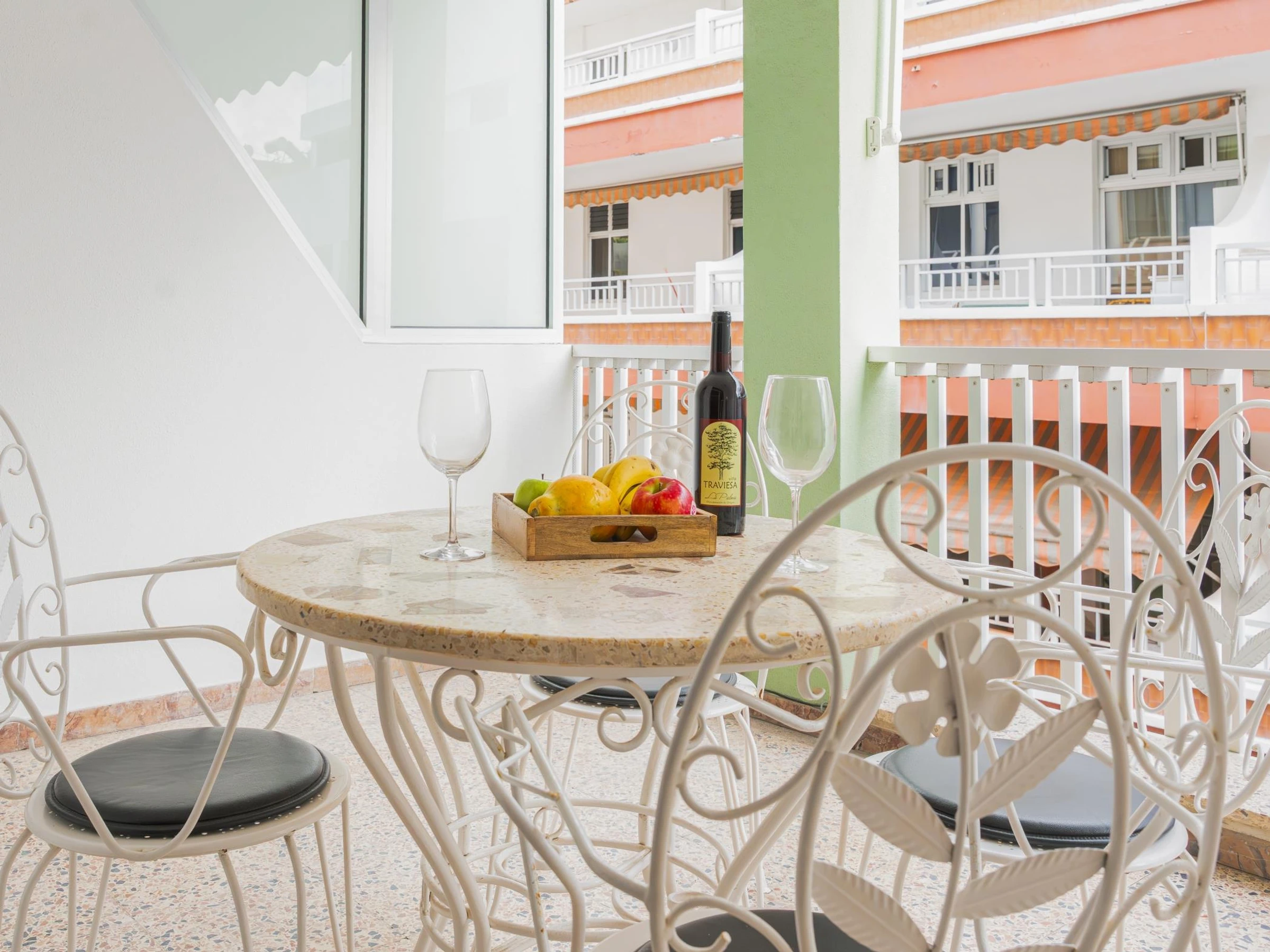 Die Wohnung verfügt über drei Schlafzimmer, eines mit einem Doppelbett und zwei mit Einzelbetten, und bietet Platz für vier Personen und ein Baby. Das große und helle Wohnzimmer öffnet sich zu einer Terrasse mit seitlichem Meerblick, perfekt, um im Freien zu frühstücken oder den Sonnenuntergang zu genießen.