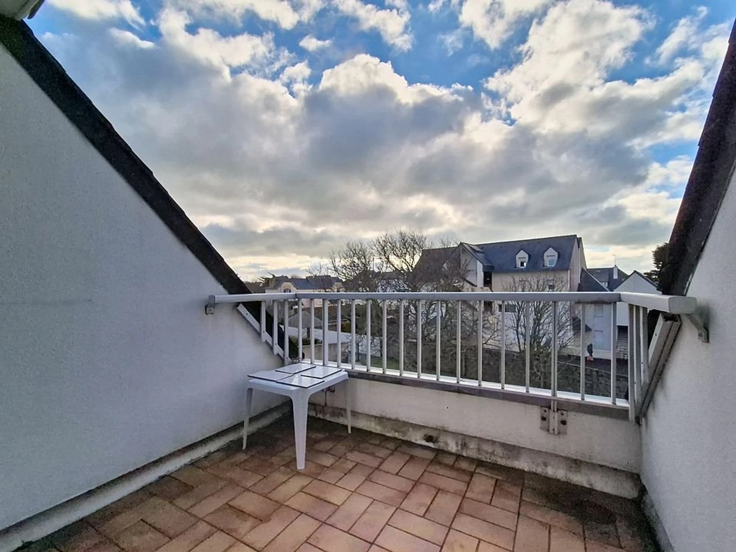 Eine 5 m² große, nach Südwesten ausgerichtete Loggia mit Gartenmöbeln. Die Unterkunft ist mit Bettdecken ausgestattet.