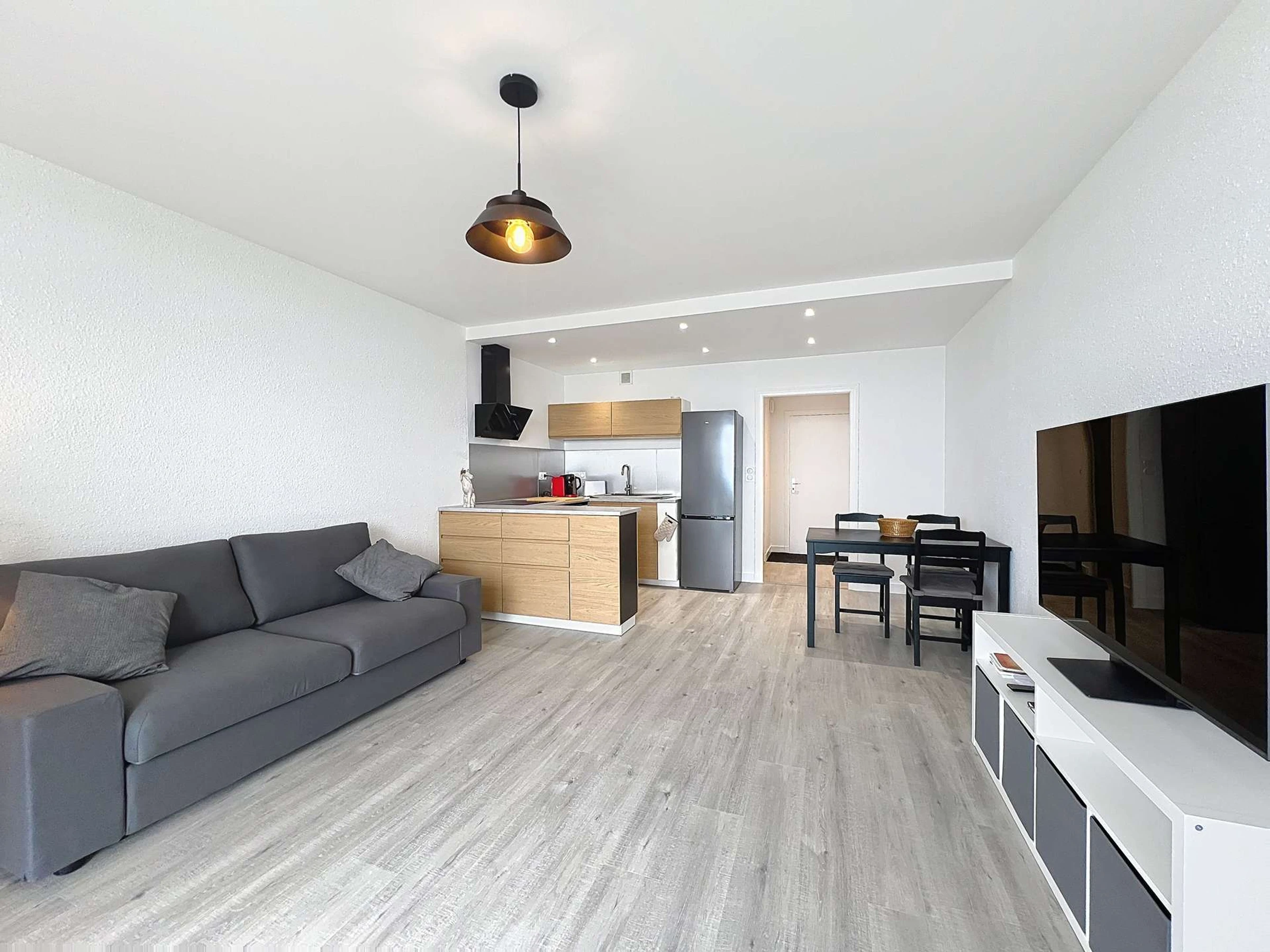 - Wohnzimmer mit Smart-TV, 140 cm Schlafsofa, Tisch und Stühlen,