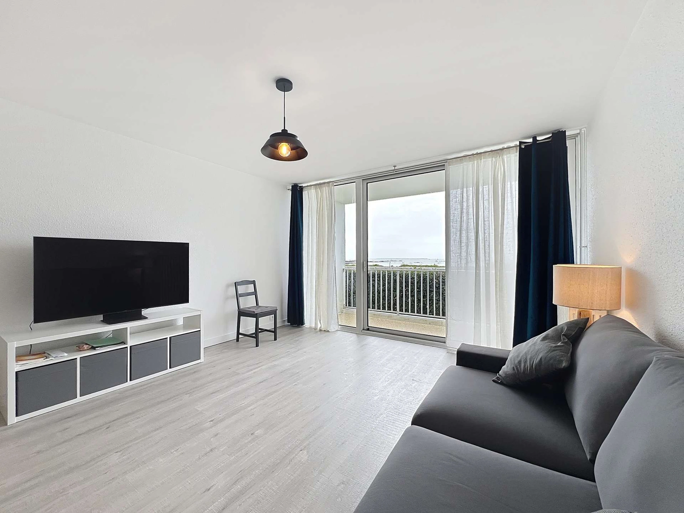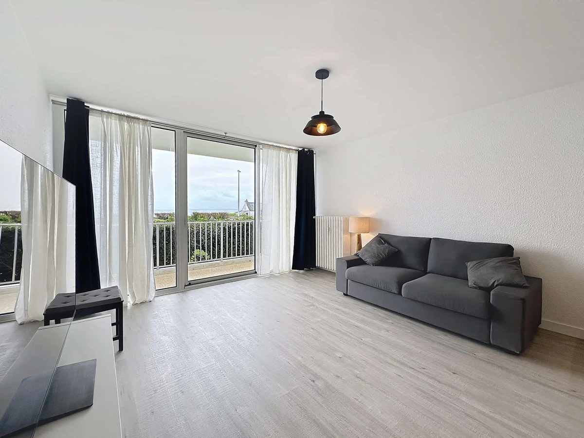 Komplett renoviertes 35 m² großes Studio-Apartment für 2 Personen im Erdgeschoss der Residenz „Les 3 Iles“, Tür 7, direkt neben dem Thalassotherapiezentrum Pointe du Conguel und nur 150 Meter von den nächsten Stränden entfernt. Wunderschöne, nach Süden ausgerichtete Loggia mit Blick auf Houat und Belle-Île.
