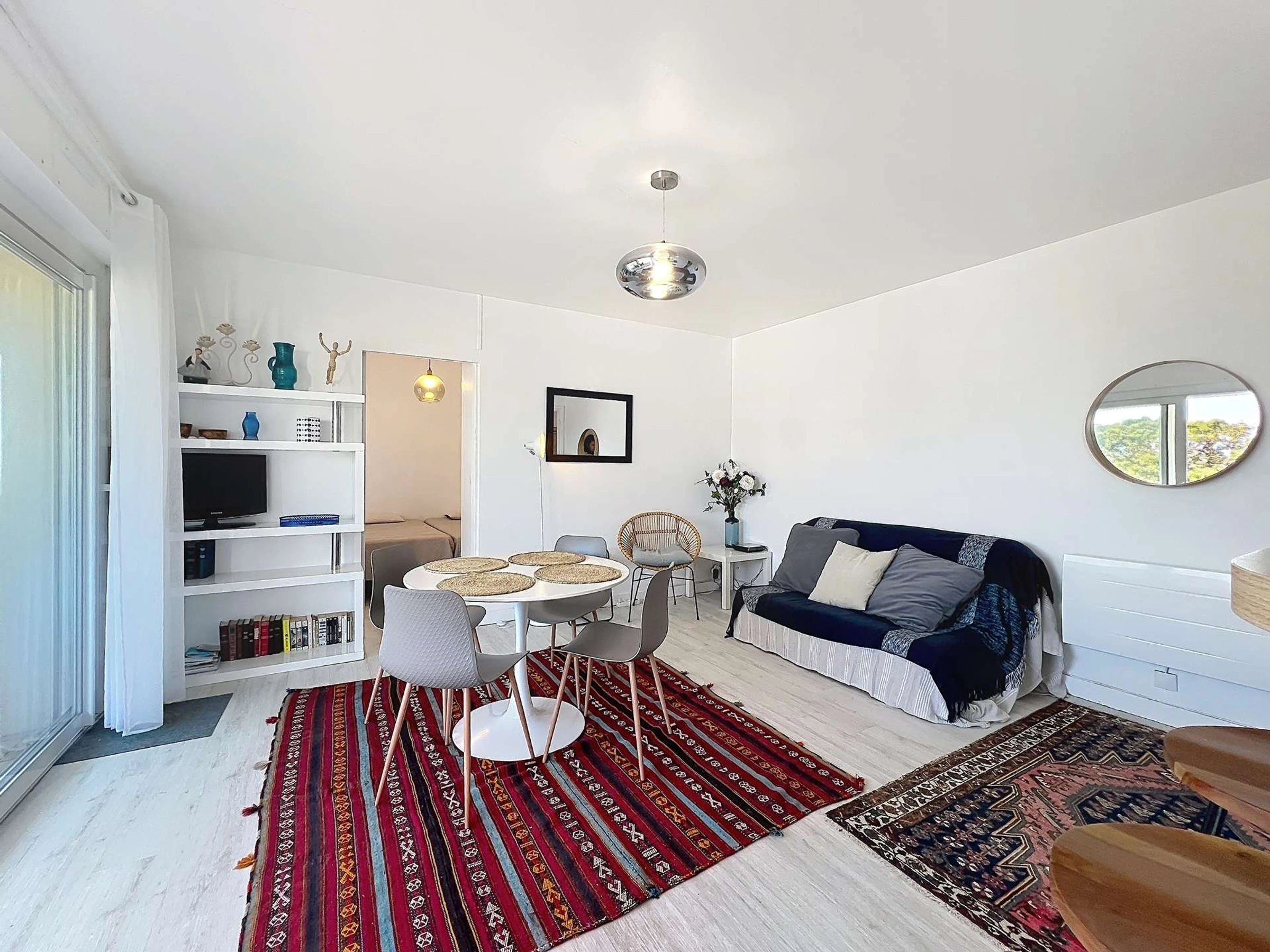 - Wohn-/Esszimmer mit einem 140 cm breiten Schlafsofa für 2 Personen, Tisch, Stühlen und TV,