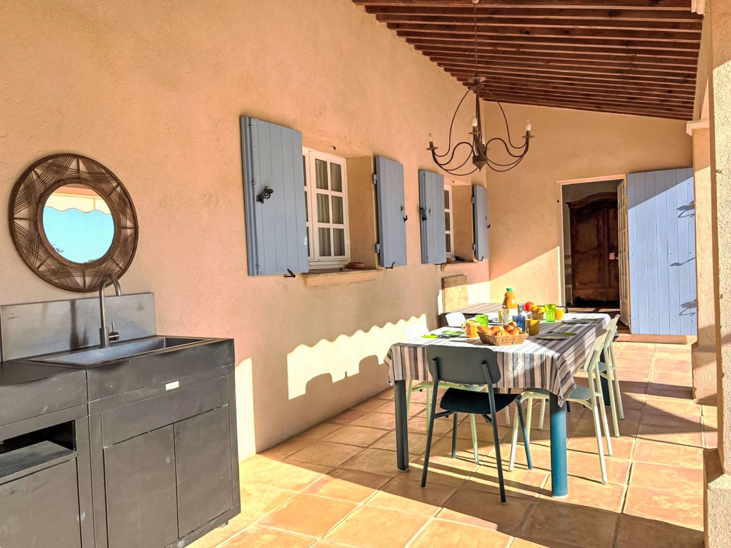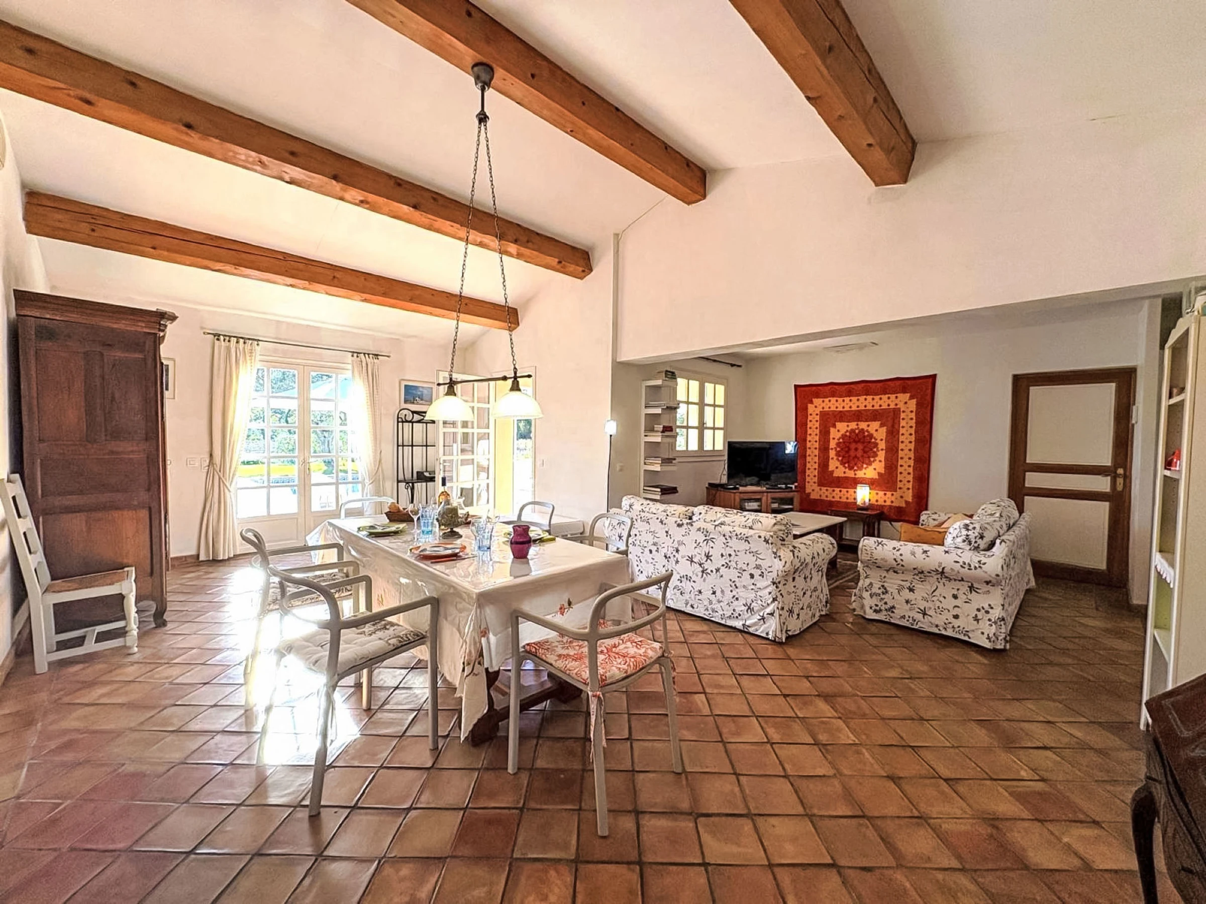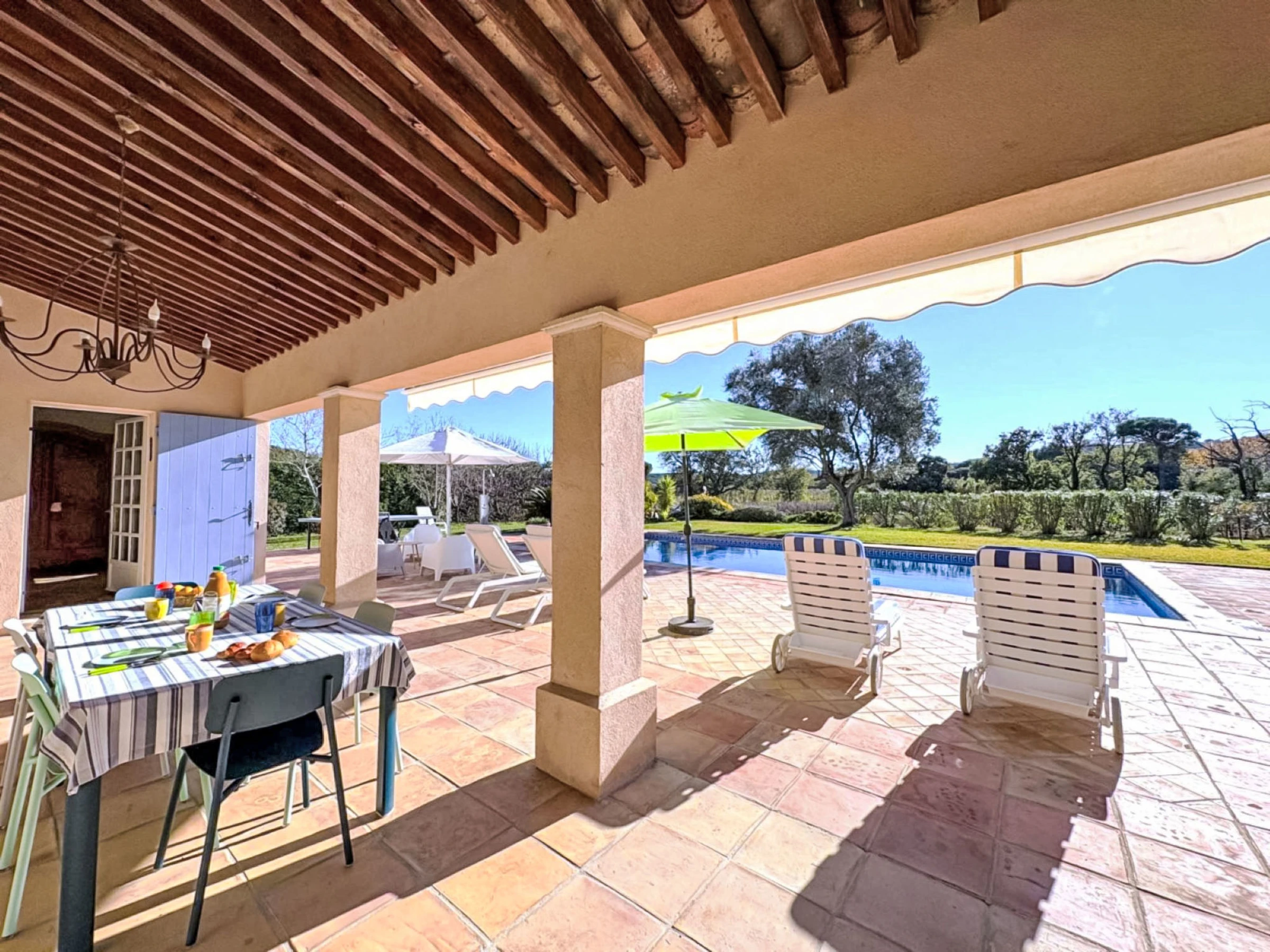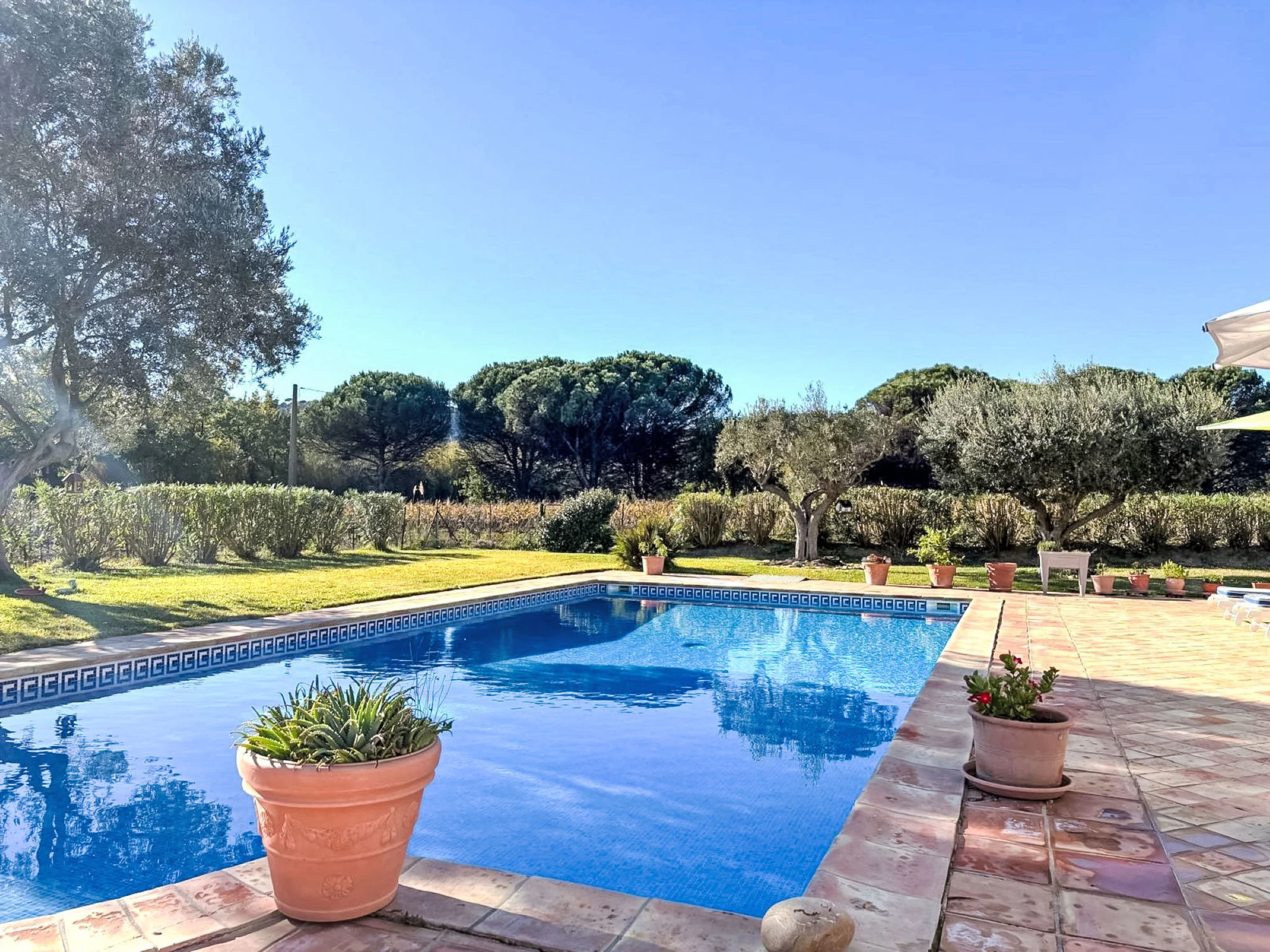 Ramatuelle: Einfamilienhaus "Le Grand Pin", umgeben von Weinbergen. Ausserhalb des Ortes, 4 km vom Zentrum von Ramatuelle, ruhige Lage, 3 km vom Meer, 3 km vom Strand. Zur Alleinbenutzung: gepflegter Garten 800 m2 (eingezäunt), Schwimmbad eckig (12 x 6 m, 100 - 180 cm tief, saisonale Verfügbarkeit: [hidden] - [hidden] Einkaufsgeschäft 4 km, Lebensmittelgeschäft 4 km, Supermarkt 10 km, Restaurant 3 km, Bushaltestelle "Les Combes Jauffret" 700 m, Sandstrand "L'Escalet" 3 km. Sporthafen 9 km, Segelschule 12 km, Tennis 2 km, Minigolf 10 km. Nahe gelegene Sehenswürdigkeiten: Plages de Pampelonne 5 km, Saint-Tropez 10 km, Parc d'atractions Azur Park 10 km, Port Grimaud 12 km, Cannes 92 km, Nice 110 km. Bitte beachten: Fahrzeug empfohlen. Die Schlüsselübergabe findet bei der Agentur in Gassin statt, 9 km.