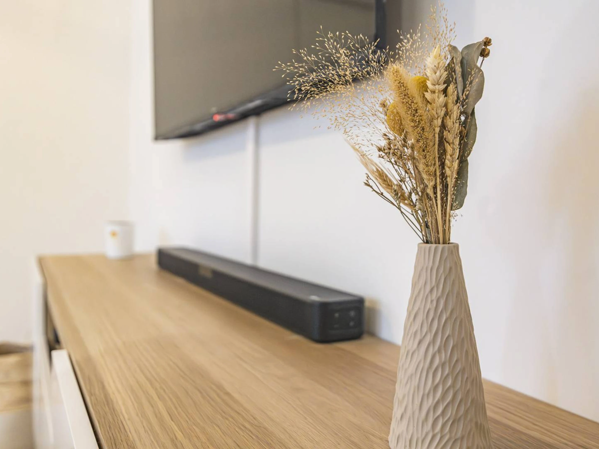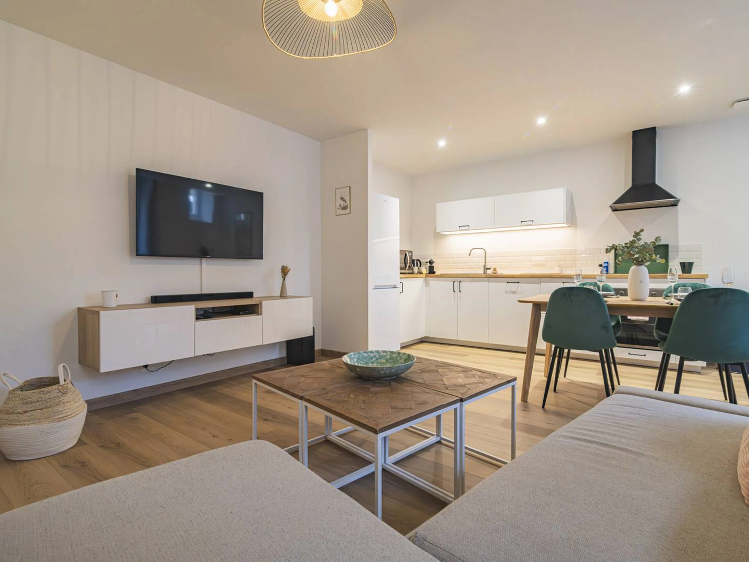 Das helle und freundliche Wohnzimmer lädt mit Schlafsofa und Fernseher zum Entspannen ein – perfekt für gemütliche Abende.