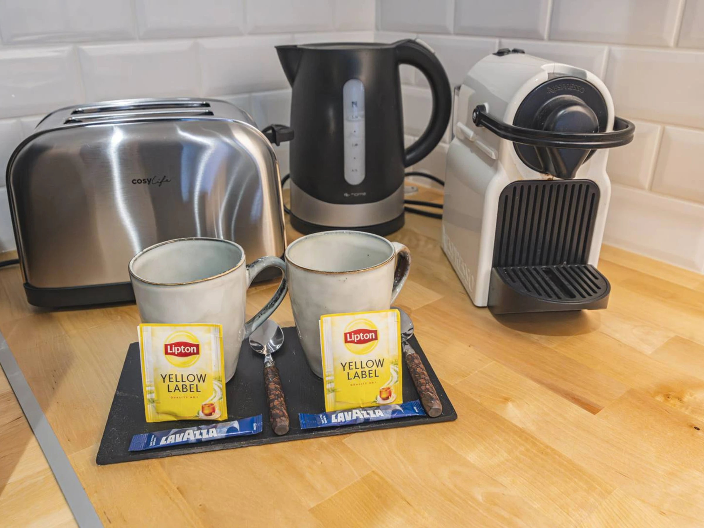 Die voll ausgestattete Küche wird alle Kochbegeisterten begeistern: Geschirrspüler, Herd, Kühlschrank, Backofen, Mikrowelle, Nespresso-Maschine, Wasserkocher, Toaster – alles ist darauf ausgelegt, Ihnen den Alltag zu erleichtern. Gleich nebenan befindet sich das Esszimmer mit einem einladenden Esstisch, ideal für gemeinsame Mahlzeiten.