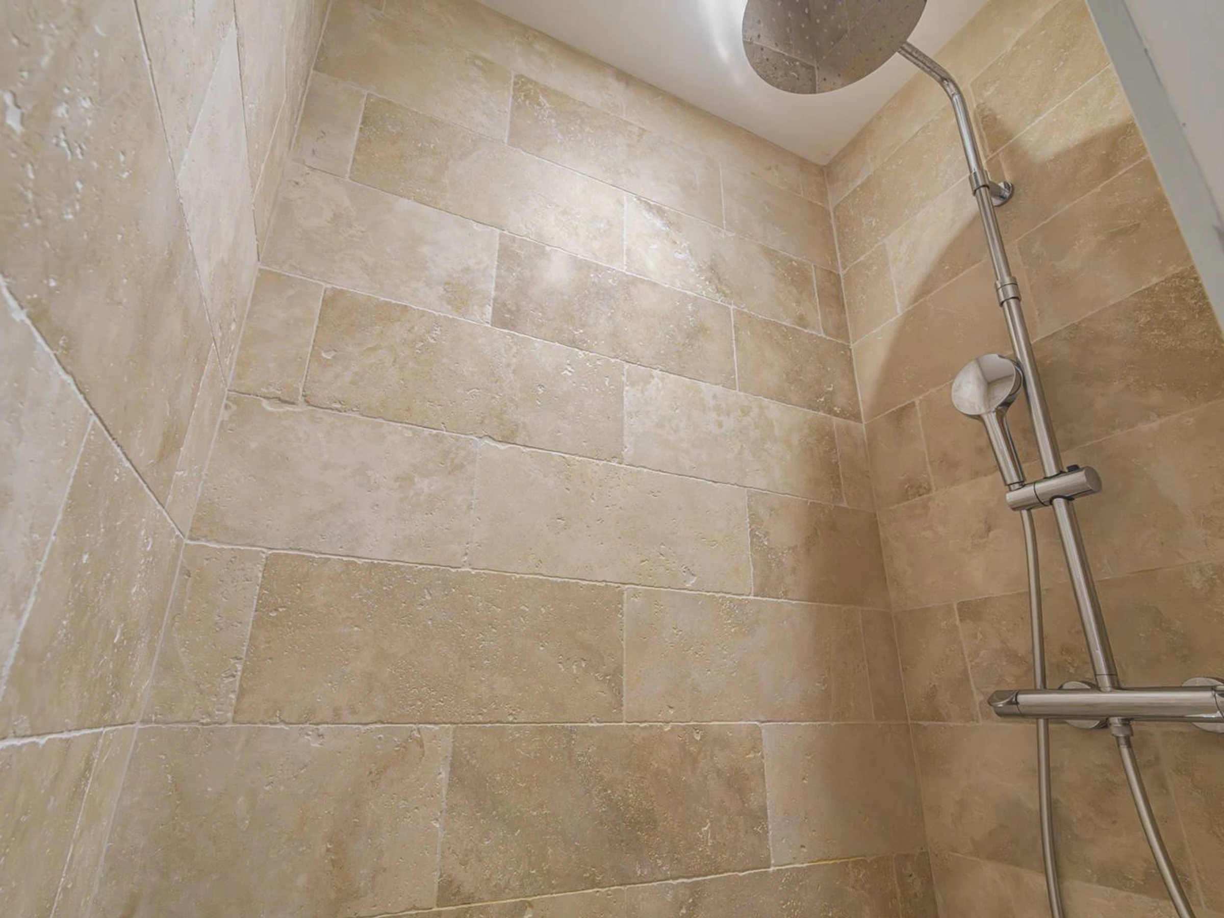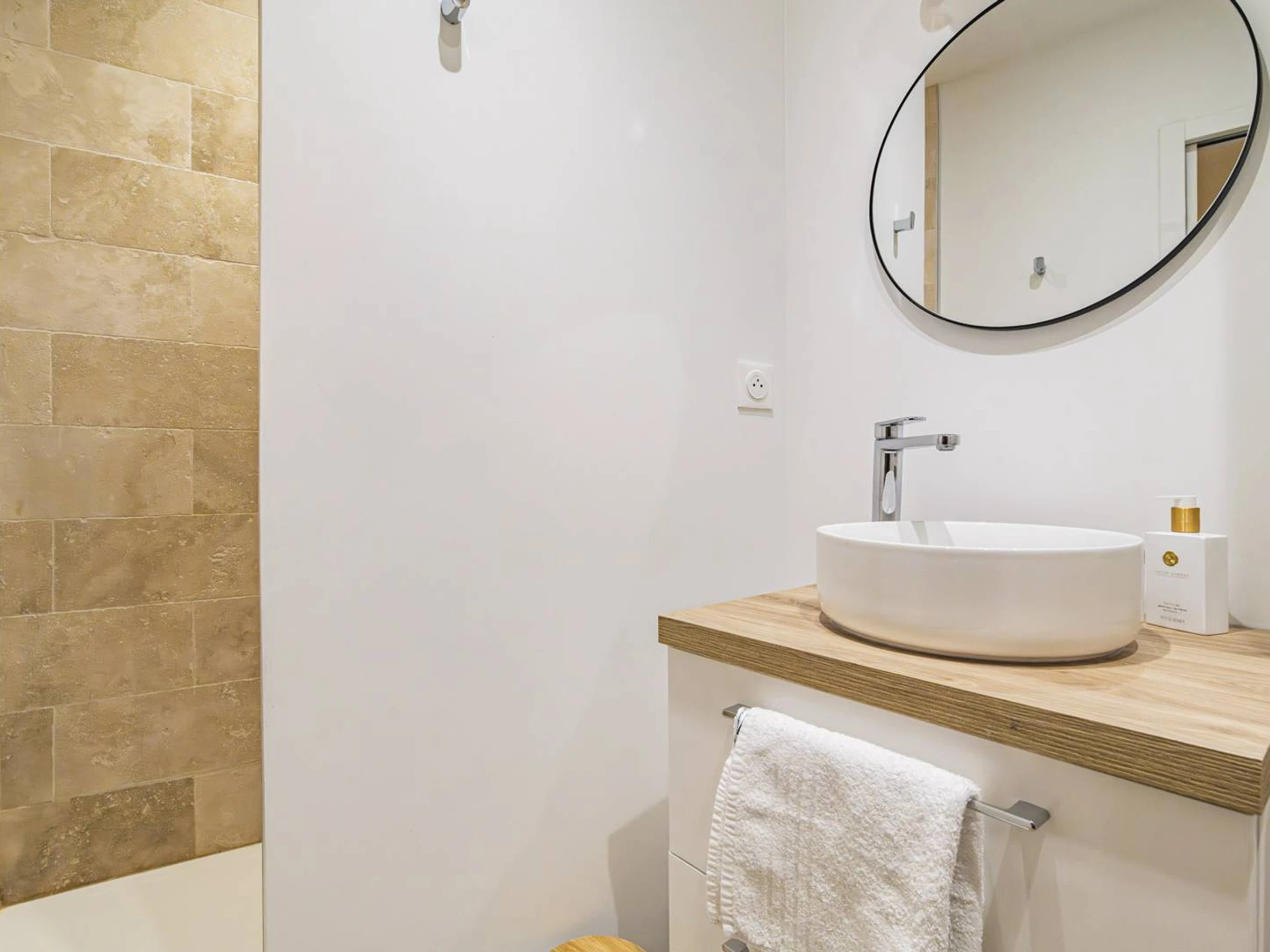 Das moderne Badezimmer ist mit einer ebenerdigen Dusche, einem Waschbecken und einer Waschmaschine ausgestattet und bietet Ihnen Komfort und Unabhängigkeit während Ihres Aufenthalts.