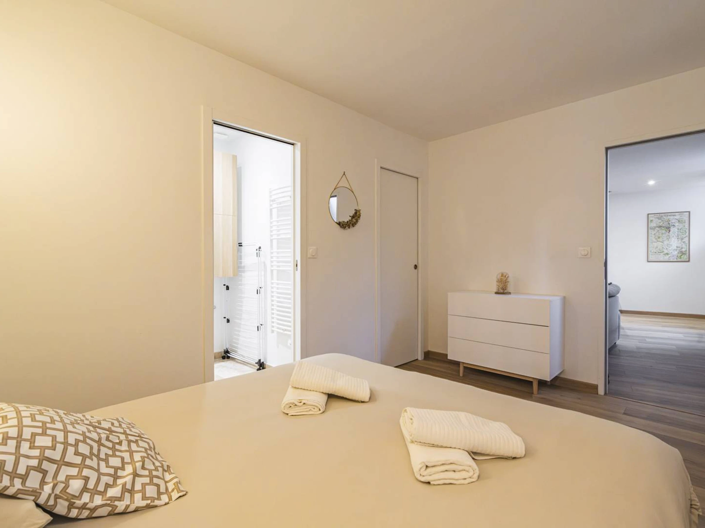 Das ruhige und geschmackvoll eingerichtete Schlafzimmer verfügt über ein komfortables Doppelbett und eine Kommode zur Aufbewahrung Ihrer persönlichen Gegenstände.