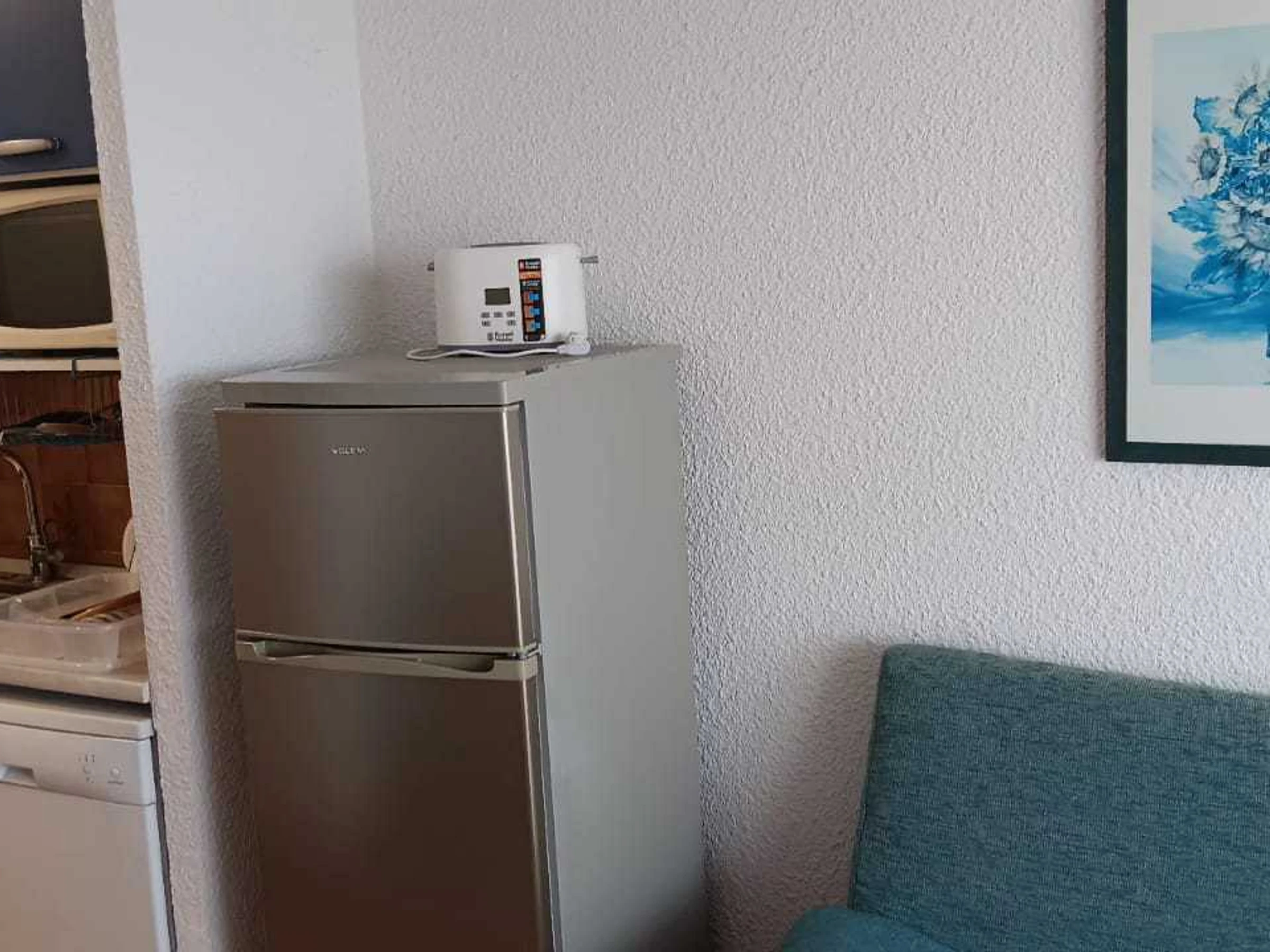 Ausgestattete Küchenzeile: Geschirrspüler, Mikrowelle, Kühl-/Gefrierschrank, Toaster, Wasserkocher, Filterkaffeemaschine.