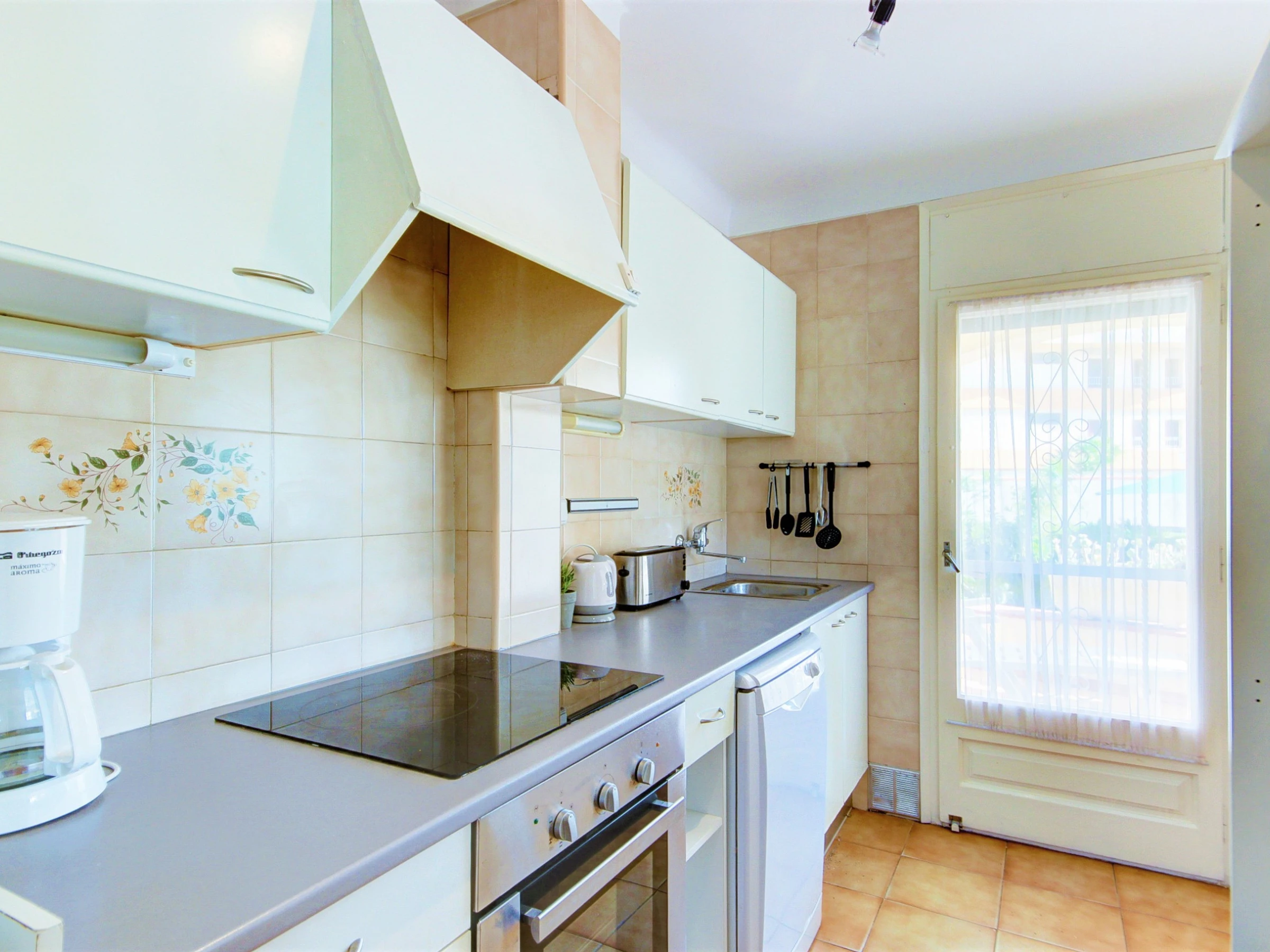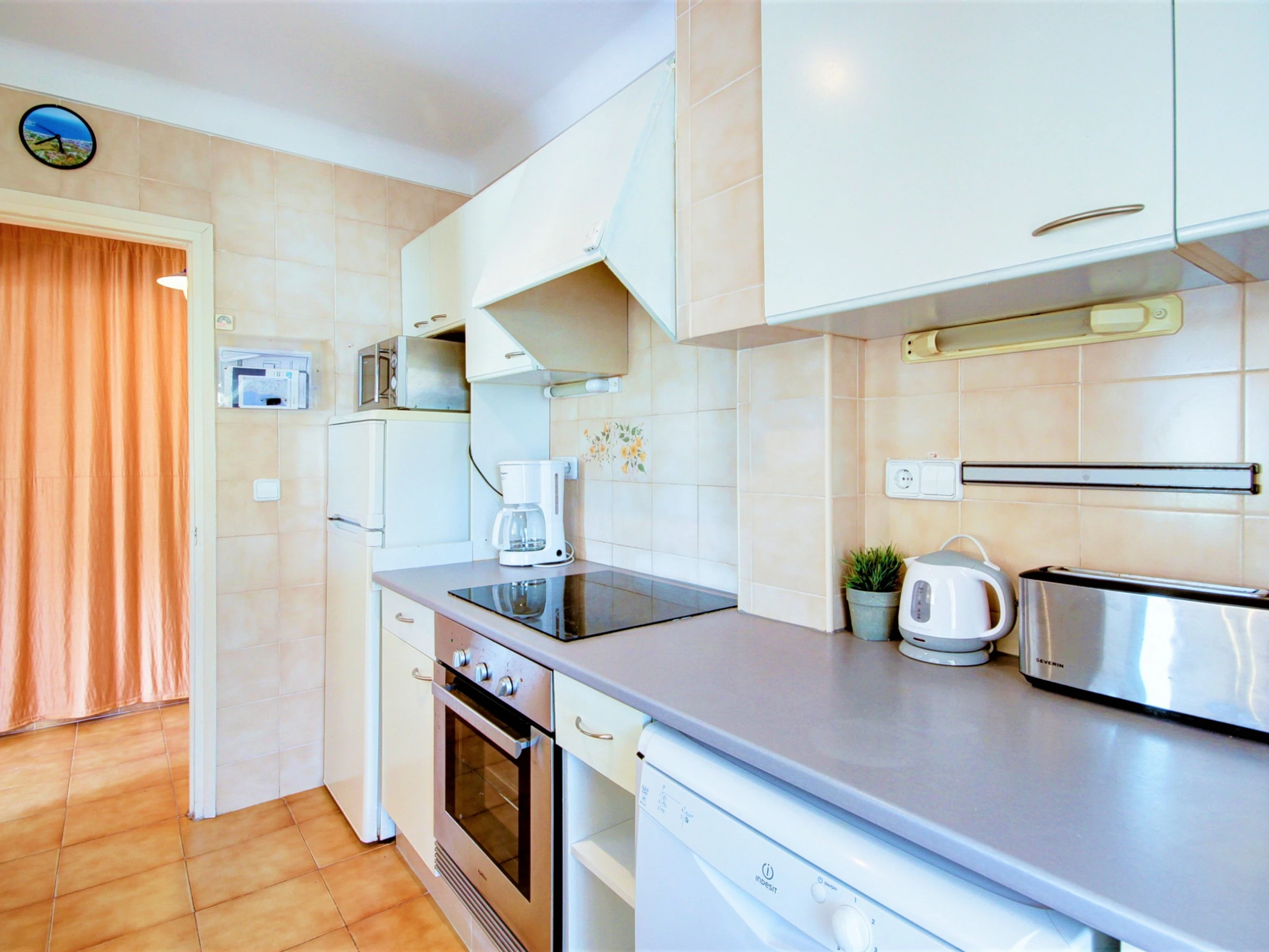 Die offene Küche ist komplett mit modernen Geräten ausgestattet, darunter Cerankochfeld, Backofen, Mikrowelle, Geschirrspüler und Kühl-/Gefrierschrank.