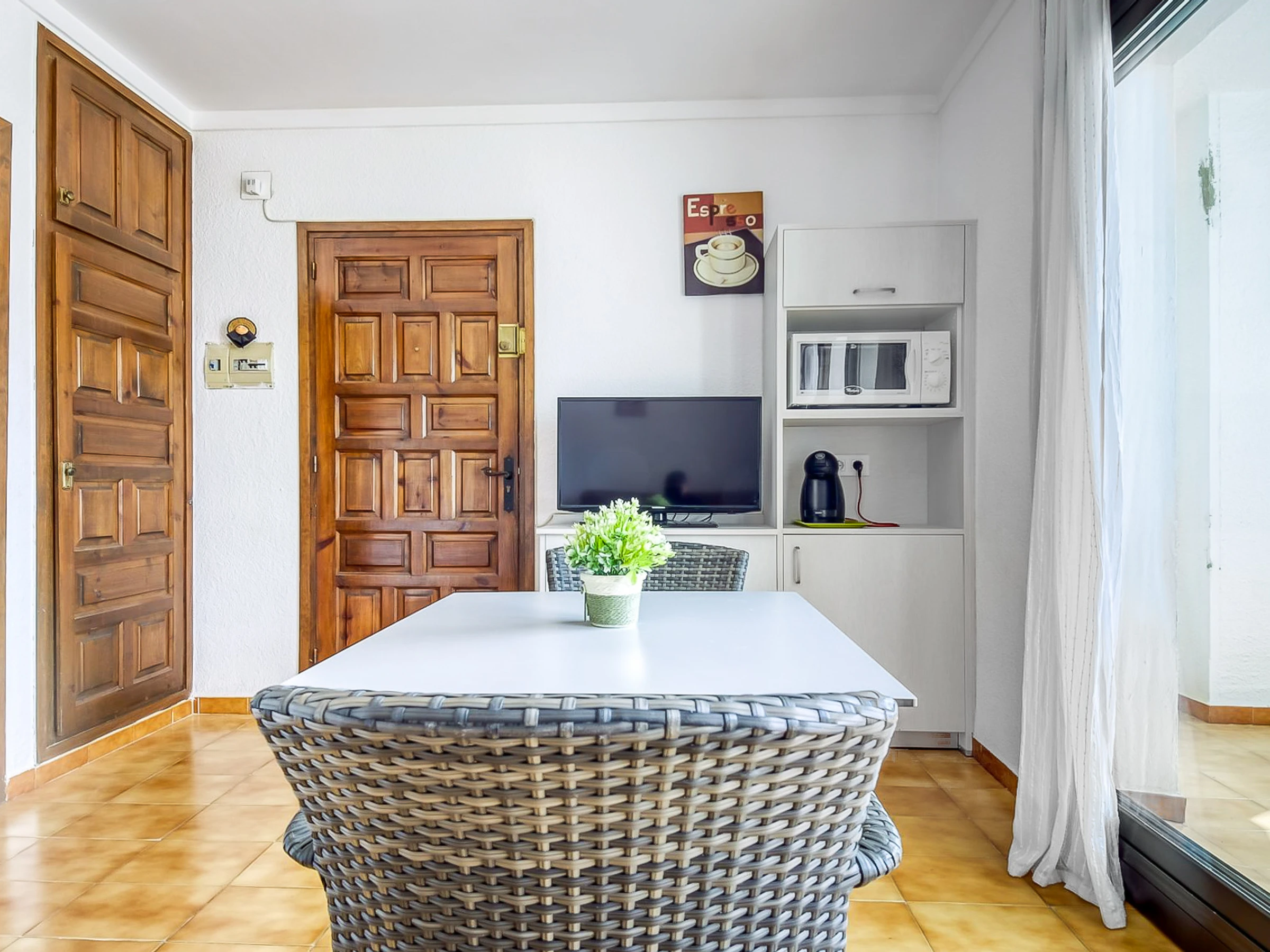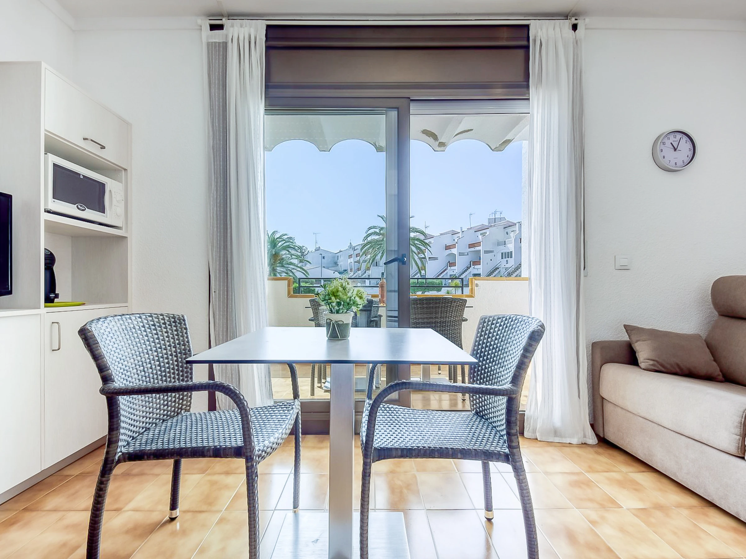 Von der 7 Quadratmeter großen Terrasse aus können Gäste den Blick auf den erfrischenden Gemeinschaftspool genießen und so eine ruhige und entspannende Atmosphäre schaffen. Terrassenmöbel bieten den idealen Platz, um Mahlzeiten im Freien zu genießen oder einfach in der Sonne zu entspannen.