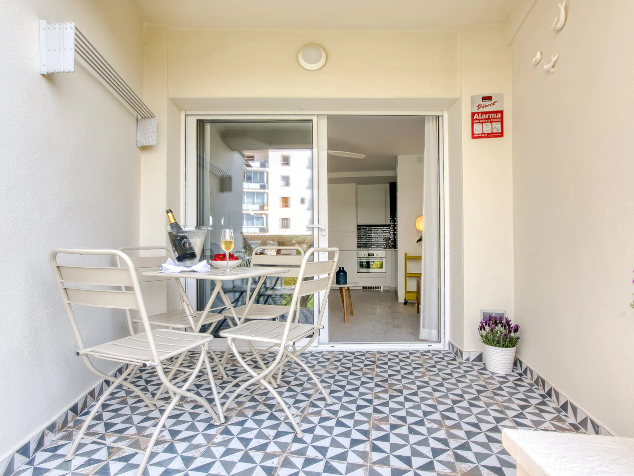 Eine angenehme 7m2 Terrasse mit Blick auf den Garten und den Parkplatz, wo man sich entspannen und die Außenbereiche genießen kann. Perfekt zum Frühstücken oder um bei Sonnenuntergang einen Drink zu genießen. Teilweise Meerblick und Blick auf die Promenade vom Apartment aus.
