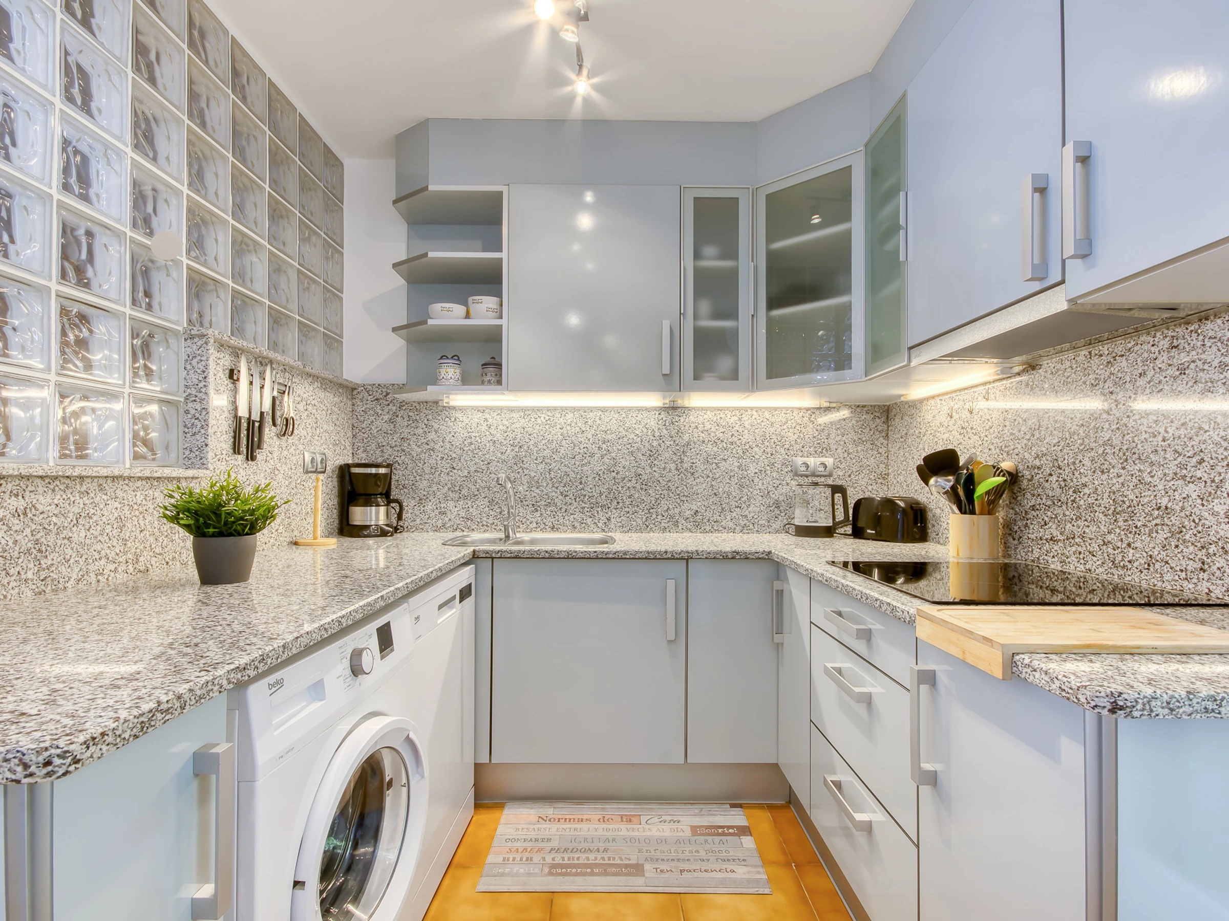 Die unabhängige Küche mit Glaskeramikkochfeld ist ausgestattet mit Kühlschrank, Mikrowelle, Backofen, Gefrierschrank, Geschirrspüler, Geschirr/Besteck, Küchenutensilien/Kochgeschirr, Kaffeemaschine und Toaster.