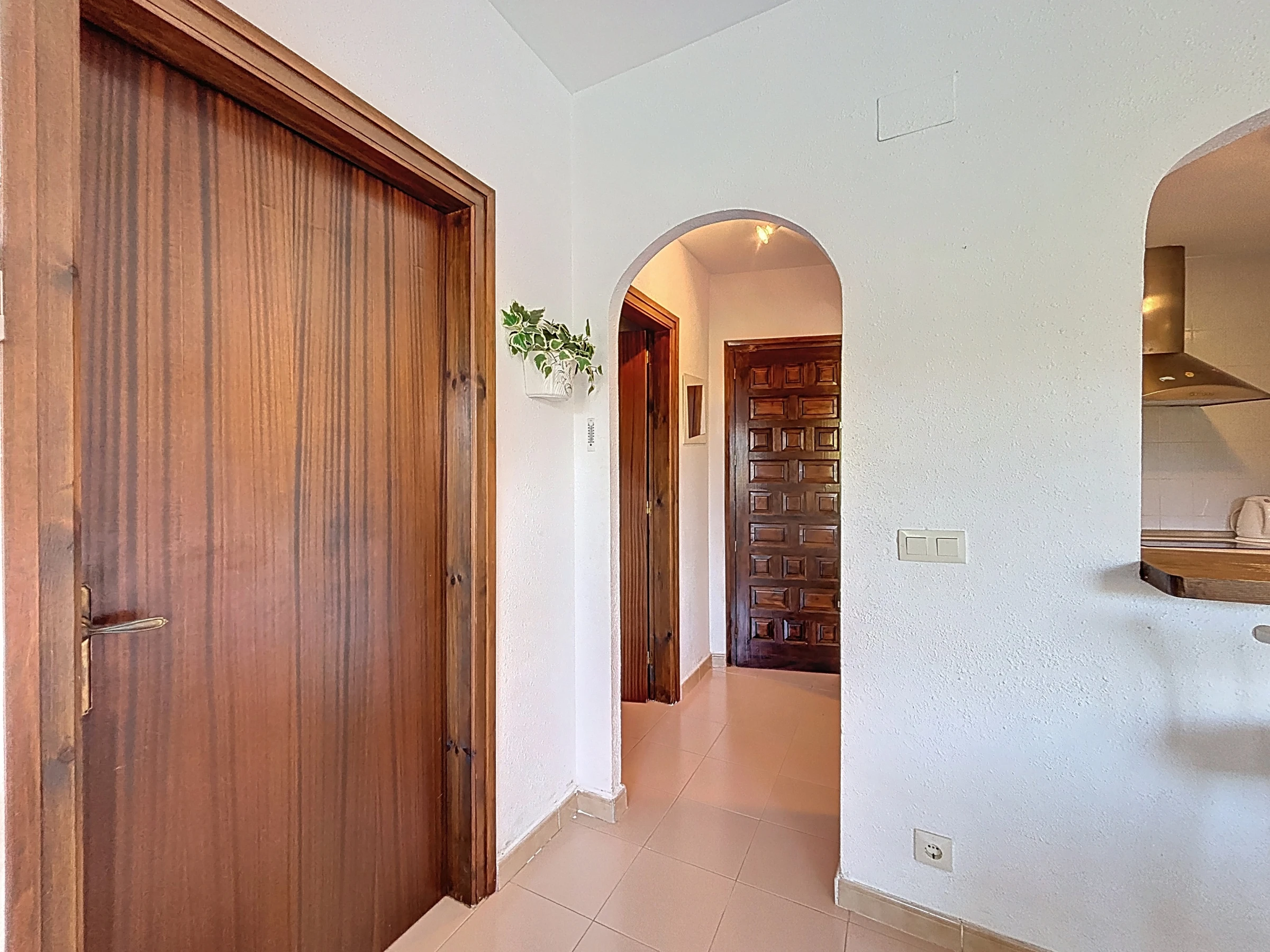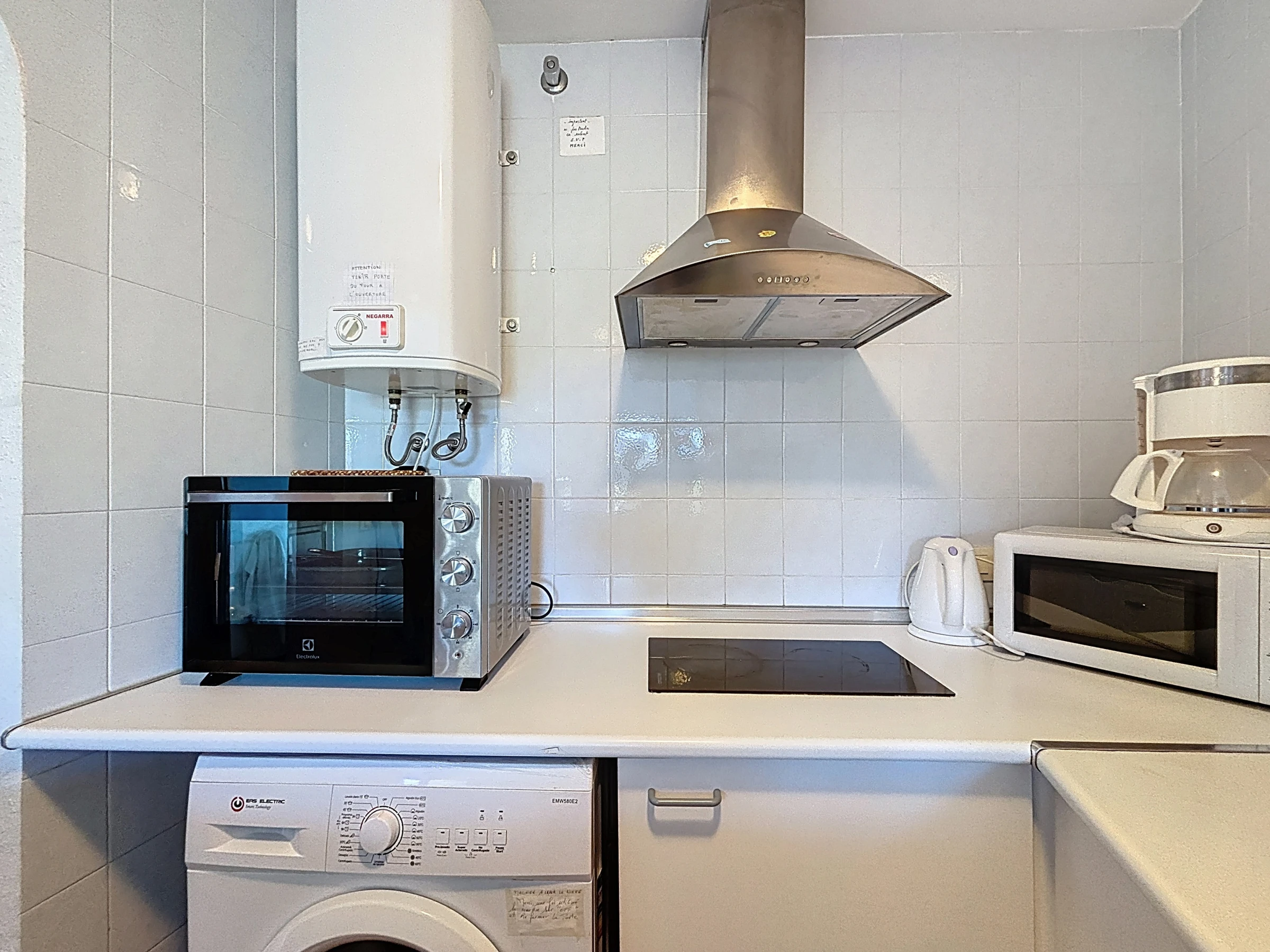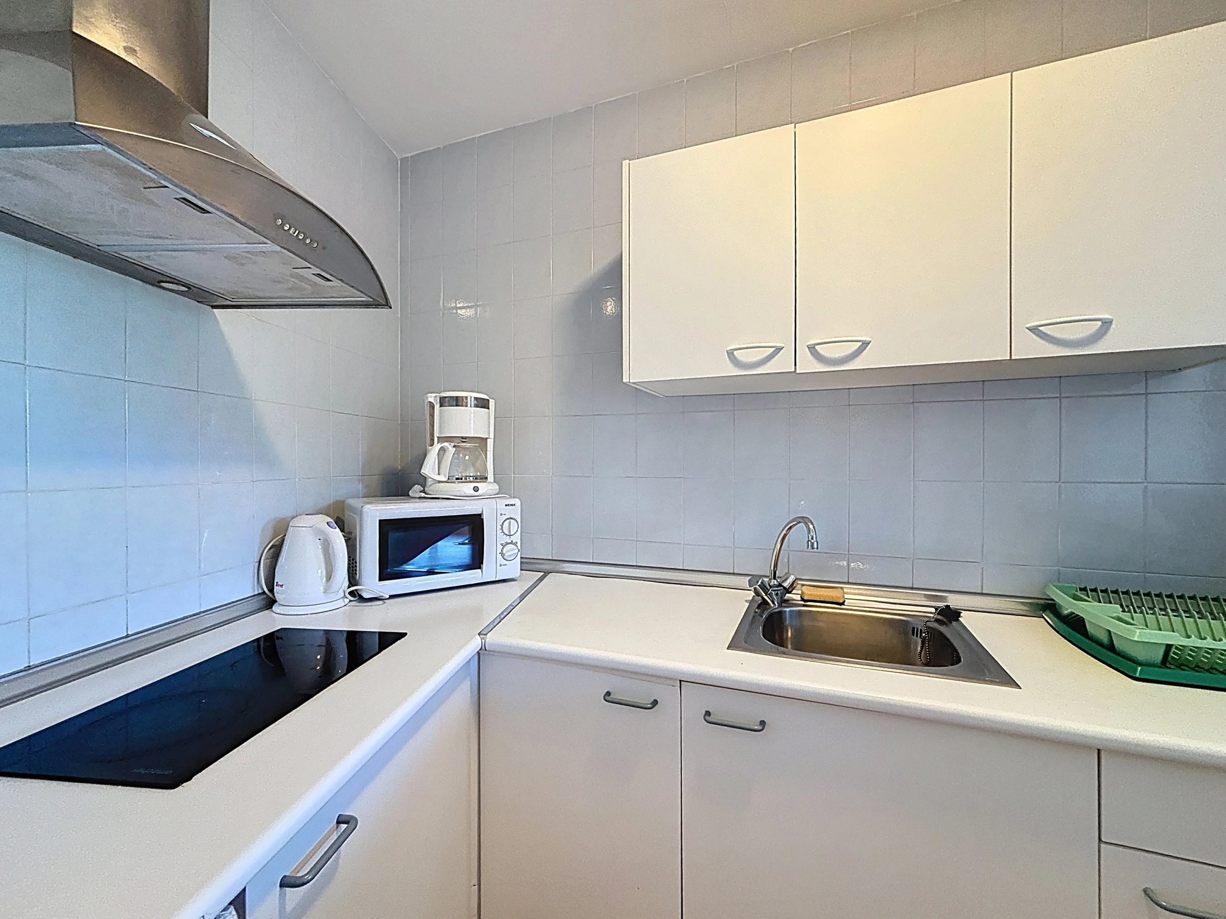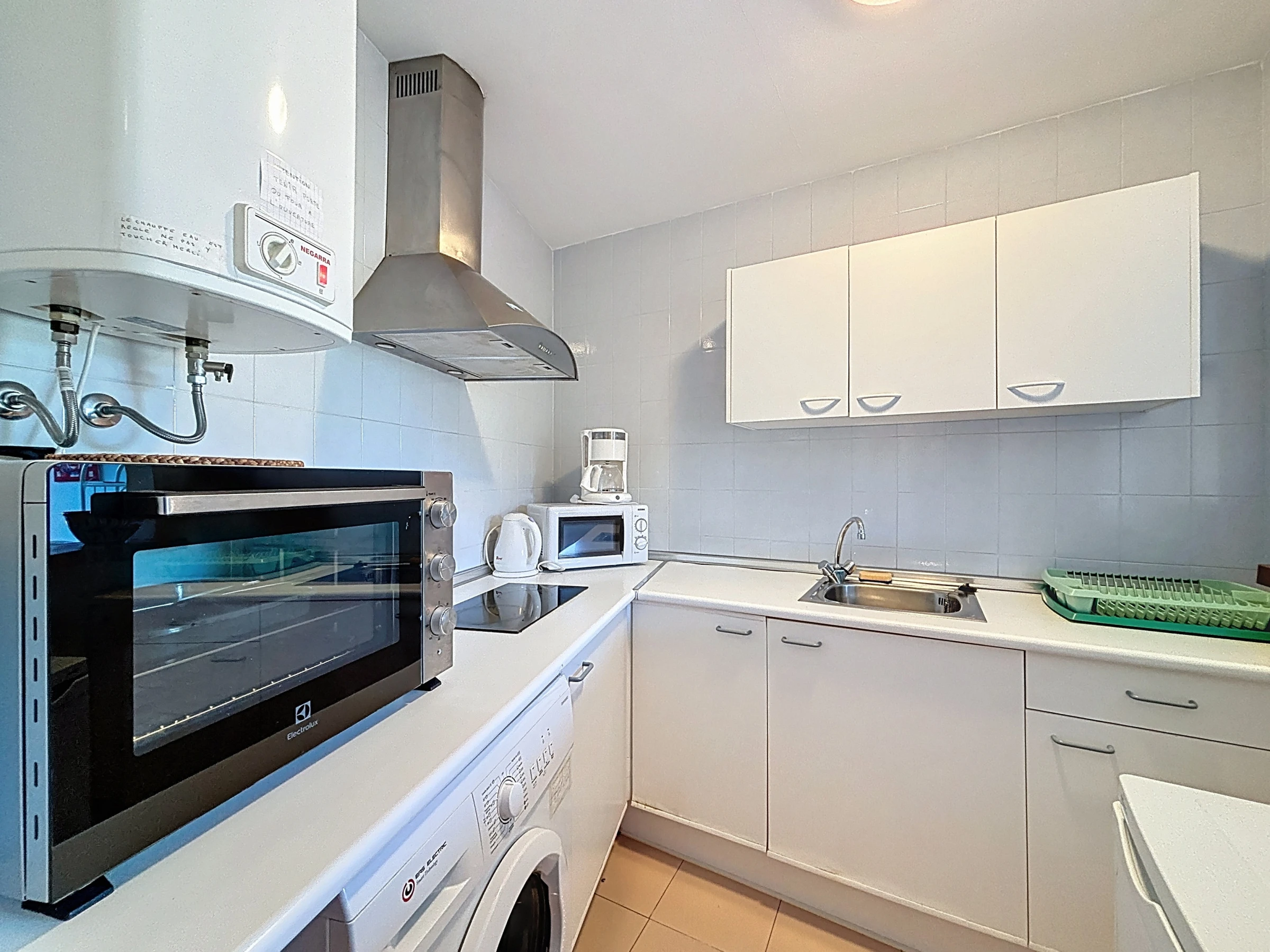 Die Wohnung verfügt über ein Schlafzimmer mit einem Doppelbett und einem zusätzlichen Schlafsofa, was eine flexible Unterbringung ermöglicht. Die offene Küche ist vollständig ausgestattet mit modernen Geräten wie einem Kühlschrank, einem Ofen, einer Mikrowelle, einer Kaffeemaschine und einer Waschmaschine. Ein großer Fernseher mit französischen und spanischen Sendern vervollständigt den Wohnbereich.