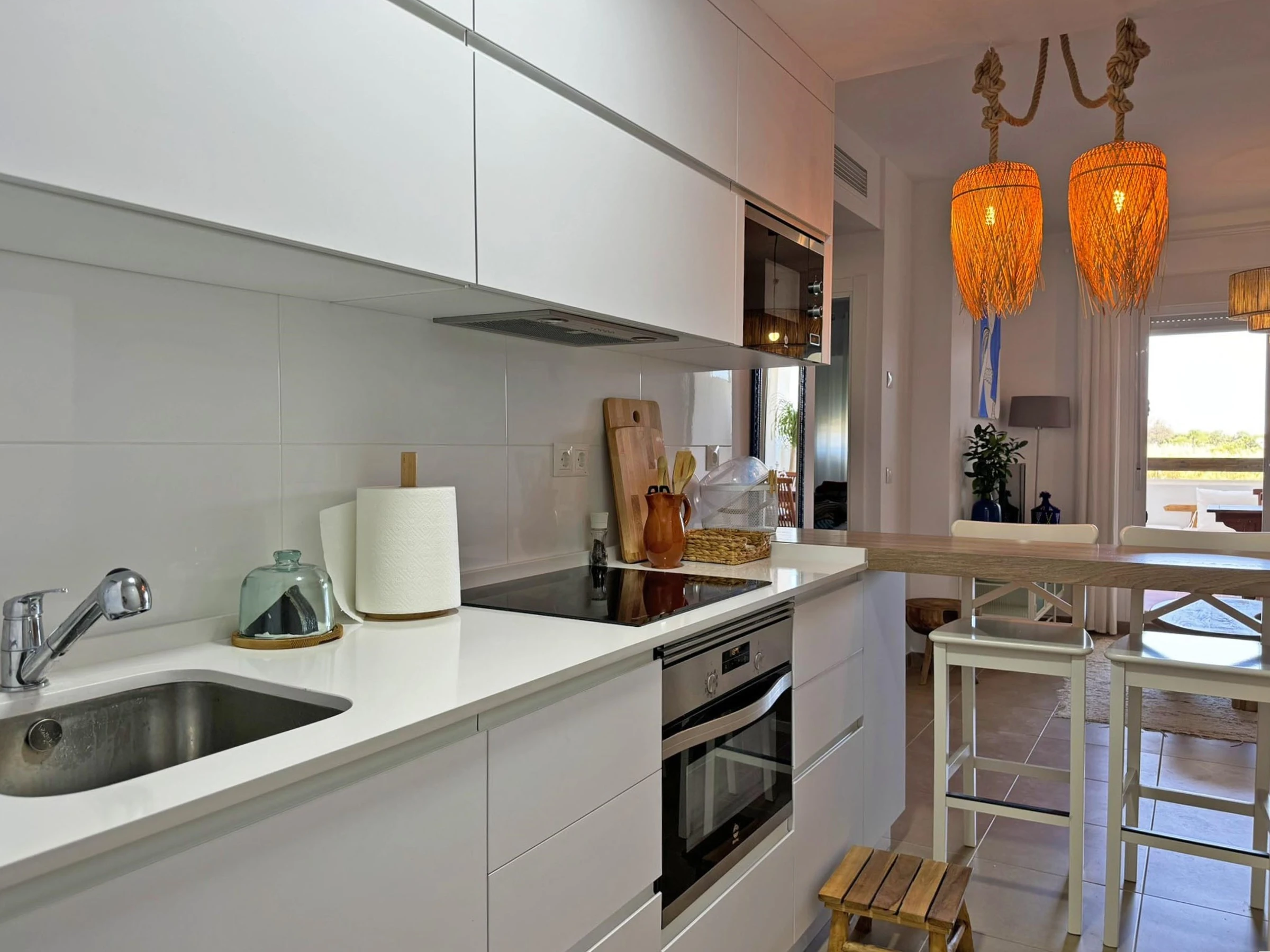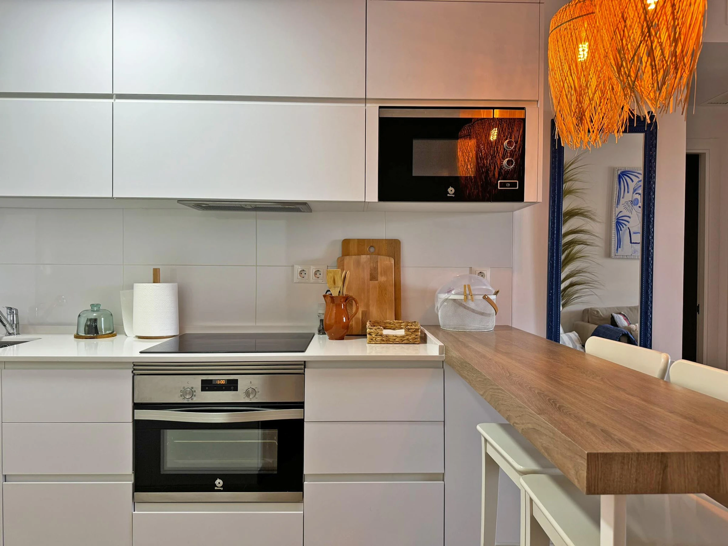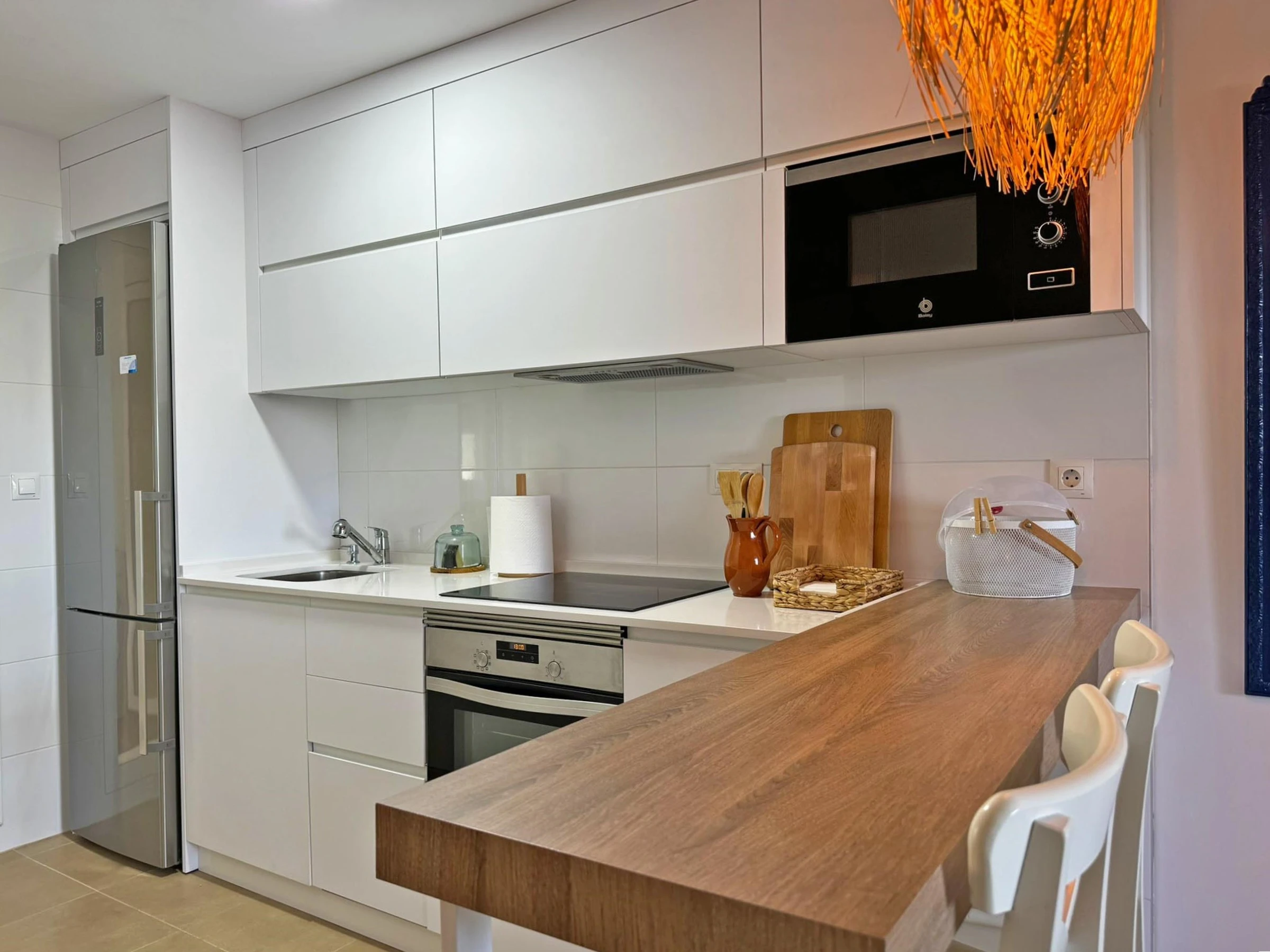 Dieses offene küche, mit ceranfeld, ist ausgestattet in kühlschrank, mikrowelle, backofen, gefrierschrank, spülmaschine, geschirr/besteck, kochutensilien, kaffeemaschine, toaster, wasserkocher und herdplatte.