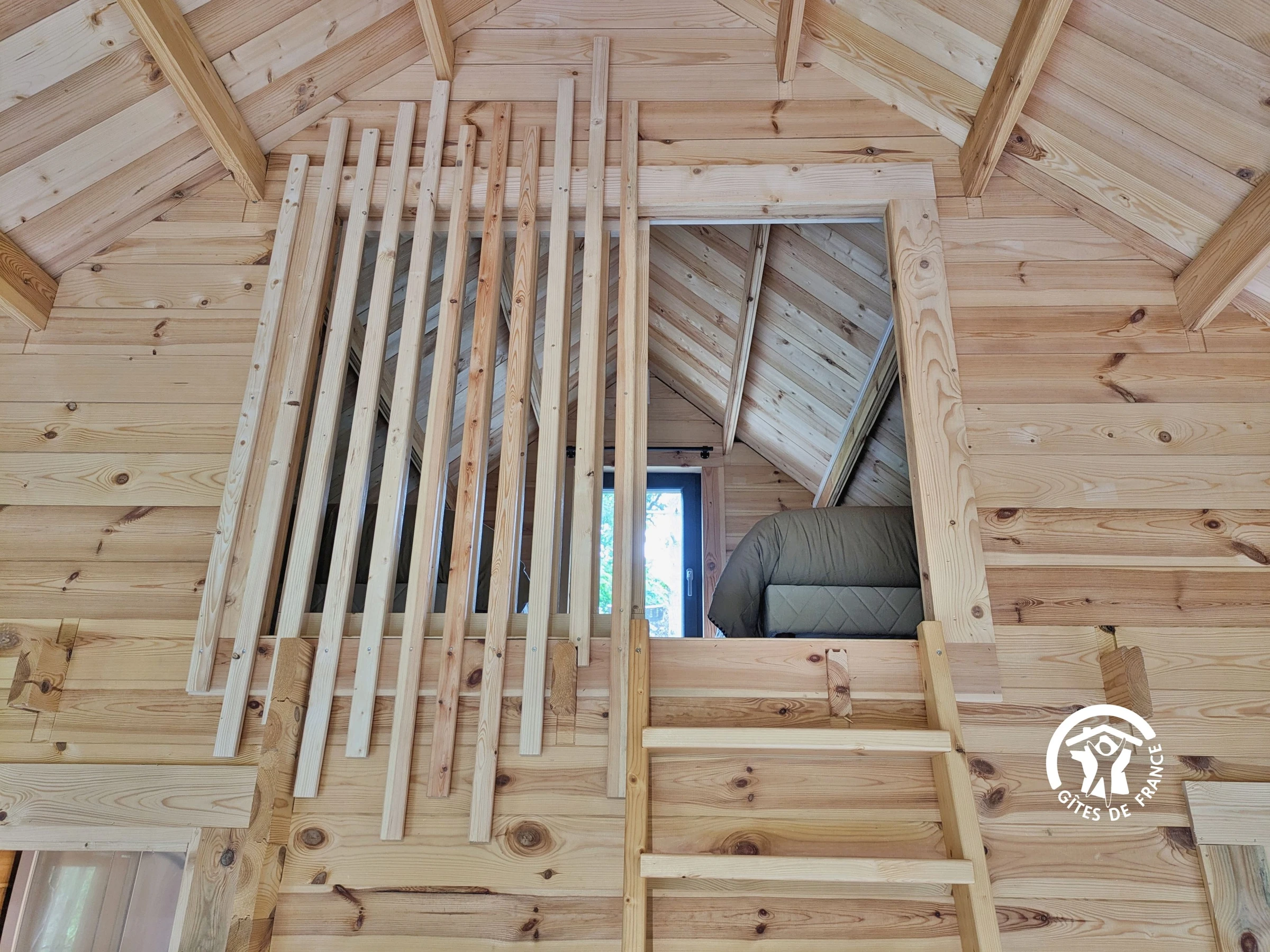 Auf der Galerie, erreichbar über eine steile Leiter (nicht für Kinder unter 6 Jahren geeignet), befinden sich zwei Einzelbetten (80 x 190 cm), zwei Nachttische und ein Treppenschutzgitter.