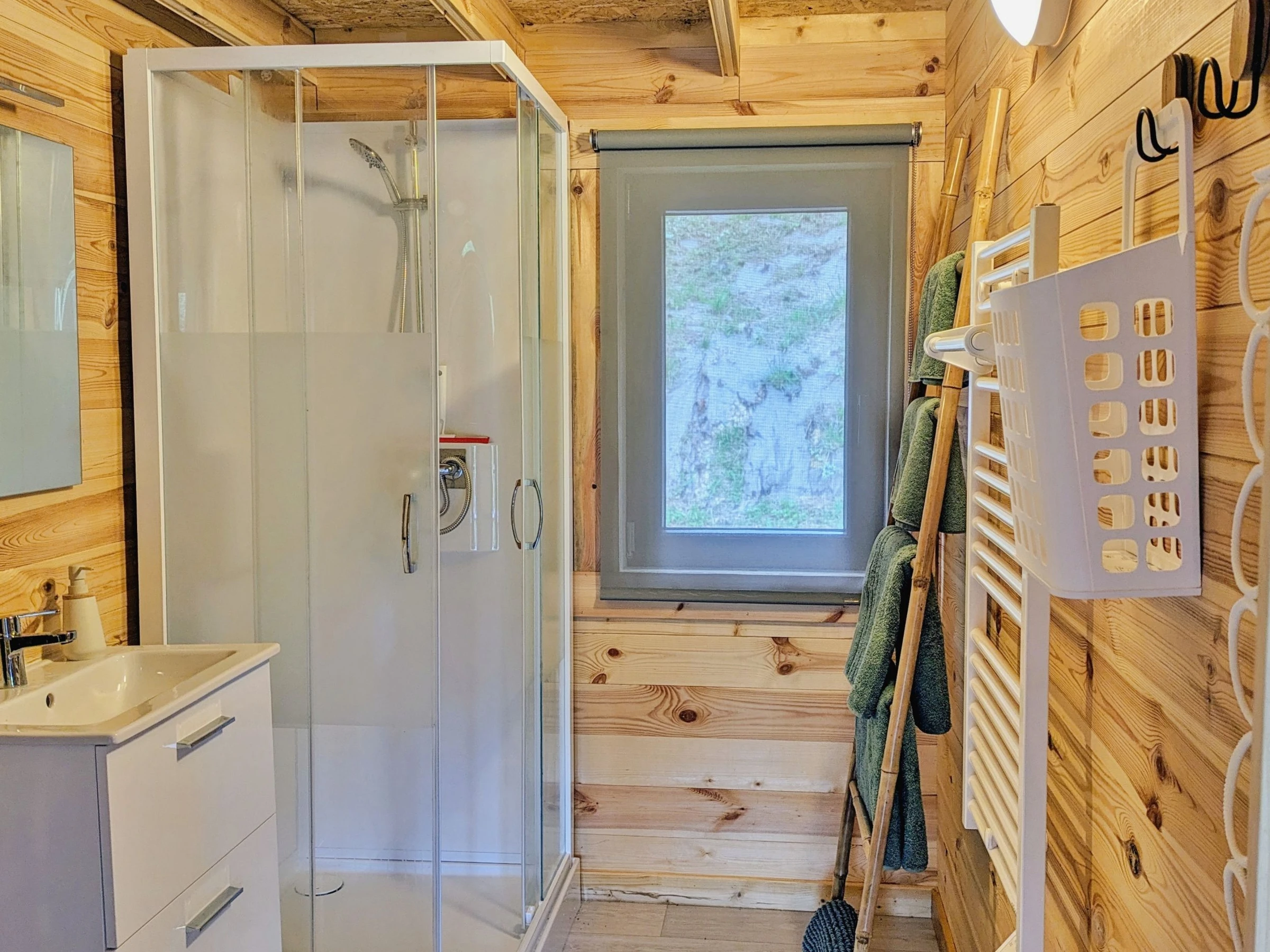 Geschäftsreisende: Maximal 2 Erwachsene bei Buchungen ab 1 Monat, 3 Personen bei maximal 4 Nächten. 39 m² großes Holzchalet. Zugang über eine 13 m² große Terrasse (ohne Geländer) mit Gartenmöbeln. Ebene 0: Wohnzimmer mit Kochnische (Kühlschrank mit Gefrierfach, Mikrowelle, Elektroherd, Toaster, Wasserkocher, Filterkaffeemaschine), Esstisch und Hochstühlen, Sitzecke mit Sofa und Couchtisch – 1 Schlafzimmer mit zwei Einzelbetten (80 x 190 cm), die zu einem Doppelbett (160 x 190 cm) zusammengestellt werden können, Stauraum, Nachttisch, zwei Nachttische – Duschbad mit Dusche, Waschbecken, WC und Handtuchwärmer.