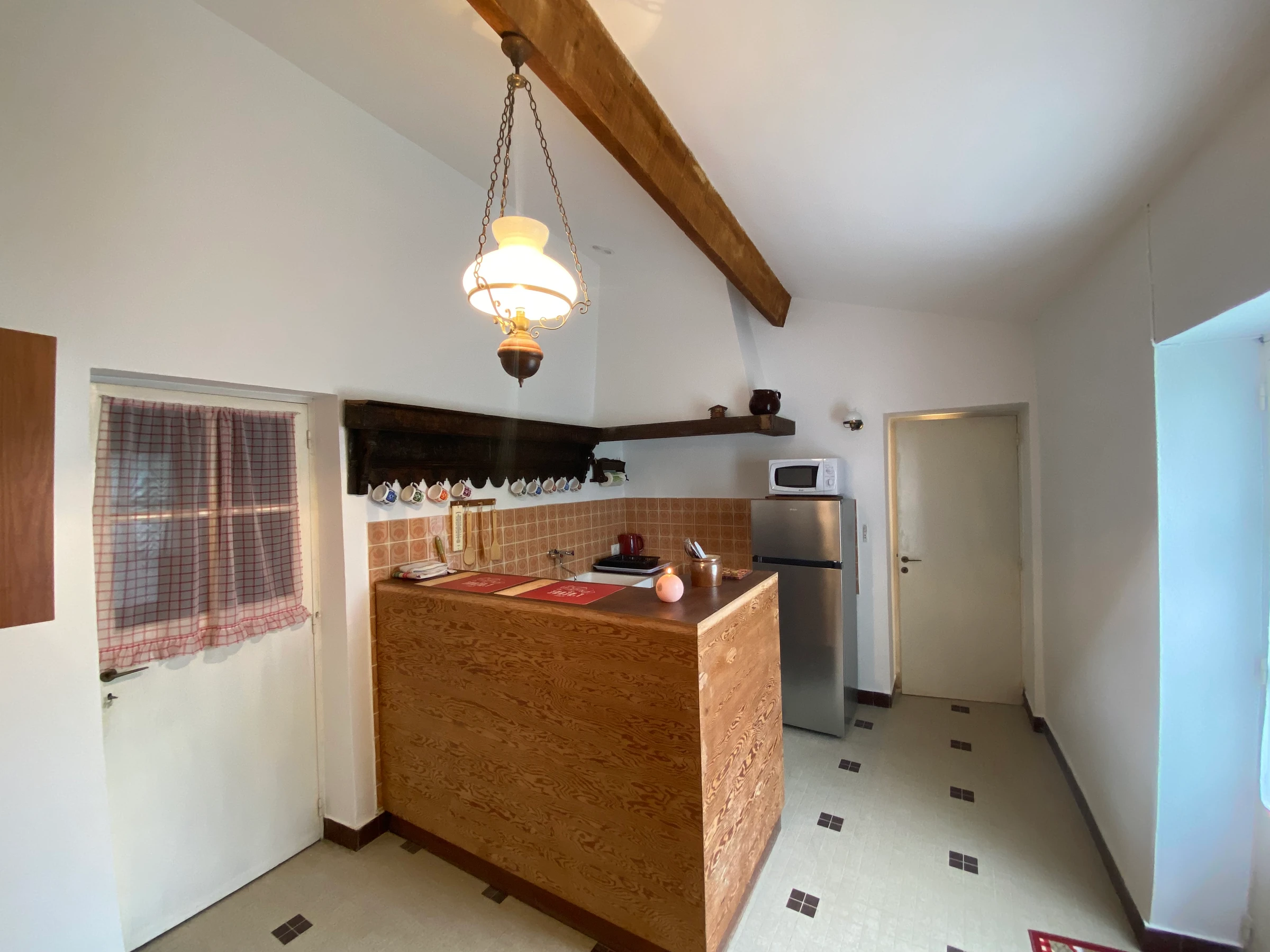 Heller Wohnbereich mit ausgestatteter Küche: Kühl-Gefrierschrank, Backofen, Glaskeramikkochfeld, Mikrowelle