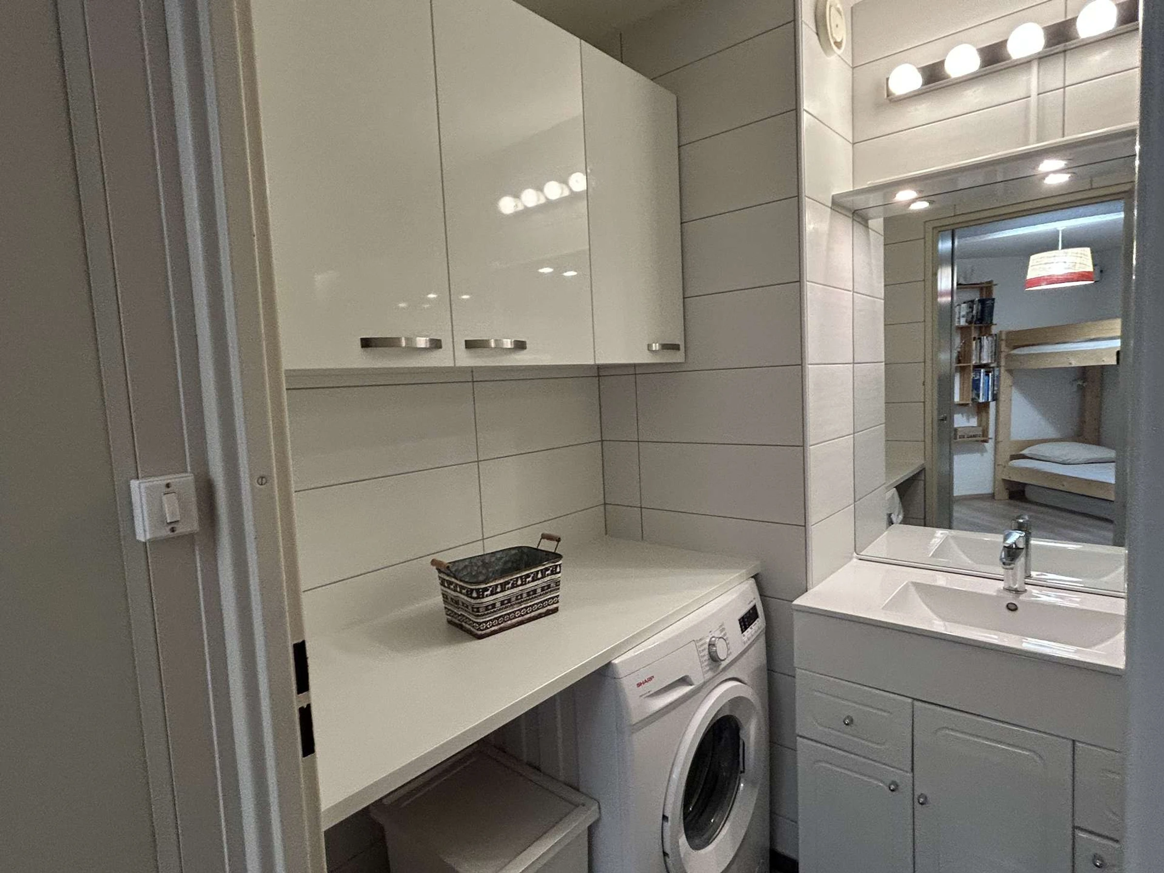 - Ein 2025 renoviertes Badezimmer mit Waschmaschine und Duschwand.