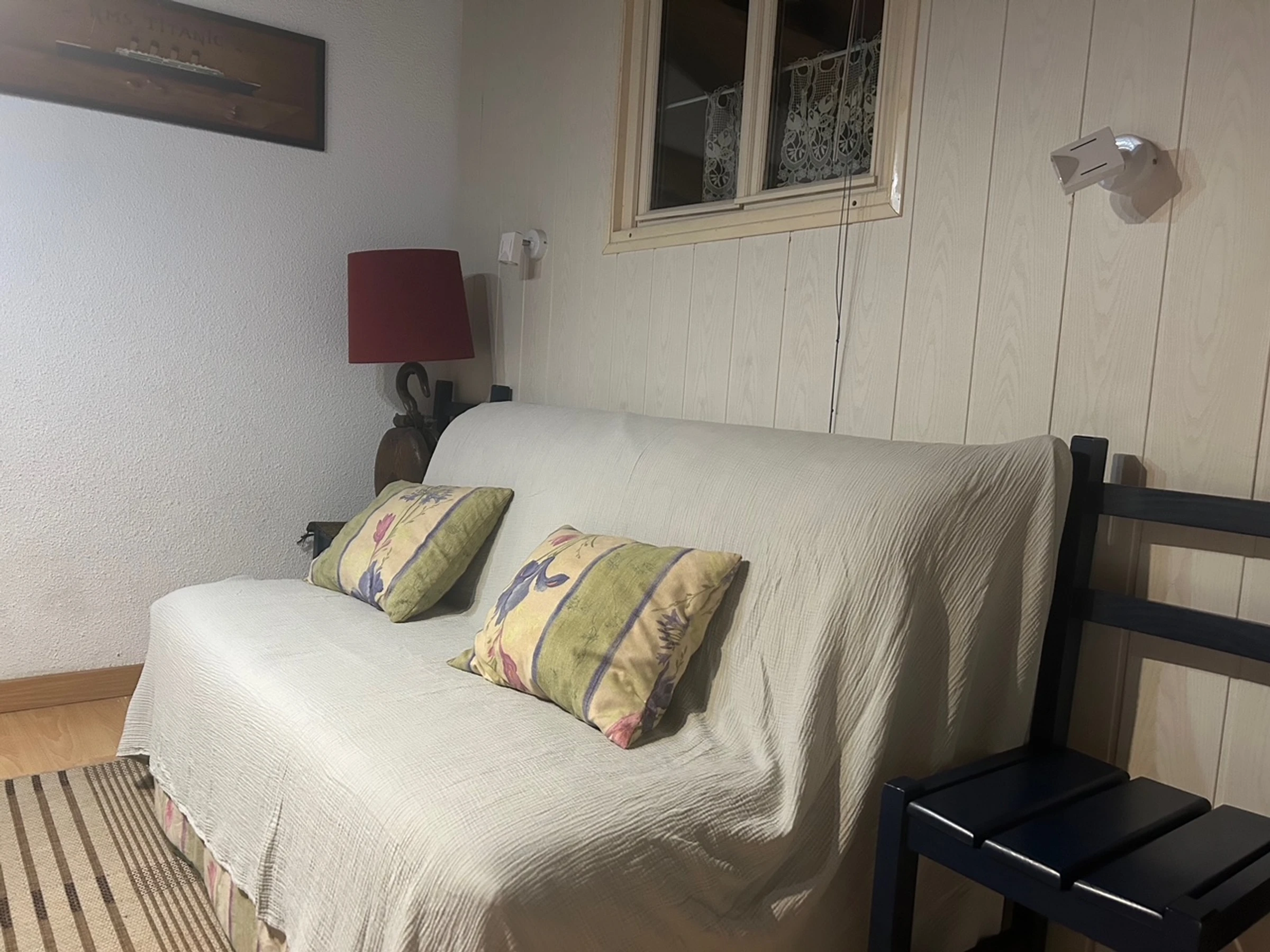 R+1, 1 Schlafzimmer (140 cm Bett), Schrank, 1 BZ-Sofa im Zwischengeschoss (2 Personen), Fernseher.