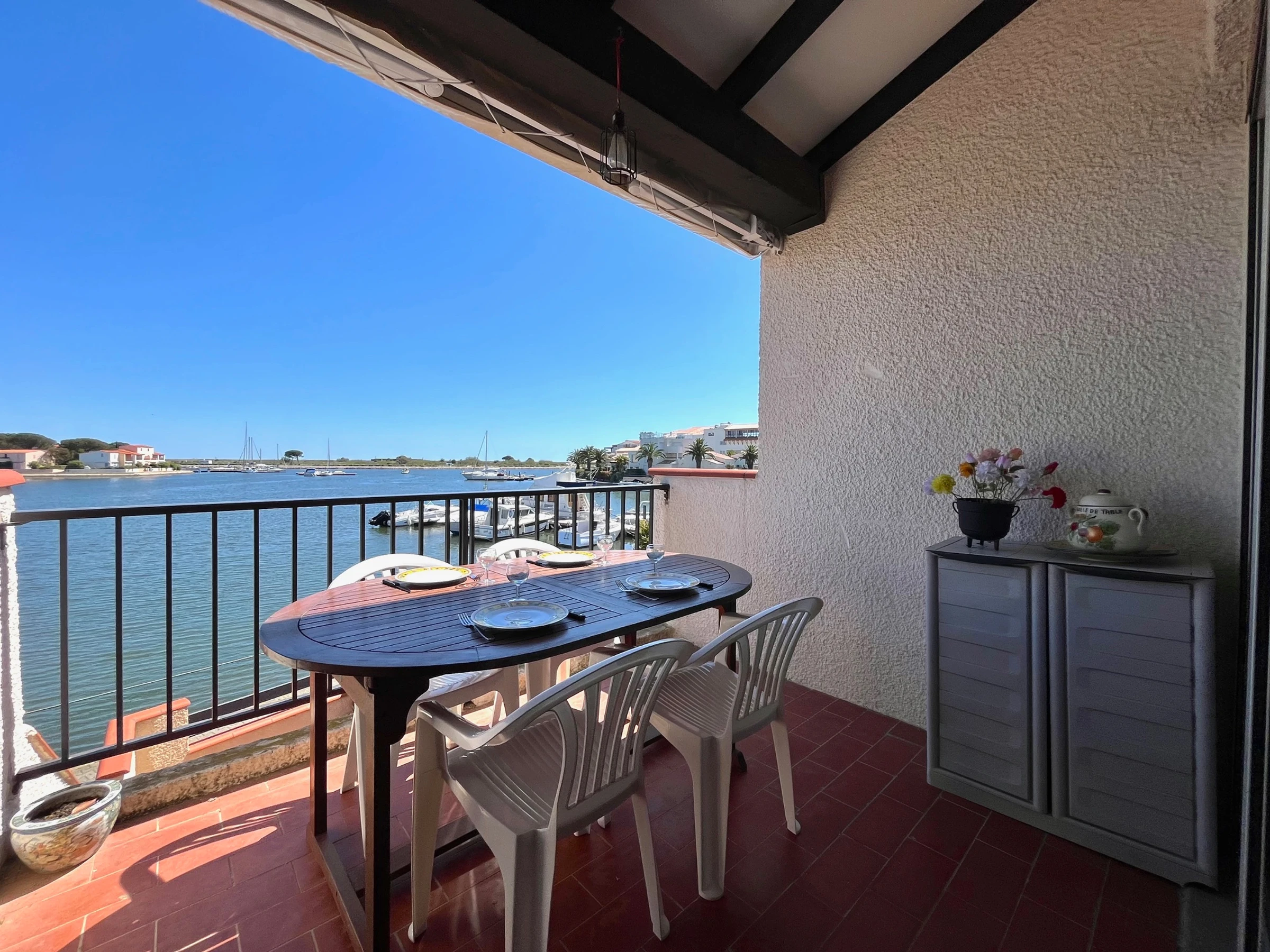 Willkommen in Saint-Cyprien, in dieser hellen Maisonette-Wohnung direkt am Strand – perfekt für einen Urlaub am Meer. Sie befindet sich im ersten Stock und verfügt über eine geräumige Terrasse mit herrlichem Blick auf die Lagune, ideal zum Entspannen oder für ein gemeinsames Essen im Freien.