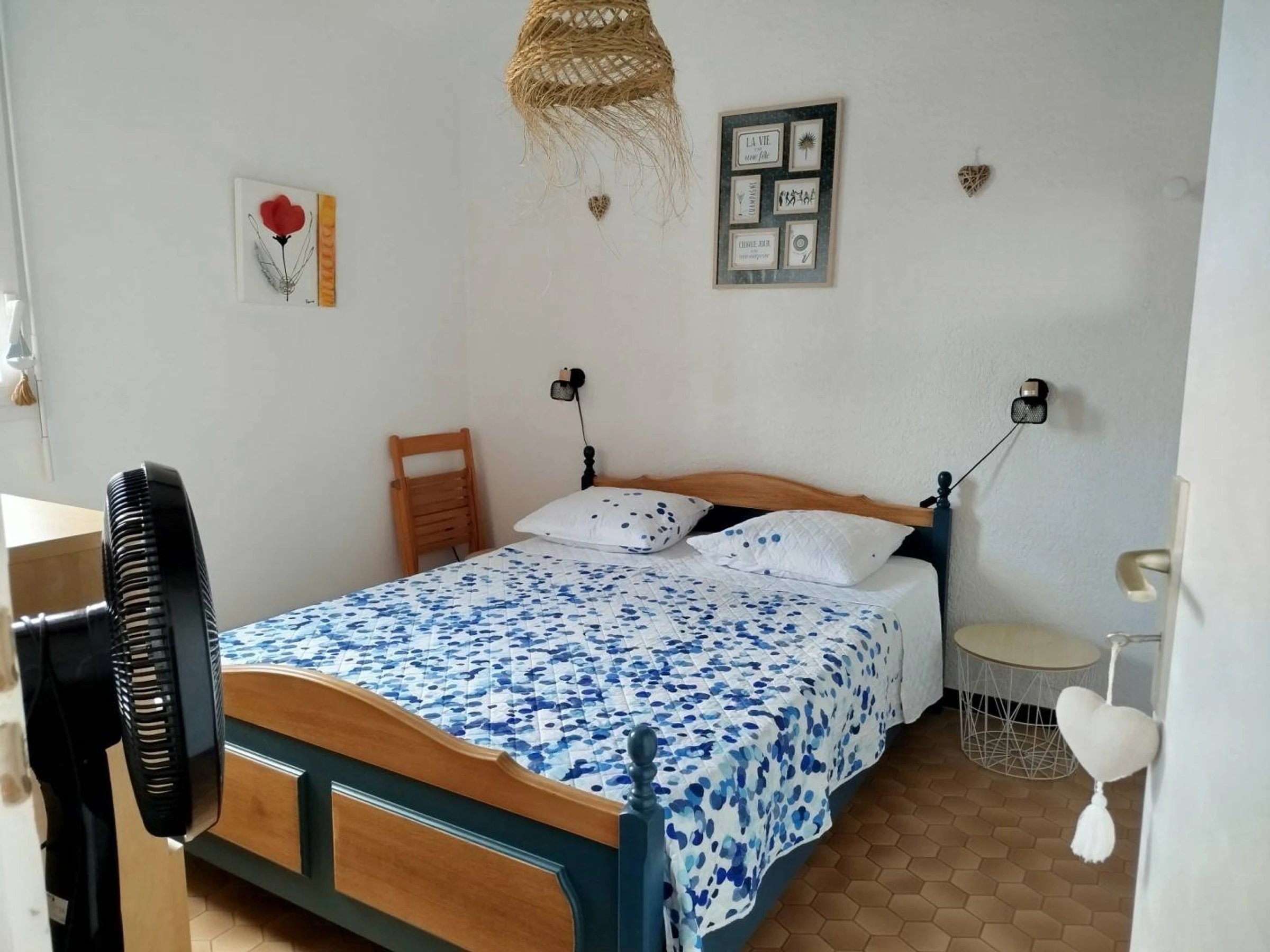 Schlafzimmer mit Doppelbett und Abstellraum.
