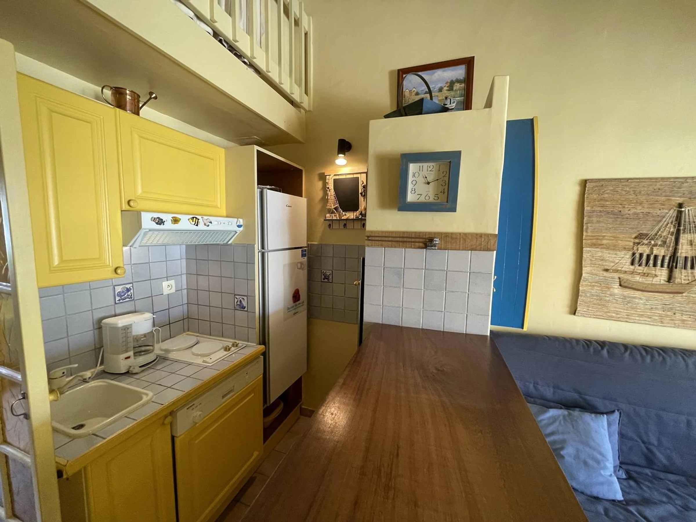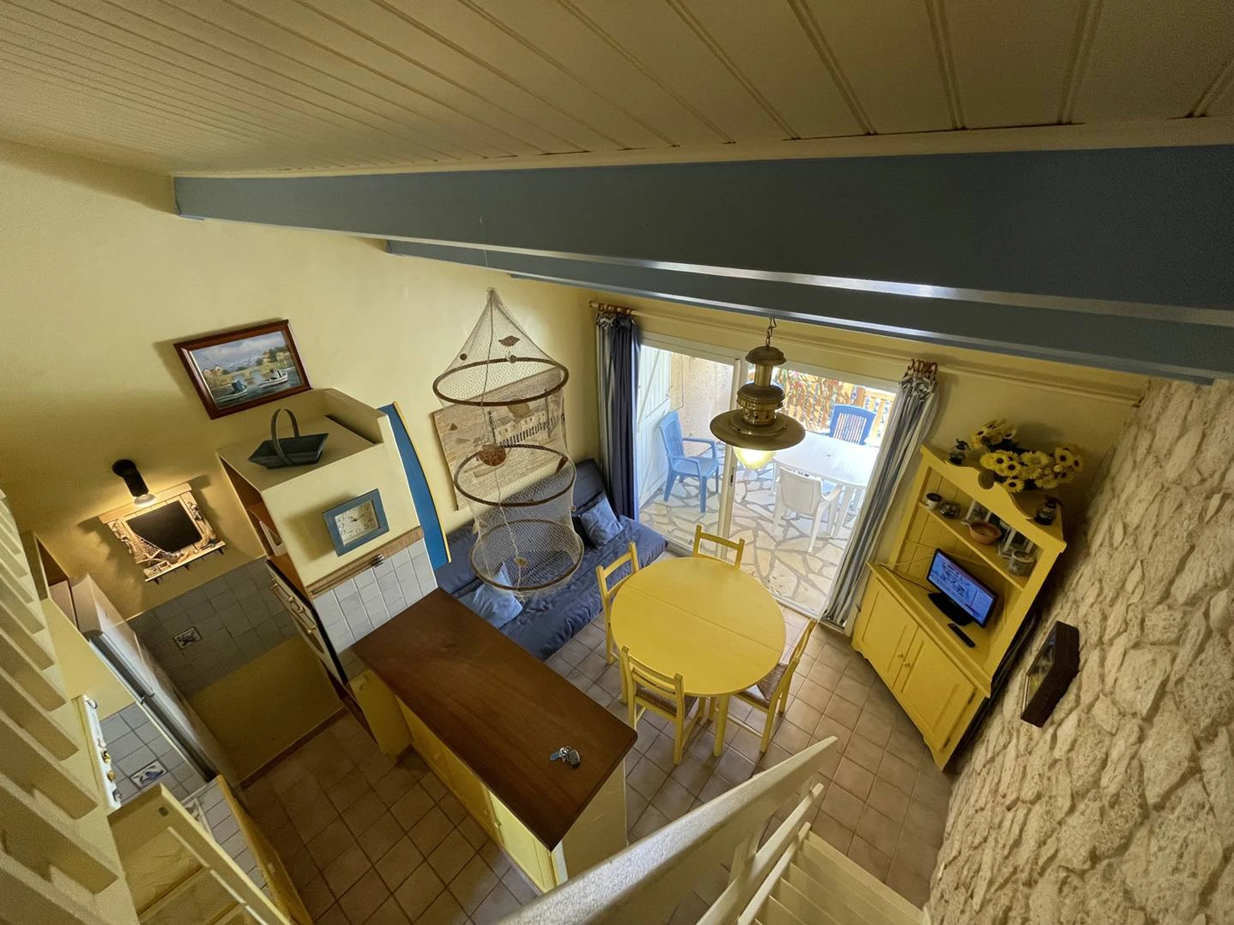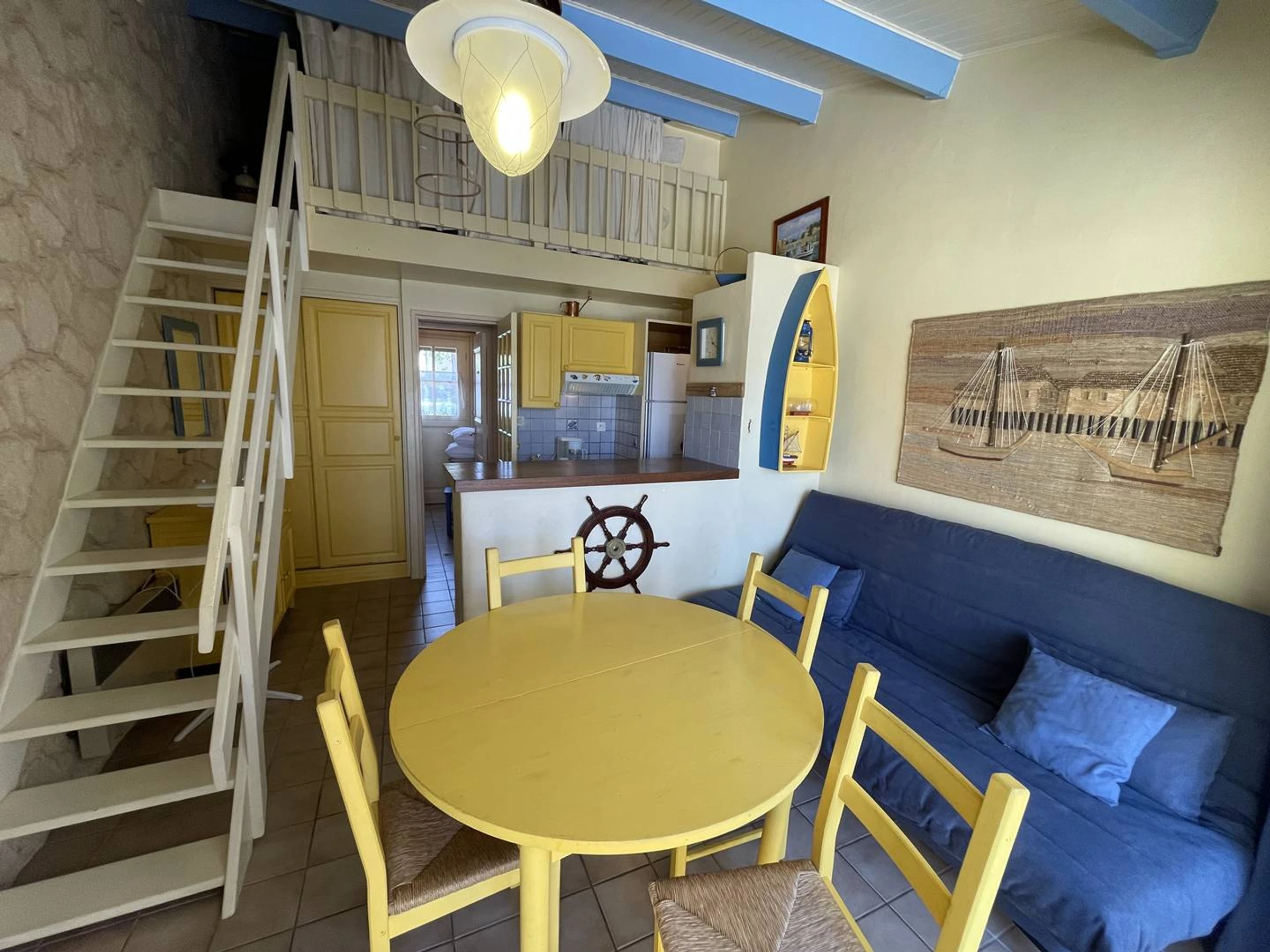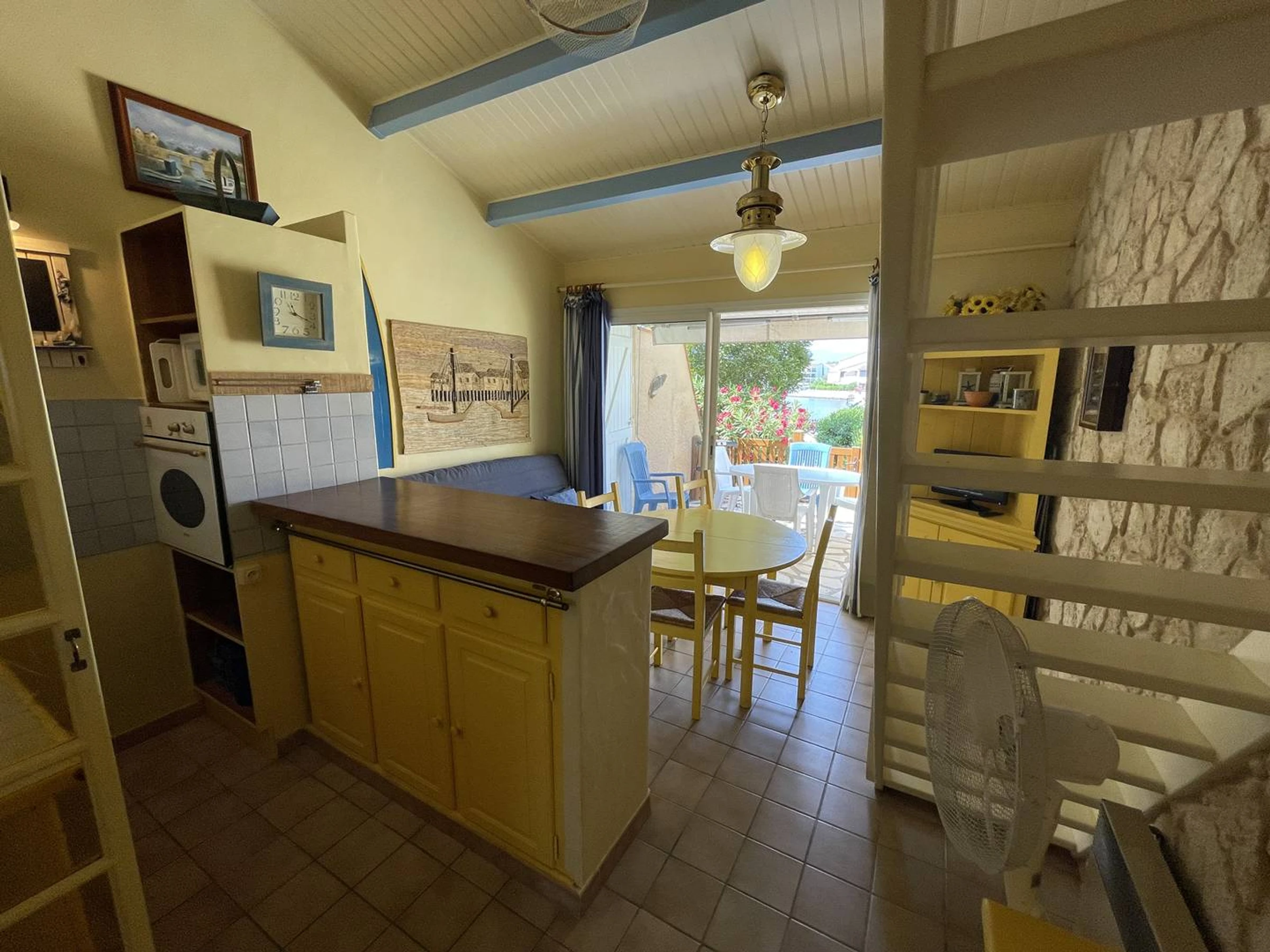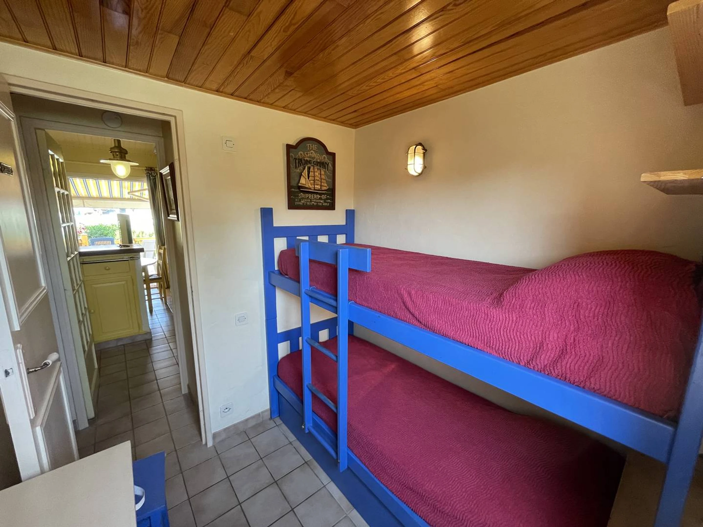 Angenehmes Ferienhaus mit zwei Seiten, eingerichtet im maritimen Stil. Es verfügt über ein Studio-Mezzanin auf zwei Seiten (ca. 35 m²) mit einer 12 m² großen, eingezäunten Terrasse mit Elektrogrill, Rollläden und Gartenmöbeln. Freier Blick nach Westen auf die Pontons und das Wasser der Marinas. Ausgestattete Küche: 2 Elektrokochfelder, Kühl-/Gefrierkombination, Mikrowelle, Kaffeemaschine, Geschirrspüler, Backofen, Dunstabzugshaube usw. Wohnzimmer mit 130 cm breitem Schlafsofa (2023), kleinem Fernseher und Kiefernholzmöbeln. Duschraum (Duschkabine), separates WC. 1 Kabine mit zwei 70 cm breiten Etagenbetten (190 cm) (Matratzen 2021), Kleiderschrank. Obergeschoss: Unteres Zwischengeschoss mit einem 140 cm (190 cm) breiten Bett (Matratze 2021), Schränken mit Waschmaschine. 6 englische Kissen, Bügelset und Wäscheständer sind vorhanden. Privater Parkplatz Nr. 19 in einer sicheren Residenz in der Nähe des Hauses. Sehr ruhige Lage, umgeben von Grün, direkt am Wasser, ca. 300 m vom Strand Pont Roulant und dem Einkaufszentrum Capellans entfernt. Kleine Haustiere erlaubt.