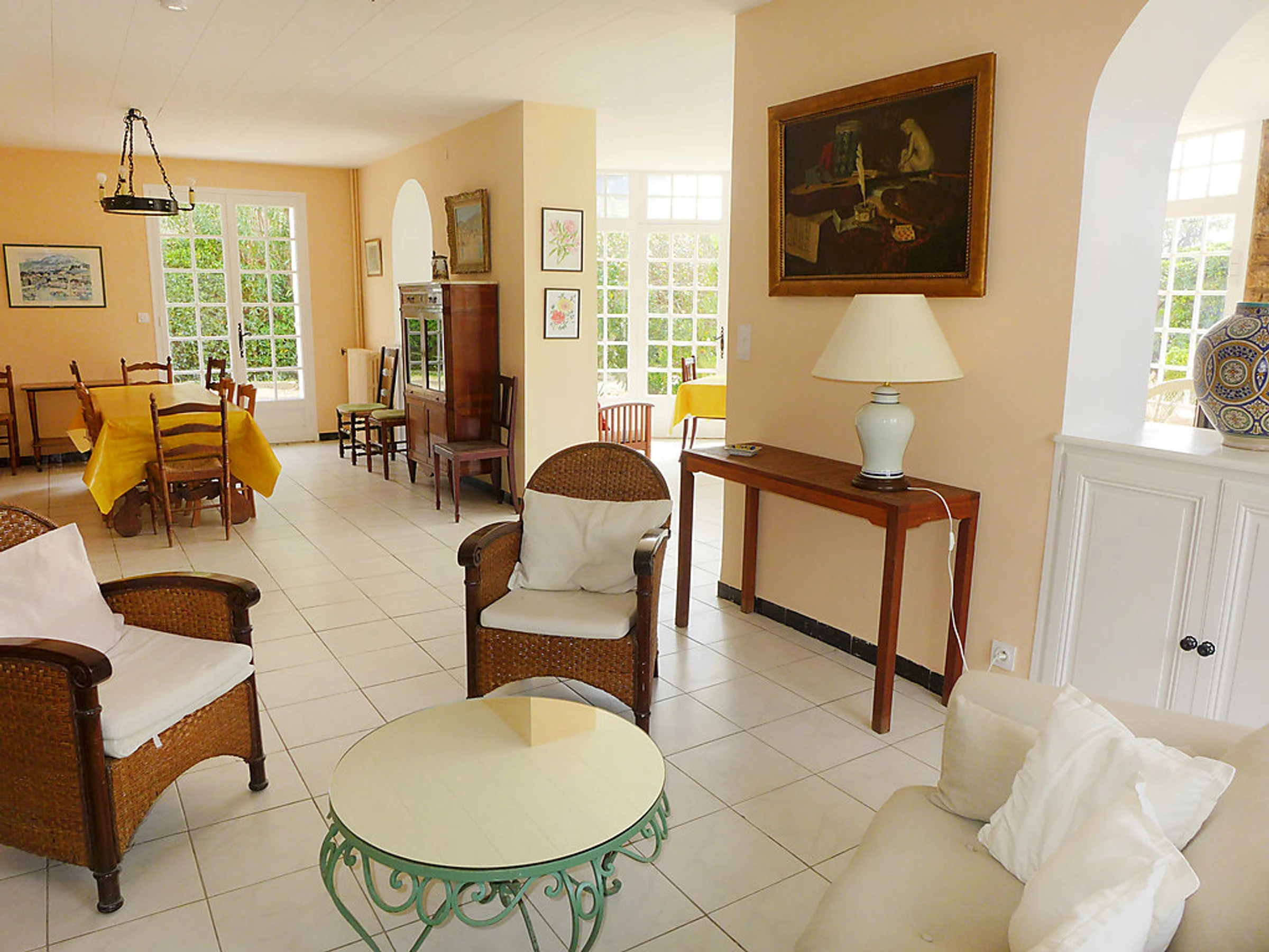 8-Zimmer-Haus 300 m2 auf 3 Stockwerken. Komfortabel und schön eingerichtet: Wohn-/Esszimmer mit Esstisch und TV (Flachbildschirm). Ausgang zum Garten. 1 Zimmer mit 1 franz. Bett (140 cm, Länge 190 cm). Ausgang zum Garten. Küche (Backofen, Geschirrspüler, 4 Glaskeramikherd Platten, elektrische Kaffeemaschine). Bad/WC, sep. WC. Obergeschoss: 2 Zimmer, jedes Zimmer mit 1 franz. Bett (140 cm, Länge 190 cm). Ausgang zur Terrasse. 1 Zimmer mit 1 franz. Bett (140 cm, Länge 190 cm), Waschbecken und Bidet. 1 Zimmer mit 2 Betten (90 cm, Länge 190 cm). Ausgang zur Terrasse. Bad, Dusche, sep. WC. 2. Obergeschoss: 1 Zimmer mit 1 franz. Bett (140 cm, Länge 190 cm), Waschbecken und Bidet. 1 Zimmer mit 2 Betten (80 cm, Länge 190 cm). Terrasse 15 m2, Garten, Südlage und Westlage. Terrassenmöbel. Sicht auf das Meer. Zur Verfügung: Waschmaschine, Bügeleisen. Internet (Wireless LAN, gratis). Parkplatz (4 Autos). Bitte beachten: 1 Haustier/Hund erlaubt. TV nur FR. Rauchmelder. Obligatorische Extra Dienstleistungen vor Ort: Kurtaxe Kinder (pro Person/Tag), Kurtaxe Babys (0-2) (pro Person/Tag), Kurtaxe 0.83EUR pro Person/Tag