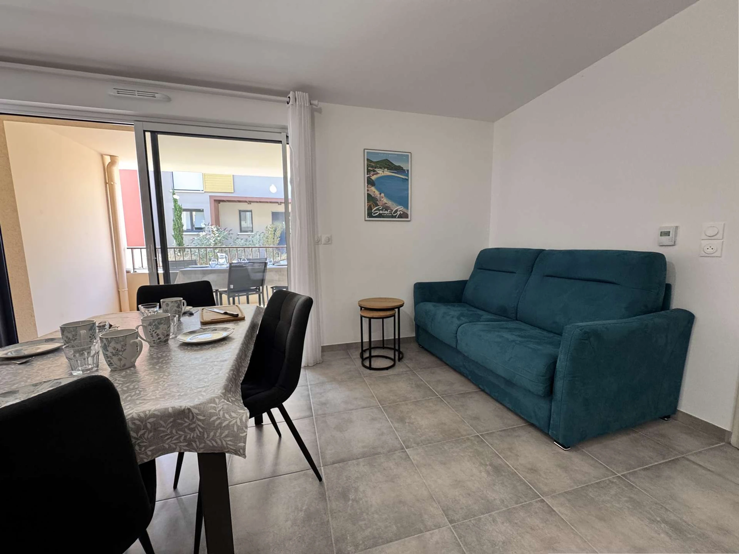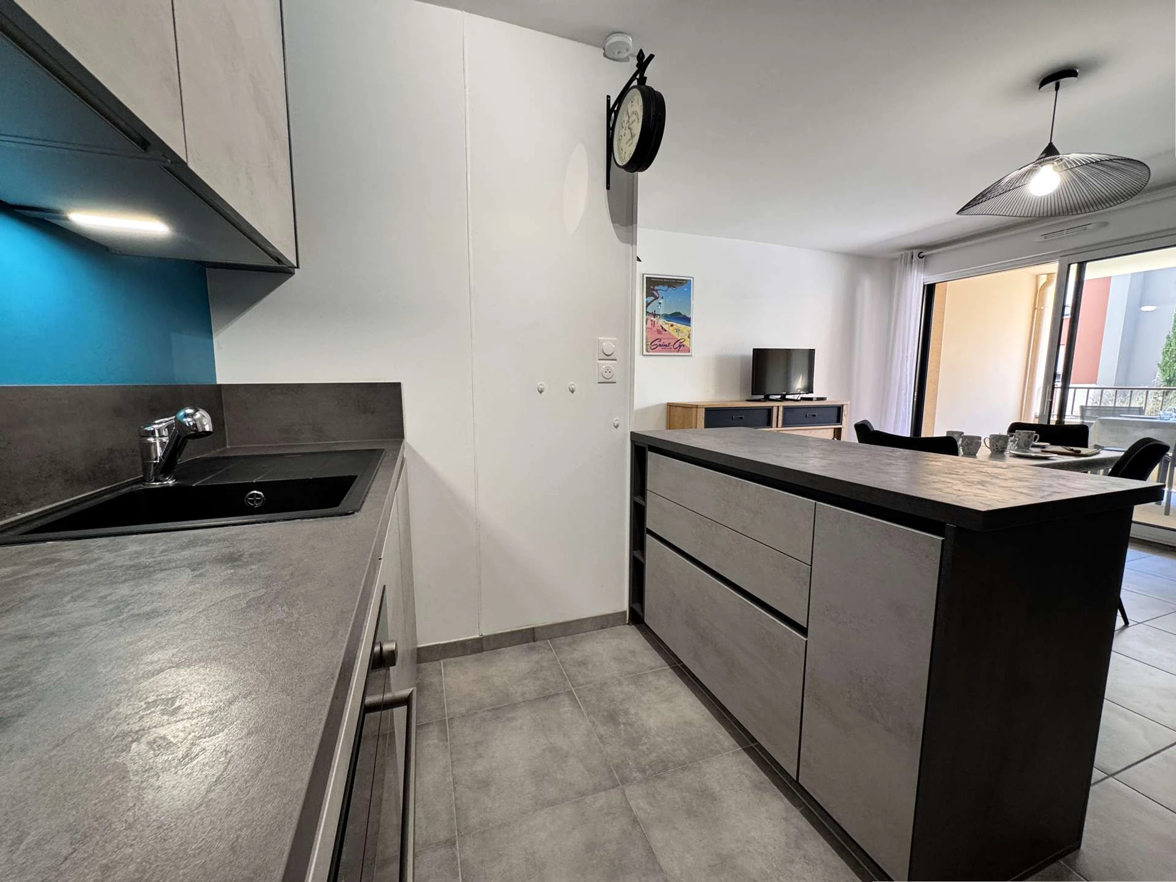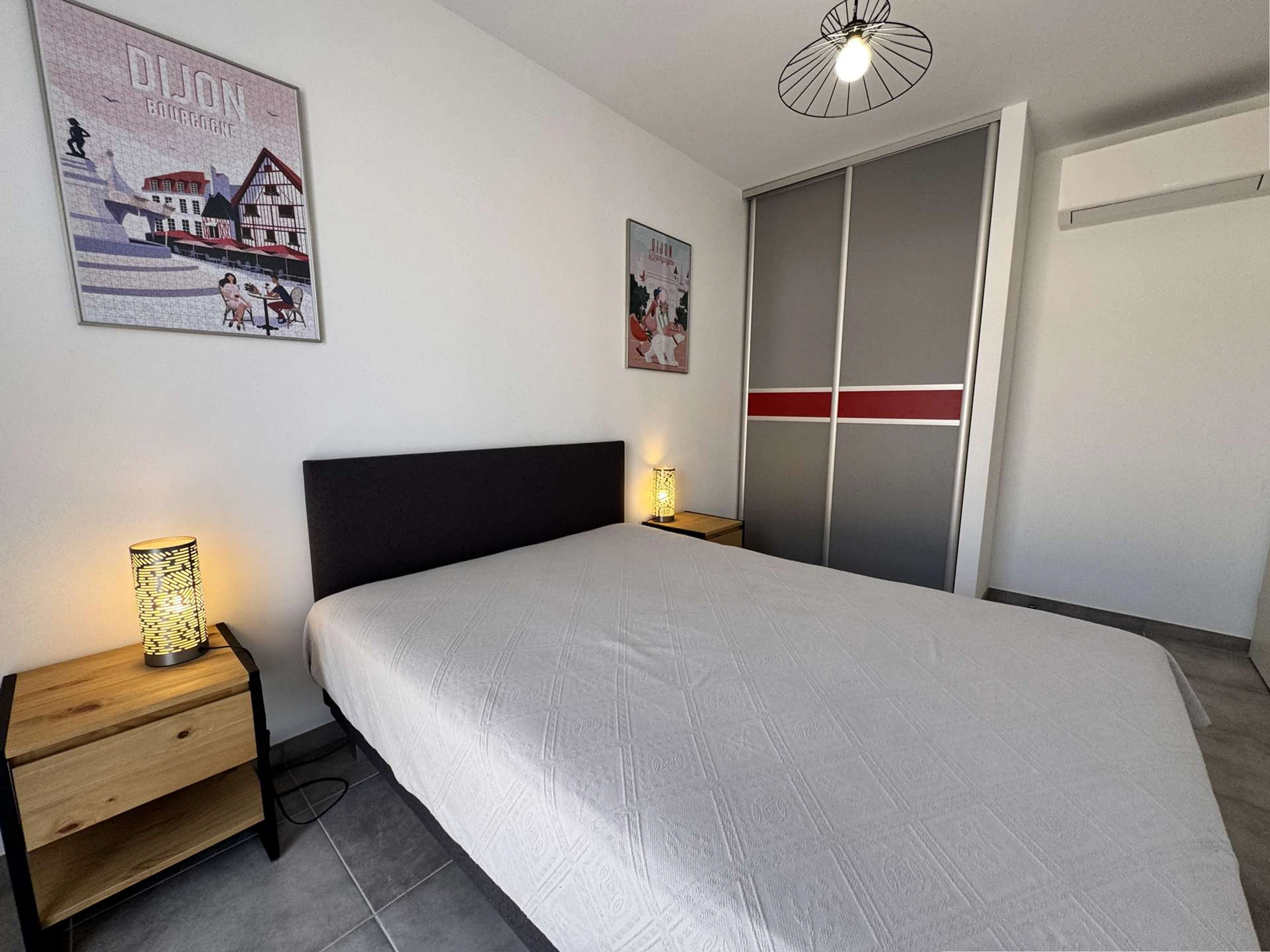 Die Wohnung befindet sich im Erdgeschoss und verfügt über ein Wohnzimmer mit einer voll ausgestatteten offenen Küche, die sich auf eine 11 m² große, überdachte Terrasse erstreckt. Sie besteht aus zwei Schlafzimmern, jeweils mit einem Doppelbett (eines davon ein Queensize-Bett) und Klimaanlage. Außerdem gibt es ein Badezimmer mit WC.