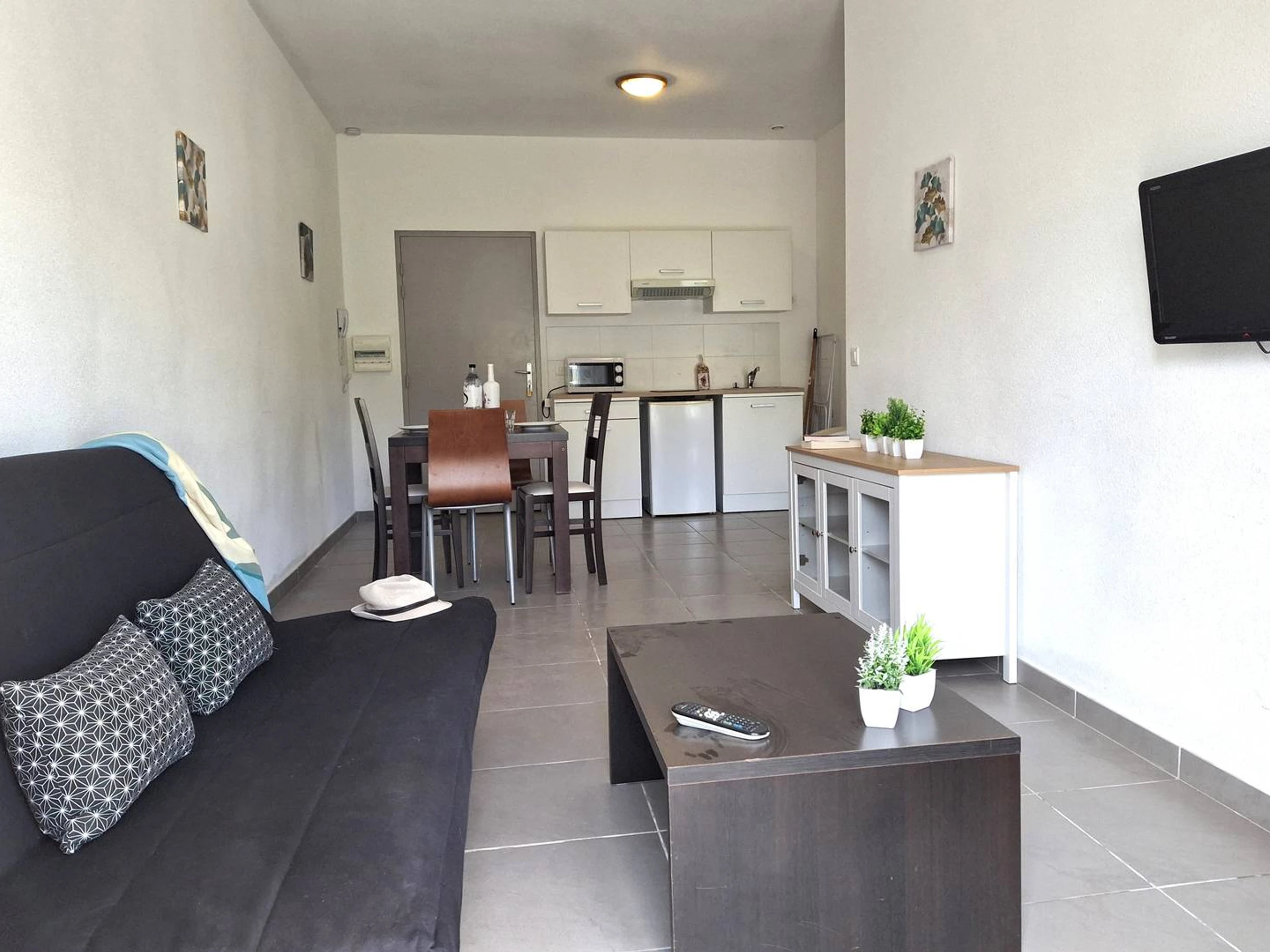 Klimatisiertes Wohnzimmer: Schlafsofa, TV, offene Einbauküche (Kochfeld, Dunstabzugshaube, Kühlschrank, Mikrowelle) und Essbereich