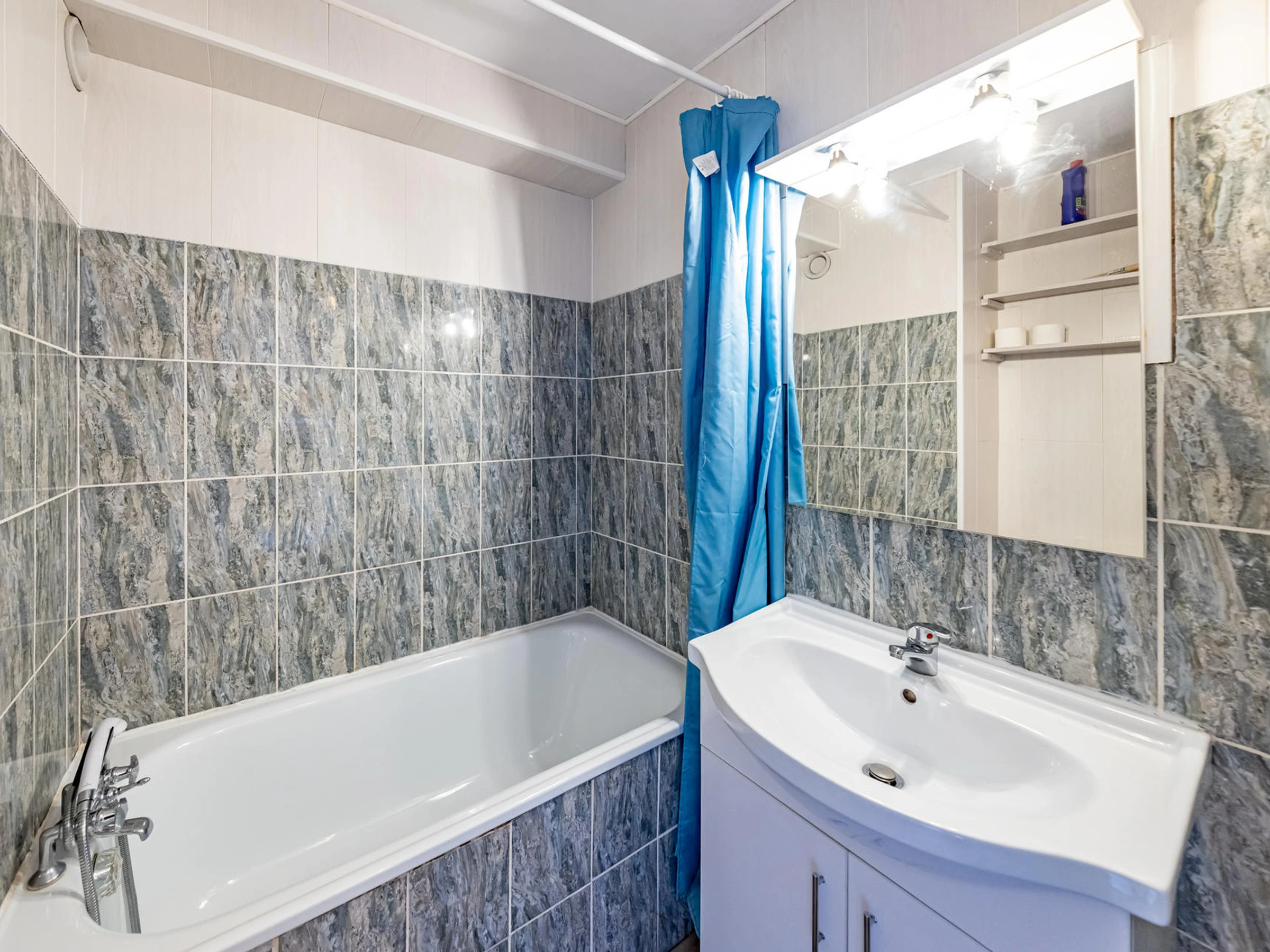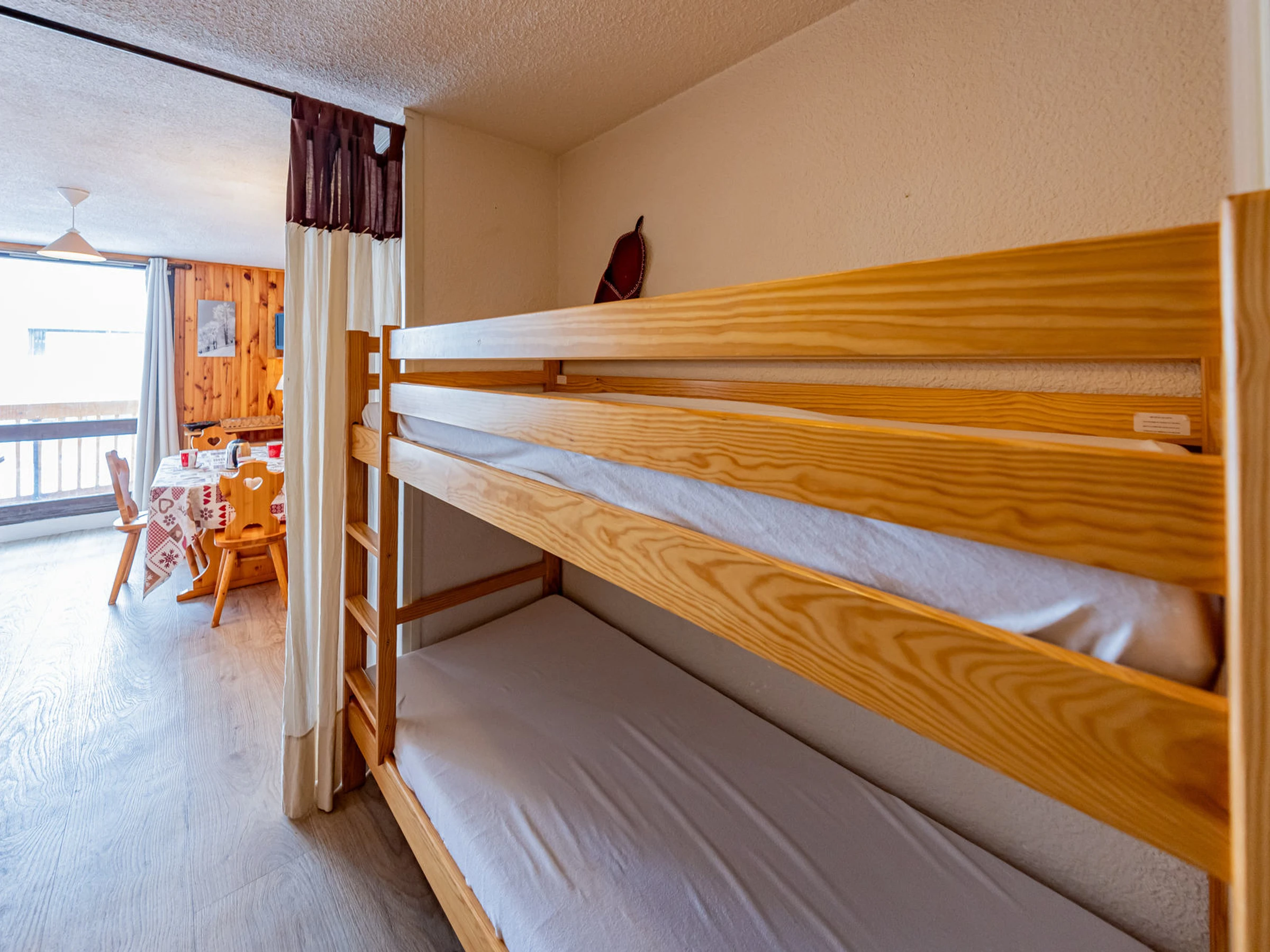 - Schlafbereich mit Etagenbett (für 2 Personen, 90 cm), durch einen Vorhang vom Wohnbereich getrennt.