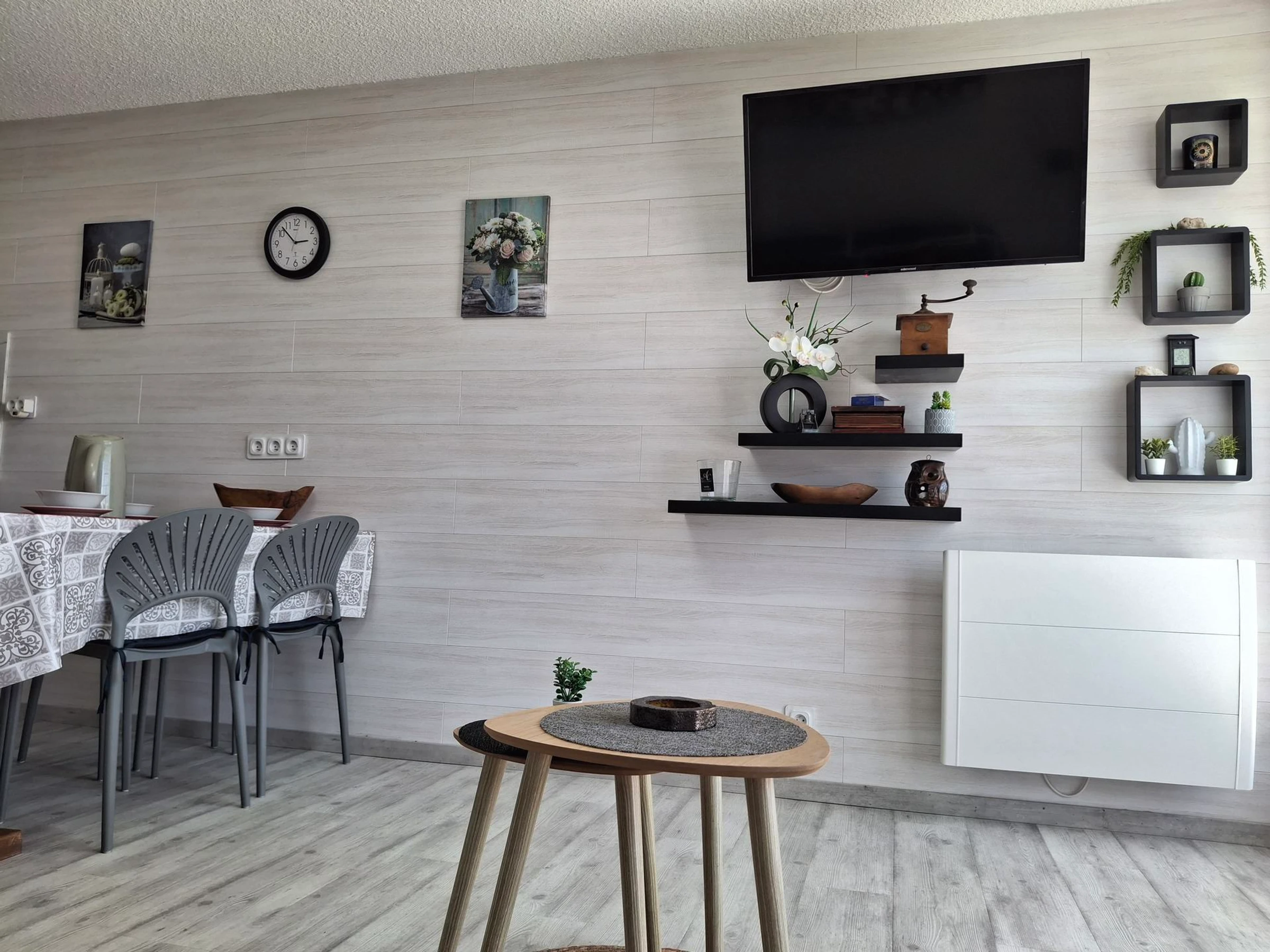 - Wohnzimmer mit 140 cm breitem Schlafsofa und wandmontiertem Flachbildfernseher.