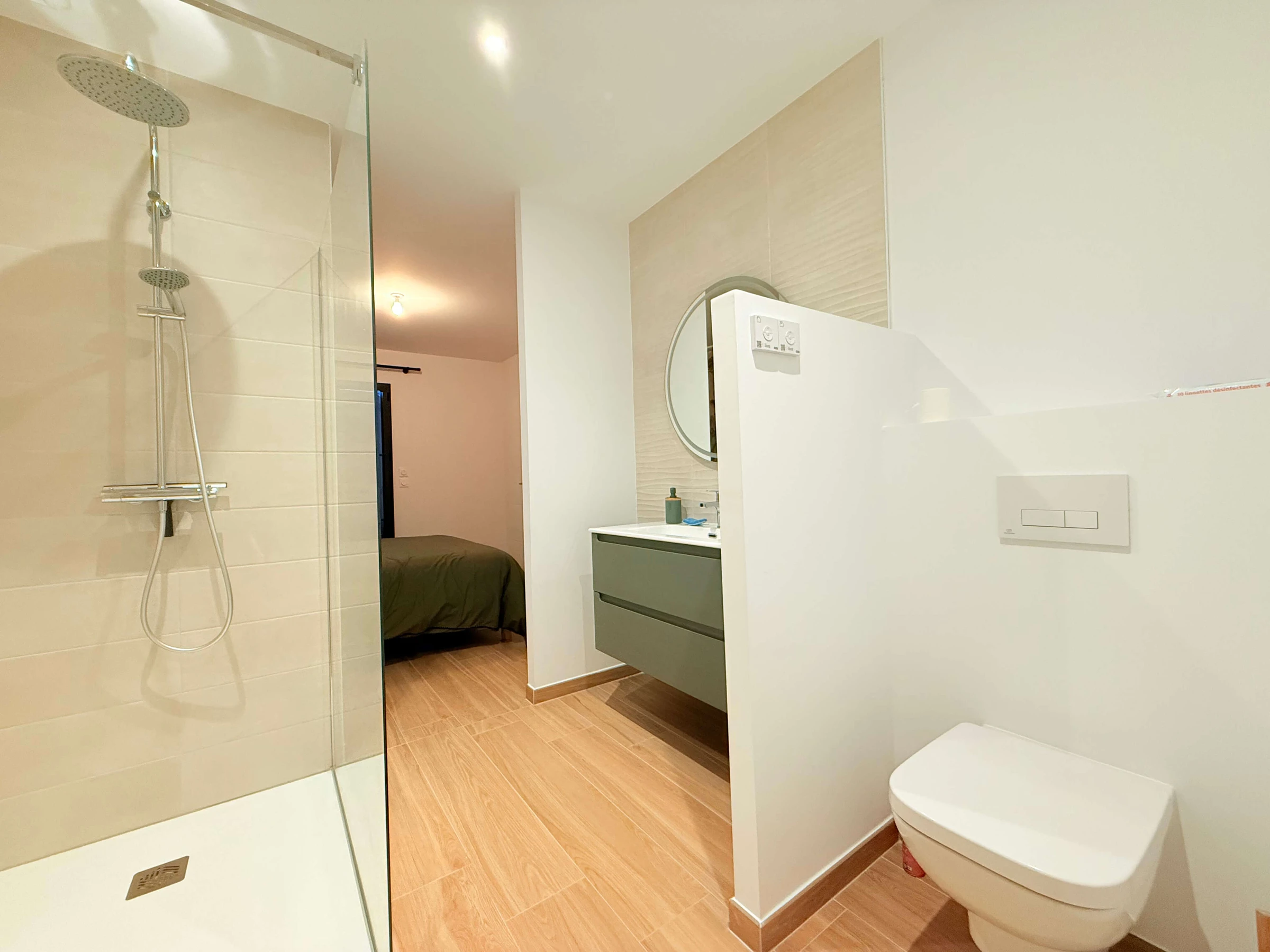 Das Haus verfügt über 3 Schlafzimmer: zwei mit Doppelbetten (160 cm) und eines mit zwei Einzelbetten (80 cm), darunter eine Master-Suite mit eigenem Bad und WC.