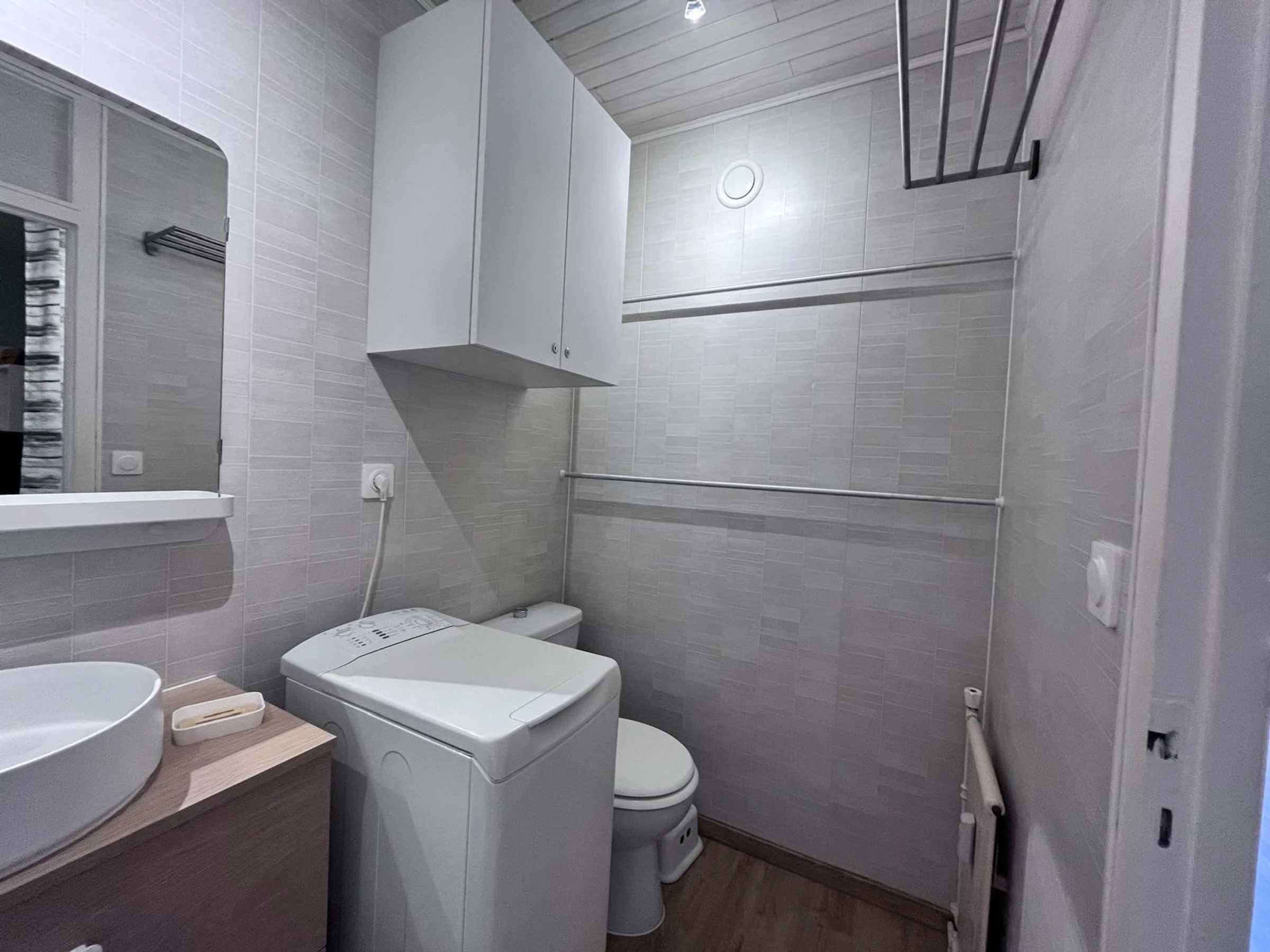 - Badezimmer mit Dusche, Waschbecken, Waschmaschine und WC.