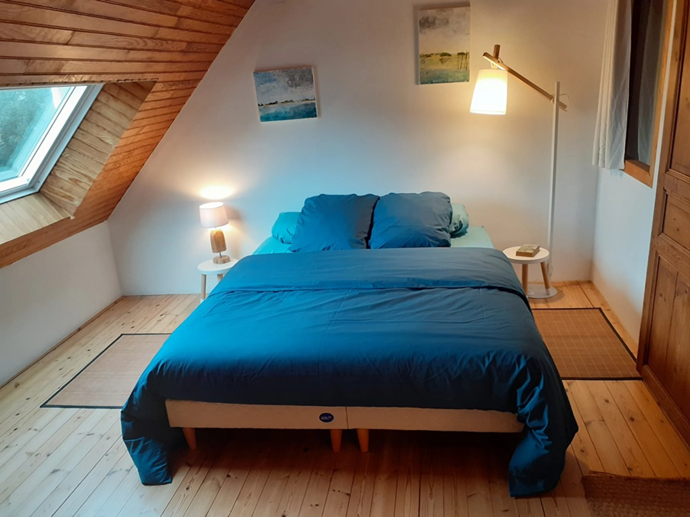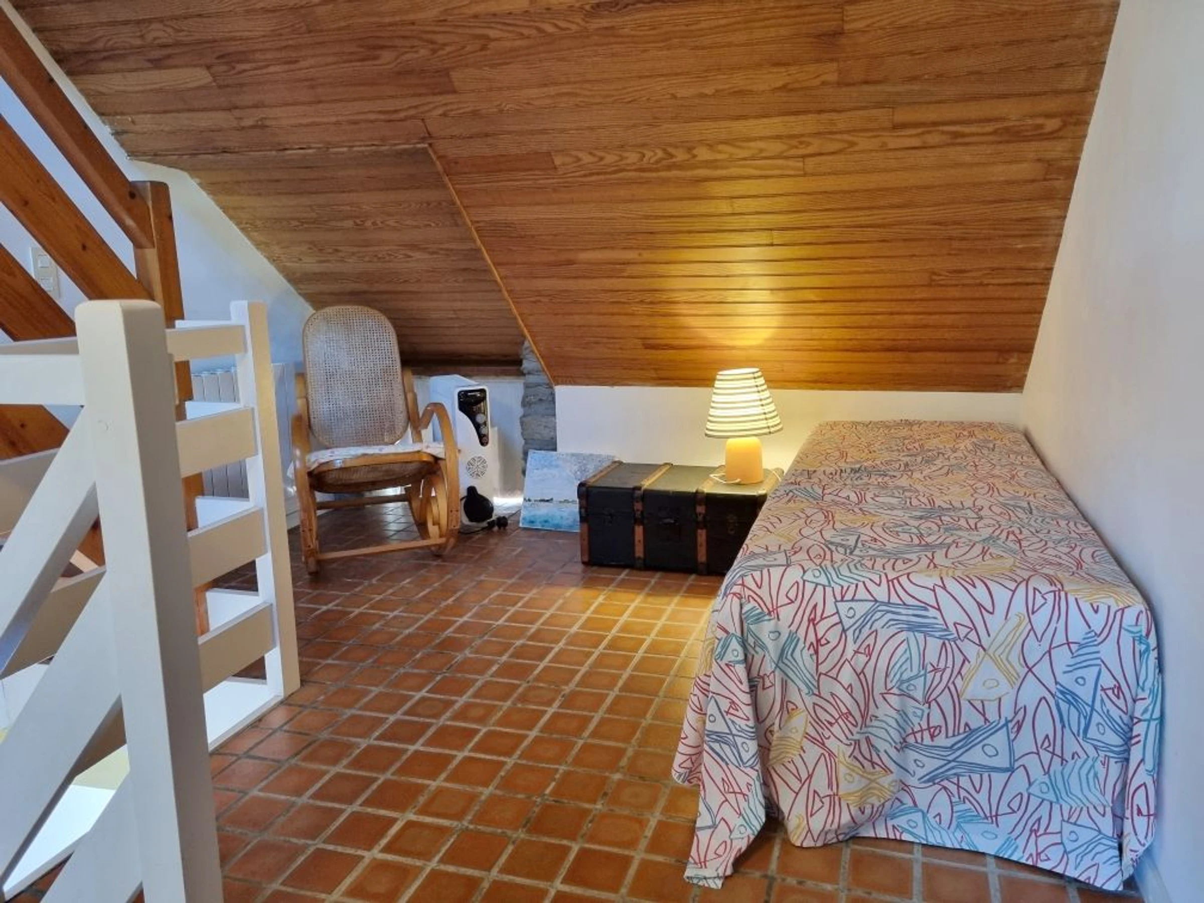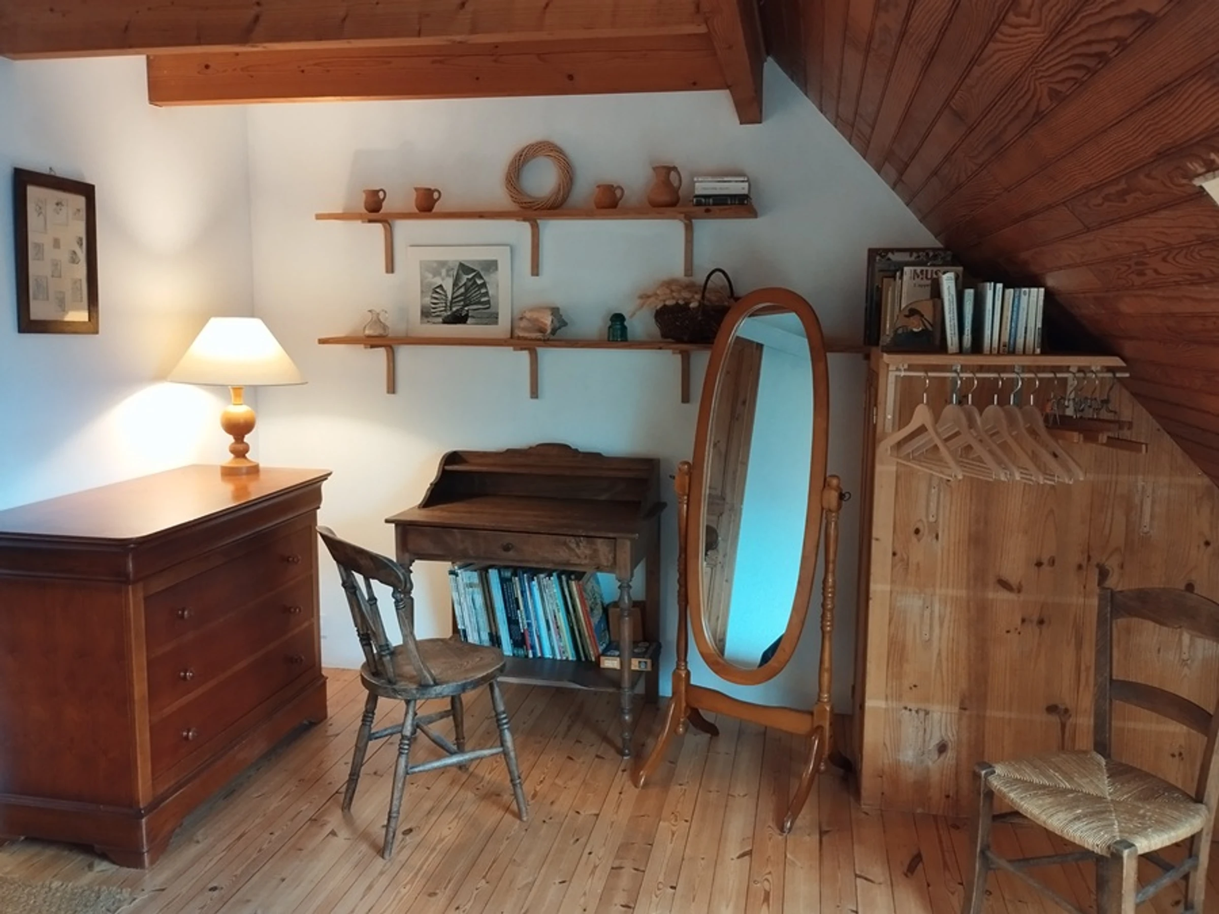 Im zweiten Stock befindet sich im ausgebauten Dachgeschoss (niedrige Decke) ein zweites Schlafzimmer mit zwei Einzelbetten (90 cm), die sich für Kinder eignen, und einer Kommode. Dieser Raum ist nicht durch eine Tür abgetrennt.