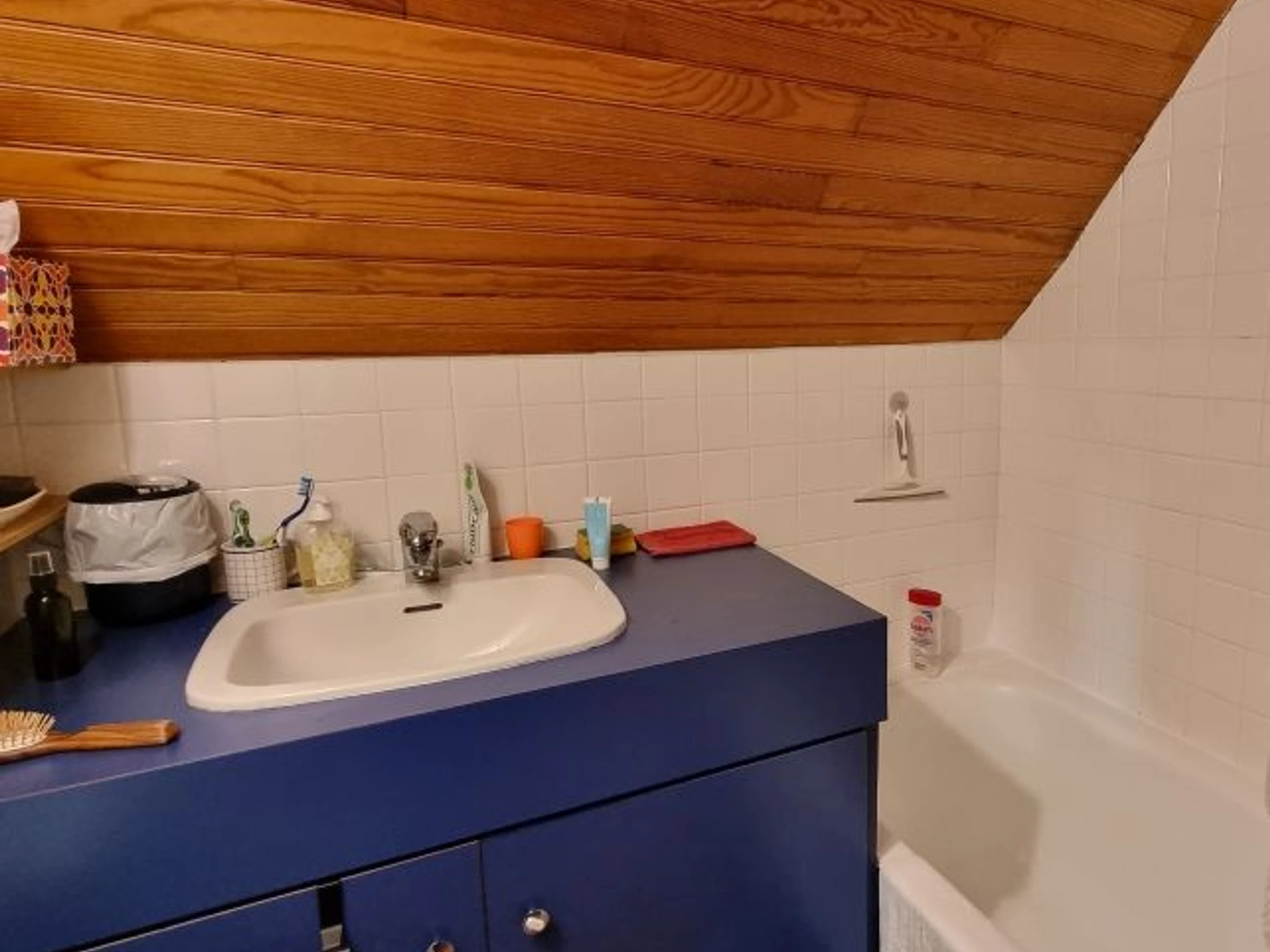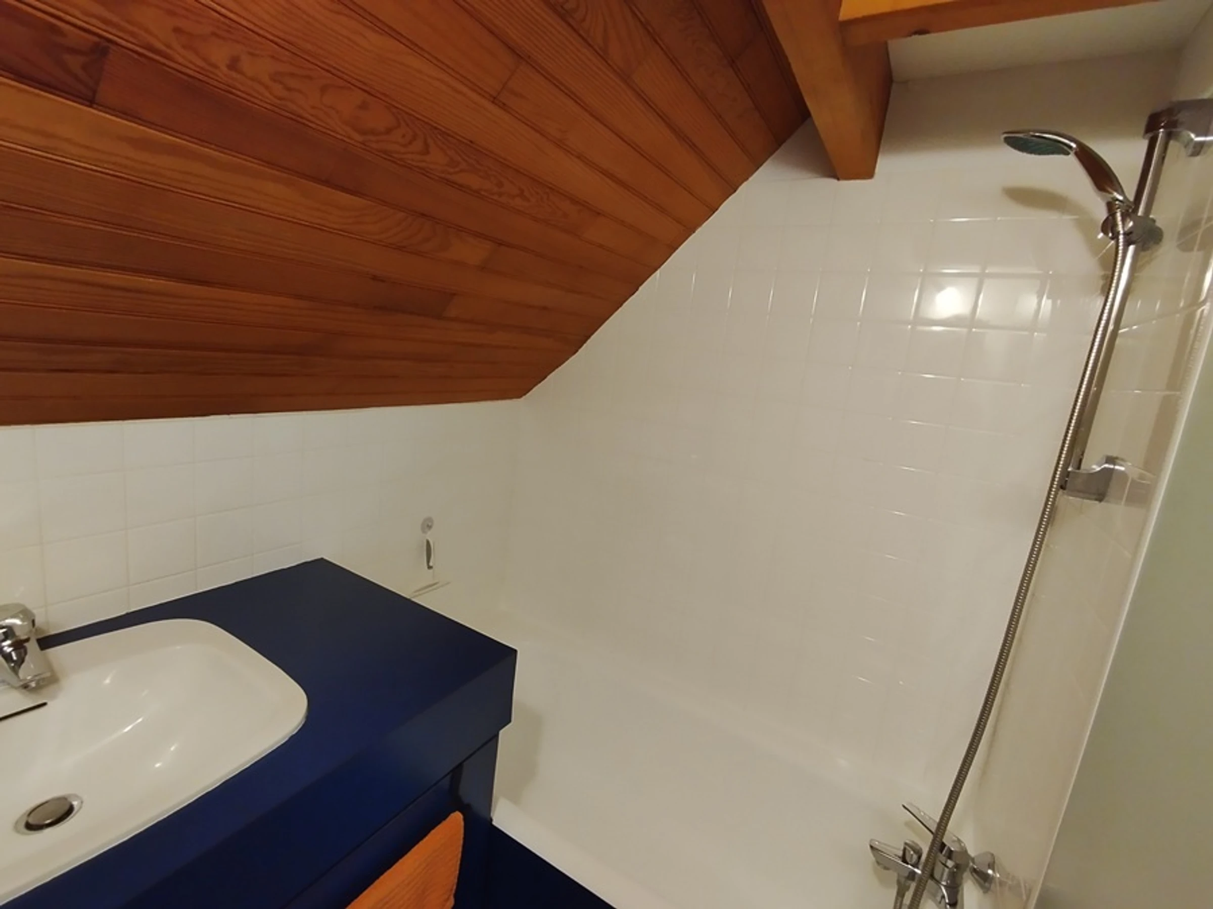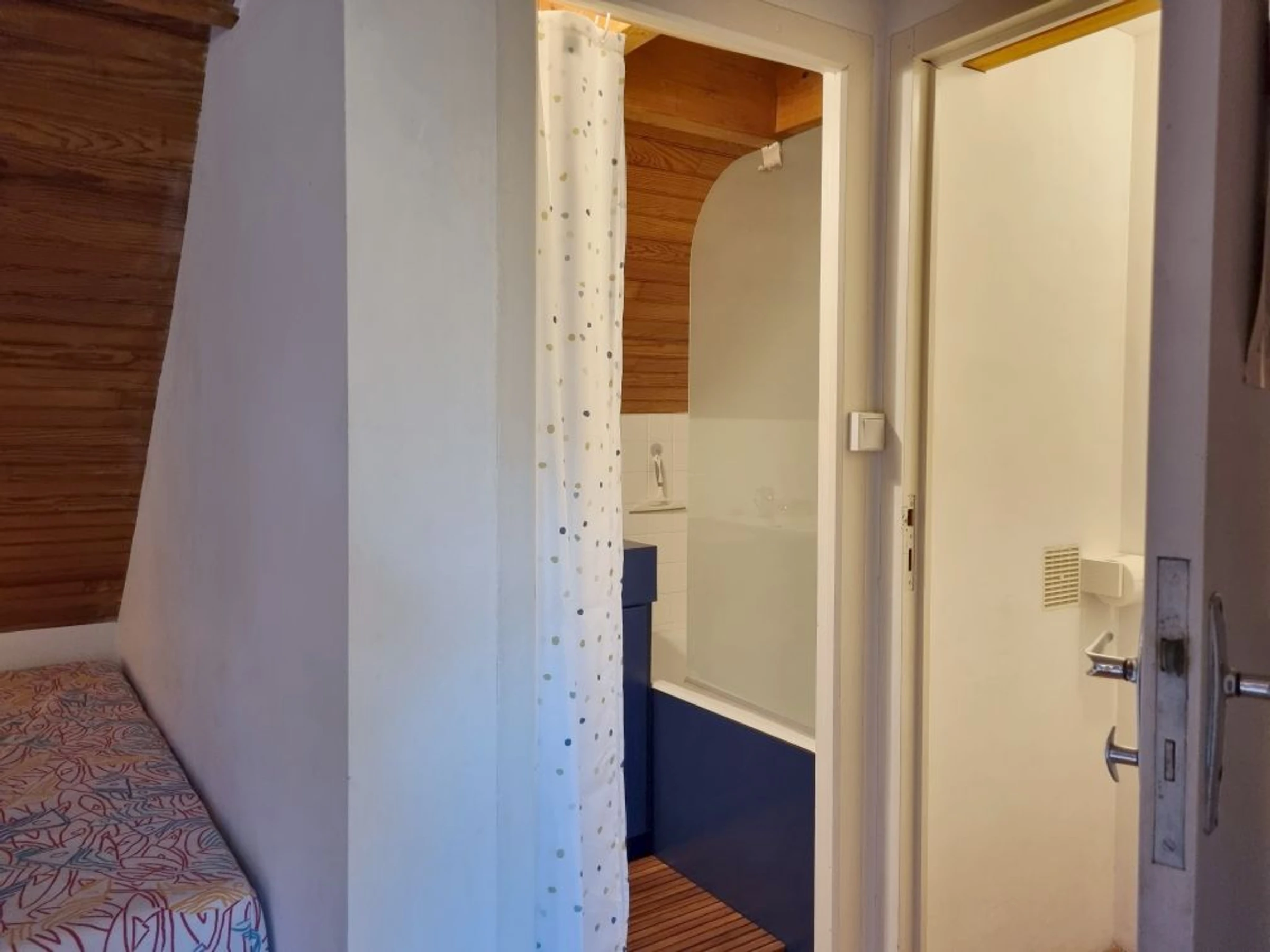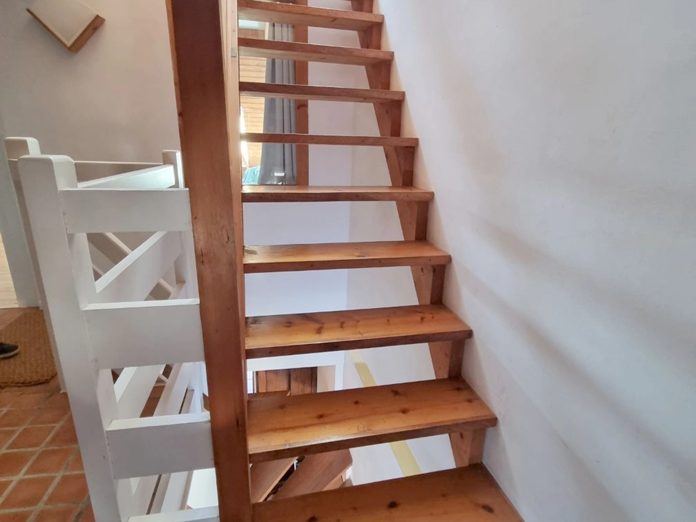 Im zweiten Stock befindet sich im ausgebauten Dachgeschoss (niedrige Decke) ein zweites Schlafzimmer mit zwei Einzelbetten (90 cm), die sich für Kinder eignen, und einer Kommode. Dieser Raum ist nicht durch eine Tür abgetrennt.