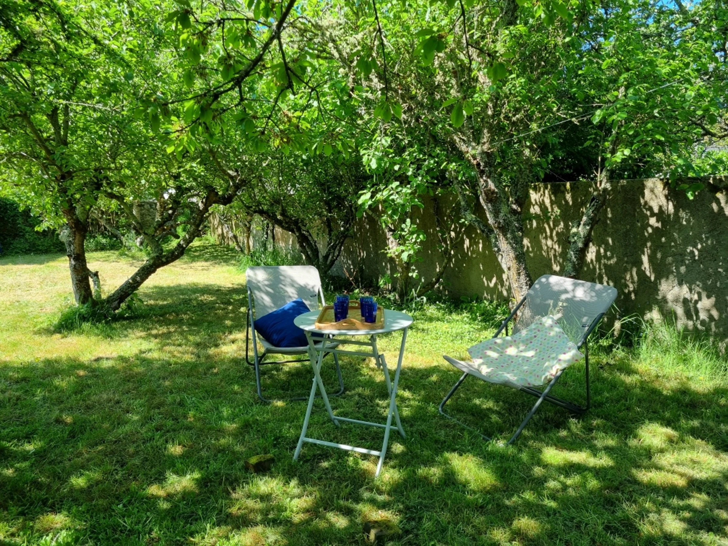 Ein idyllischer, bewaldeter und umzäunter Garten von ca. 250 m² mit Terrasse. Westausrichtung.