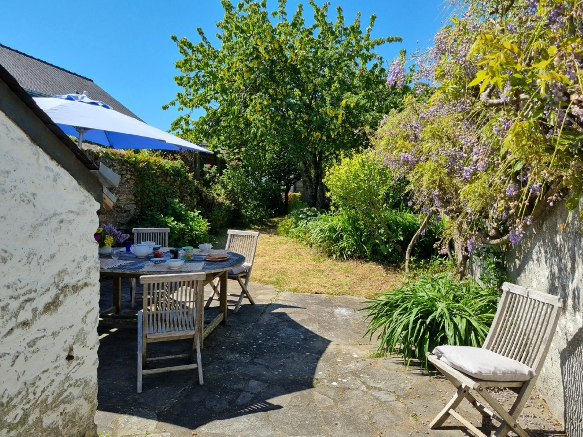 Gartenmöbel sind vorhanden. Für Babys: Kindersicherheitsgitter.