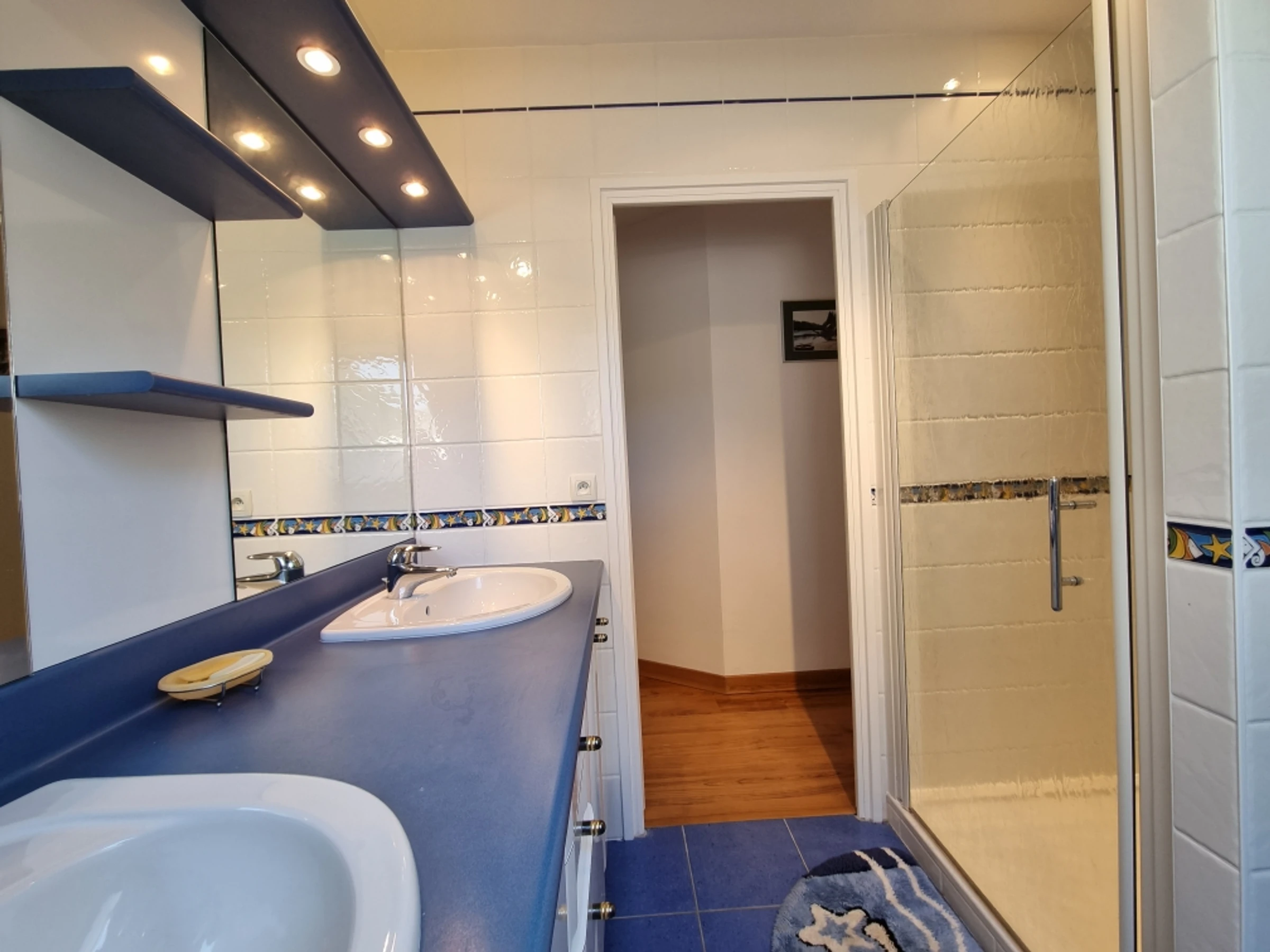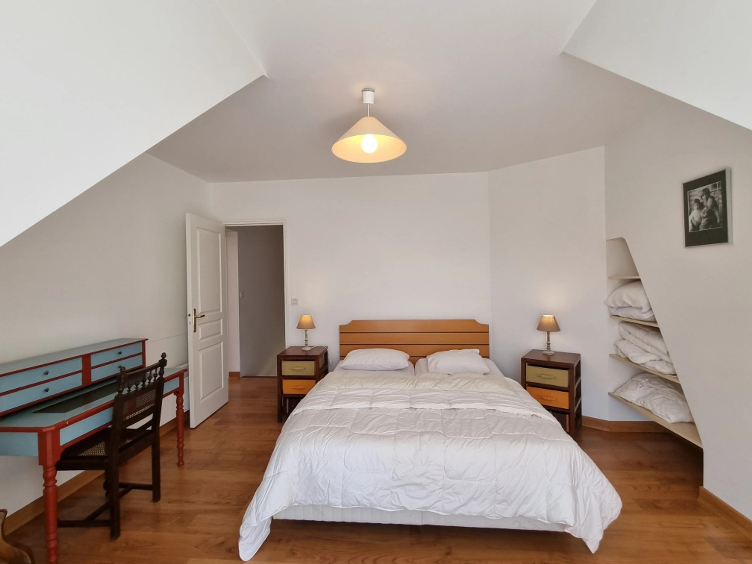 Wunderschönes, komfortables, freistehendes Haus im modernen Stil, Baujahr 2005, ca. 150 m², in ruhiger Wohnlage am Ende einer Sackgasse, nur wenige Gehminuten vom Dorf Saint-Gildas-de-Rhuys und seinen Geschäften entfernt. Der Küstenwanderweg Grand Mont mit seinen Klippen und dem atemberaubenden Blick auf die Inseln Houat, Hoëdic, Belle-Île-en-Mer und die Halbinsel Quiberon mit ihren Buchten und kristallklarem Wasser ist nur 700 m entfernt. Das Haus bietet im Erdgeschoss: eine Eingangshalle mit Garderobe, einen großen, 60 m² großen offenen Wohn-/Essbereich mit Kamin und Fernseher, ein zweites kleines Wohnzimmer mit Rattanmöbeln sowie eine offene Küche (Geschirrspüler, Kombi-Backofen/Mikrowelle, Vier-Platten-Cerankochfeld, Filterkaffeemaschine und Nespresso-Kapselmaschine). Hauswirtschaftsraum (Kühlschrank mit Gefrierfach, Wäschetrockner und Waschmaschine), WC mit Waschbecken, Abstellraum (Kleiderschrank und Regale). Hauptschlafzimmer mit einem Queensize-Bett (160 cm) (zwei Einzelmatratzen, 80 cm) und eigenem Duschbad mit Abstellraum (Regale und Kleiderschrank).