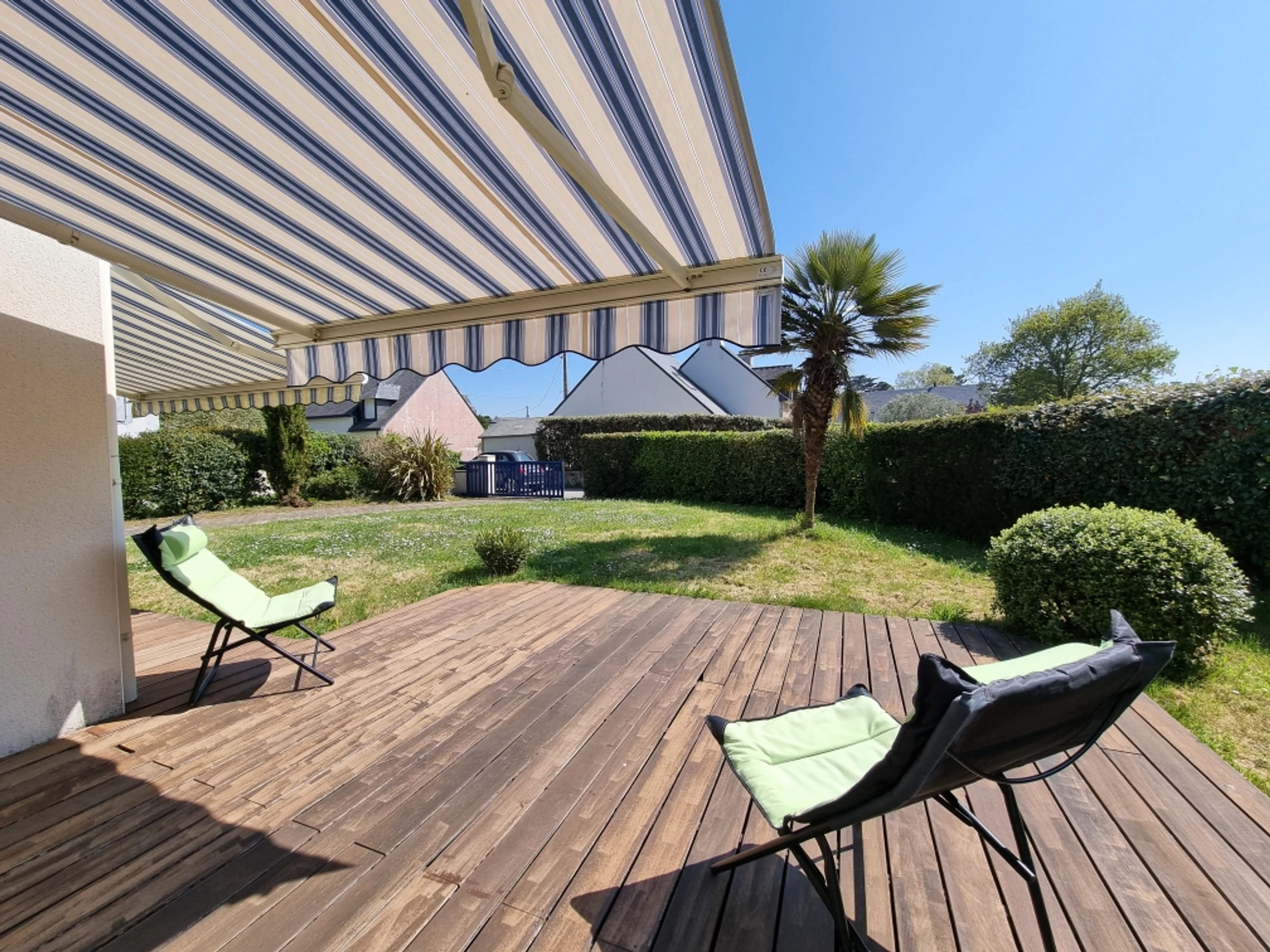 Eingezäunter Garten (teilweise von Hecken umgeben) von ca. 500 m², große Holzterrasse mit zwei Markisen, Südlage. Gartenmöbel. Überdachte Terrasse. Parkplatz.